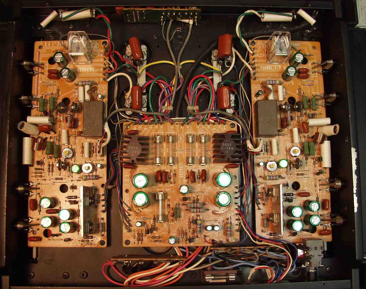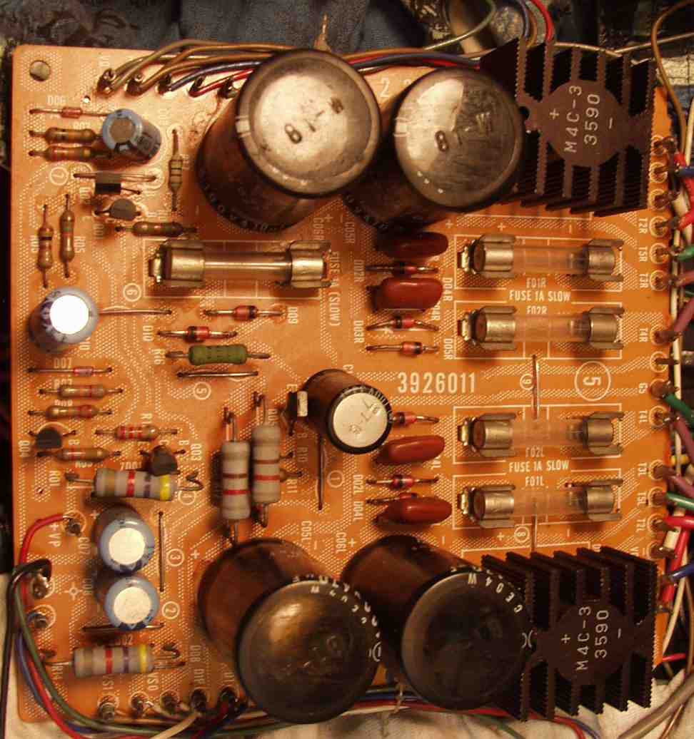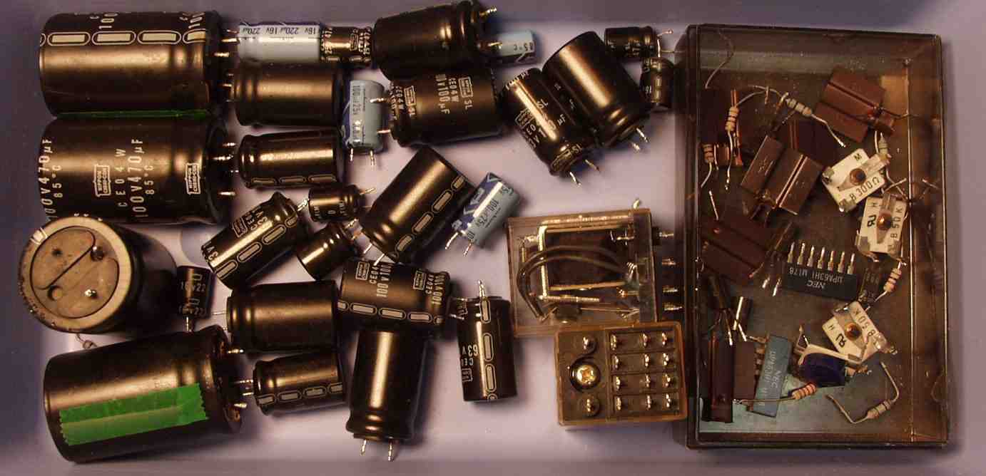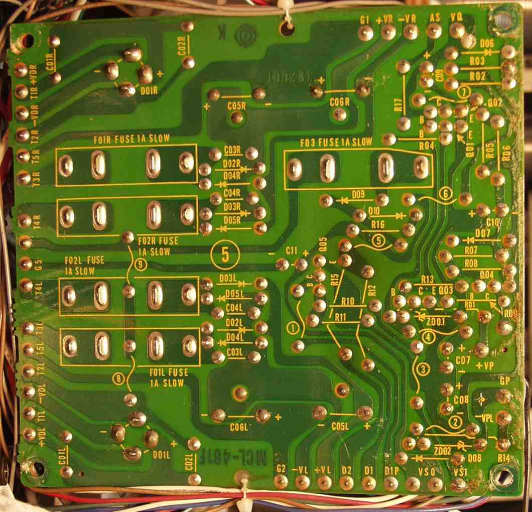 | C6. 修理後 L側基板 初段FET(電界効果トランジスター)、バランス・バイアス調整用半固定VR、SP接続リレー交換、フューズ入り抵抗全部交換、電解コンデンサー全部交換 |