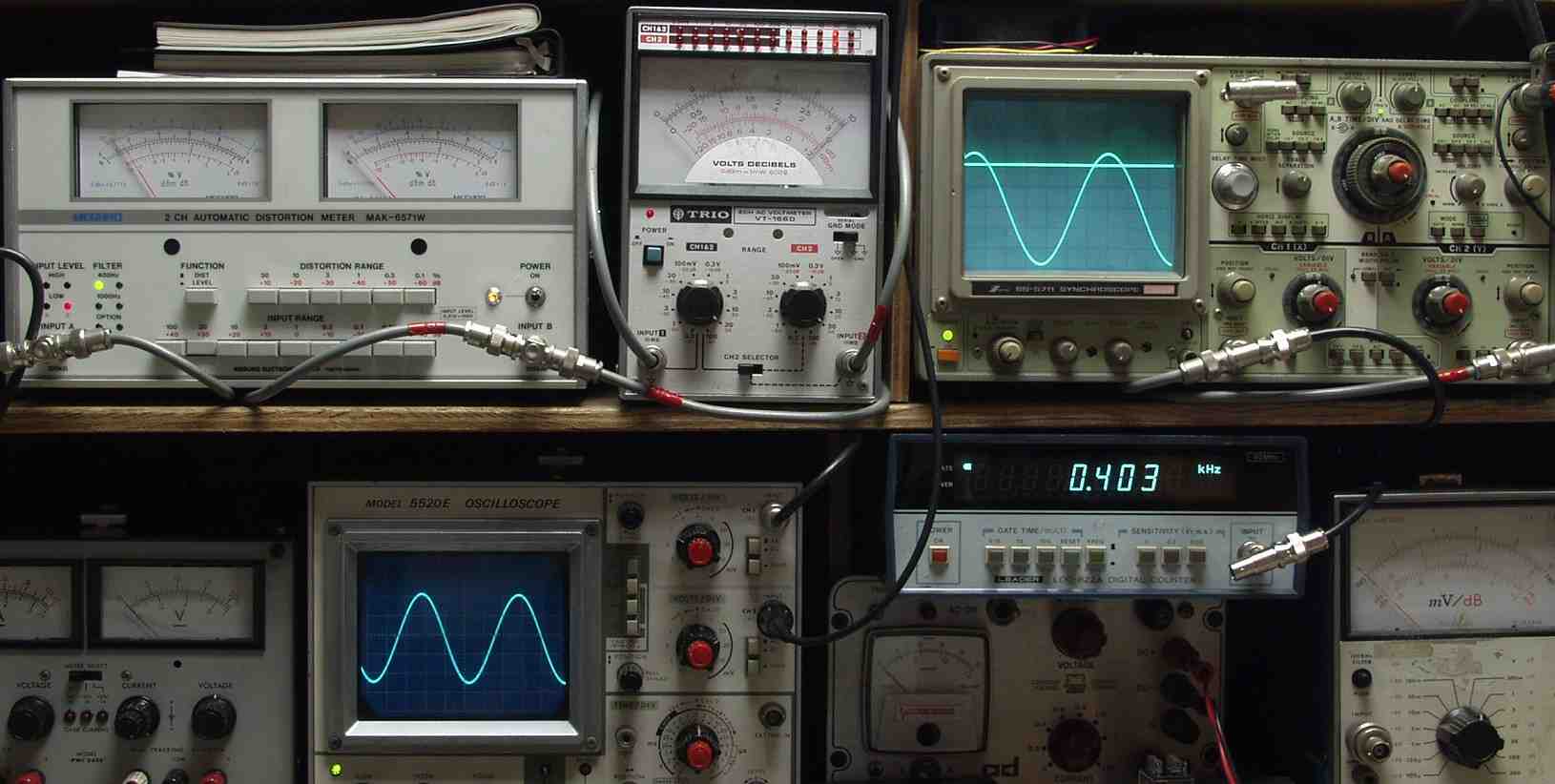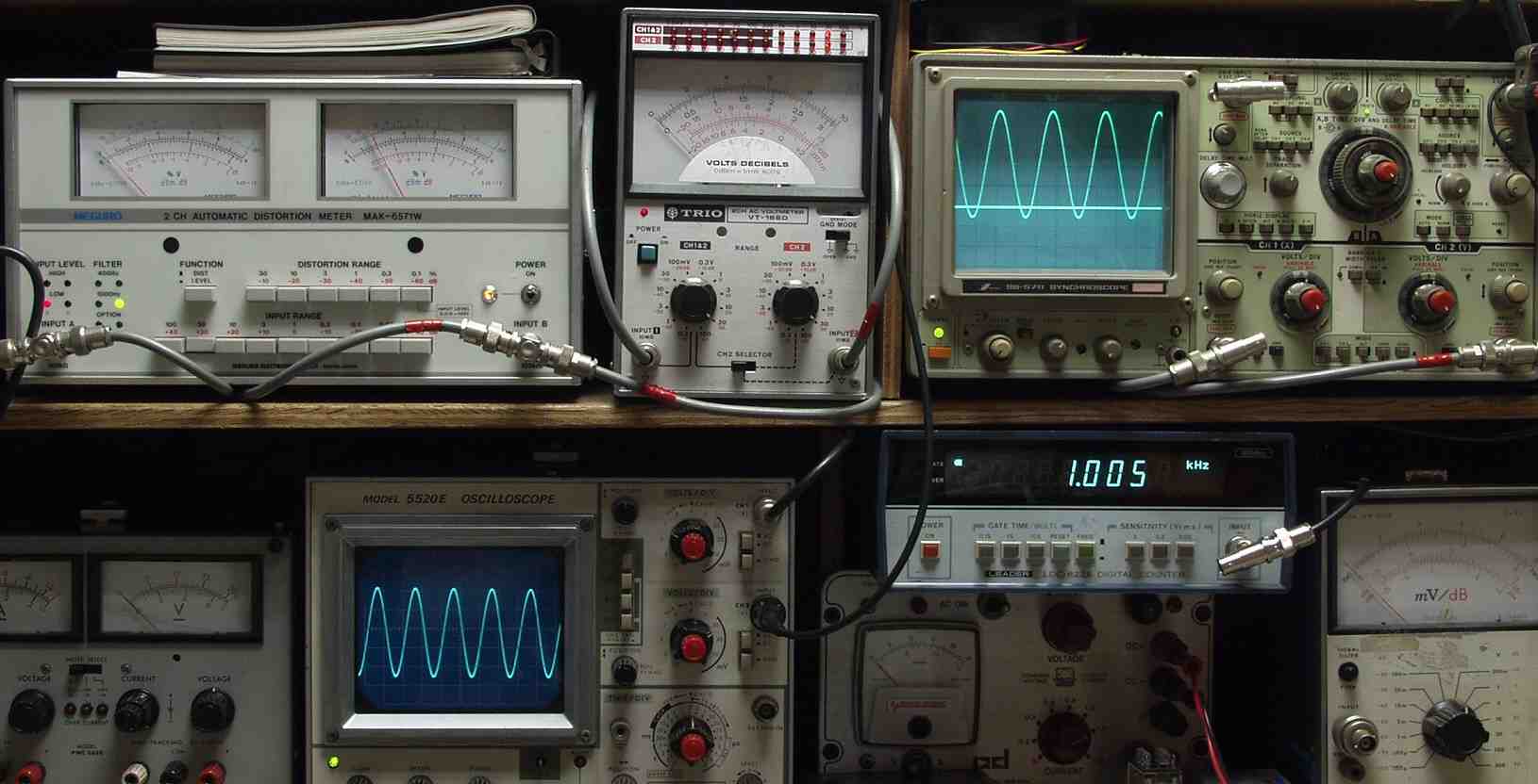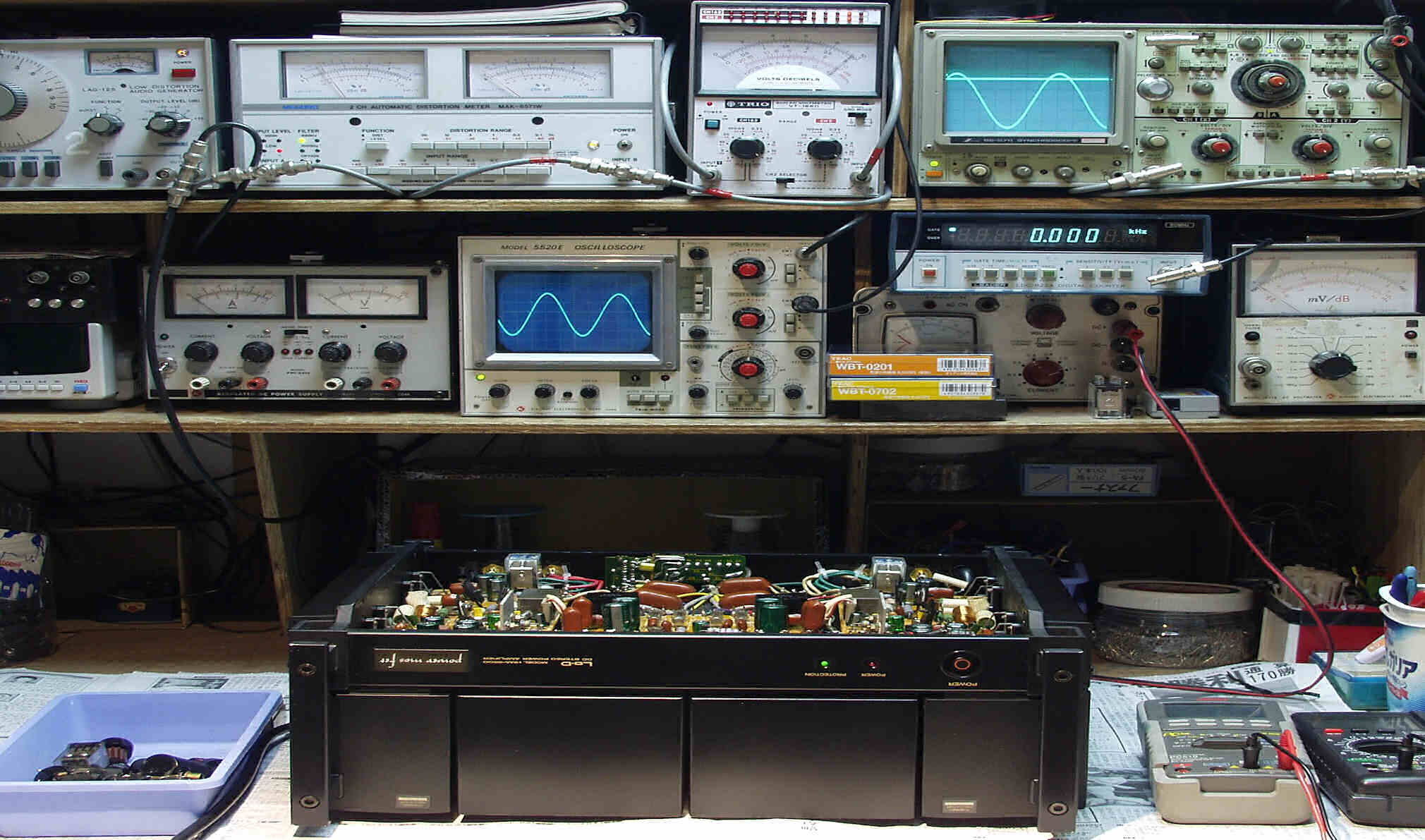 | E. 調整・測定 E1. 出力・歪み率測定・調整 <見方> 下左オーディオ発振器より400HZ・1KHZの信号を出す(歪み率=約0.003%) 下中=入力波形(オーディオ発振器のTTLレベル) 下右=周波数計 上左=SP出力の歪み率測定 左メータ=L出力、右メータ=R出力 上中=SP出力電圧測定器、赤針=R出力、黒針=L出力 上右=SP出力波形オシロ 上=R出力、下=L出力(出力電圧測定器の出力) |