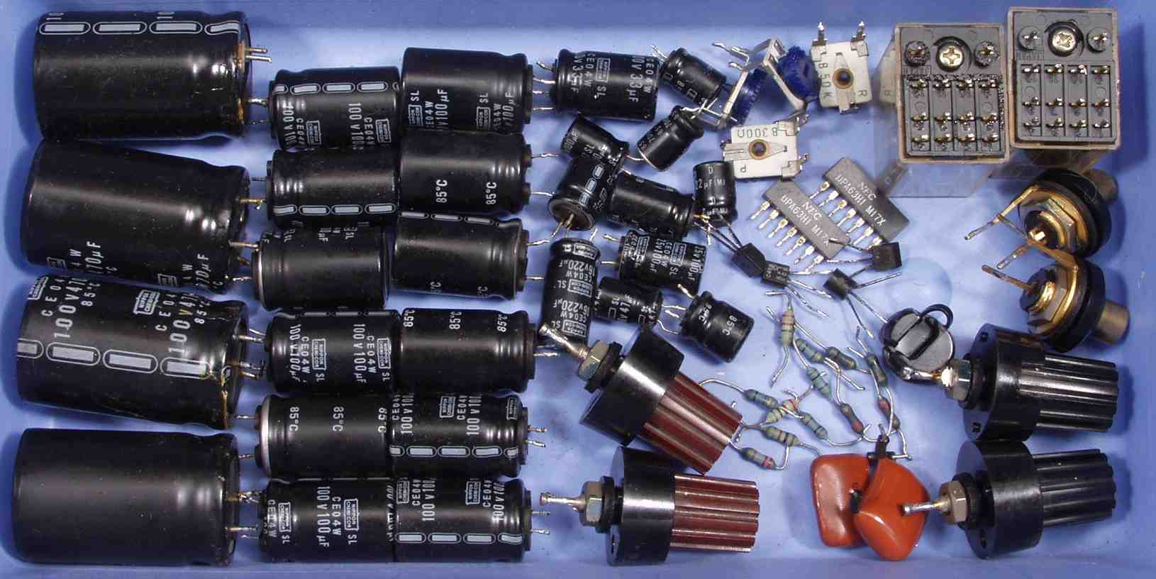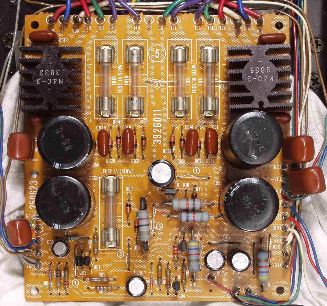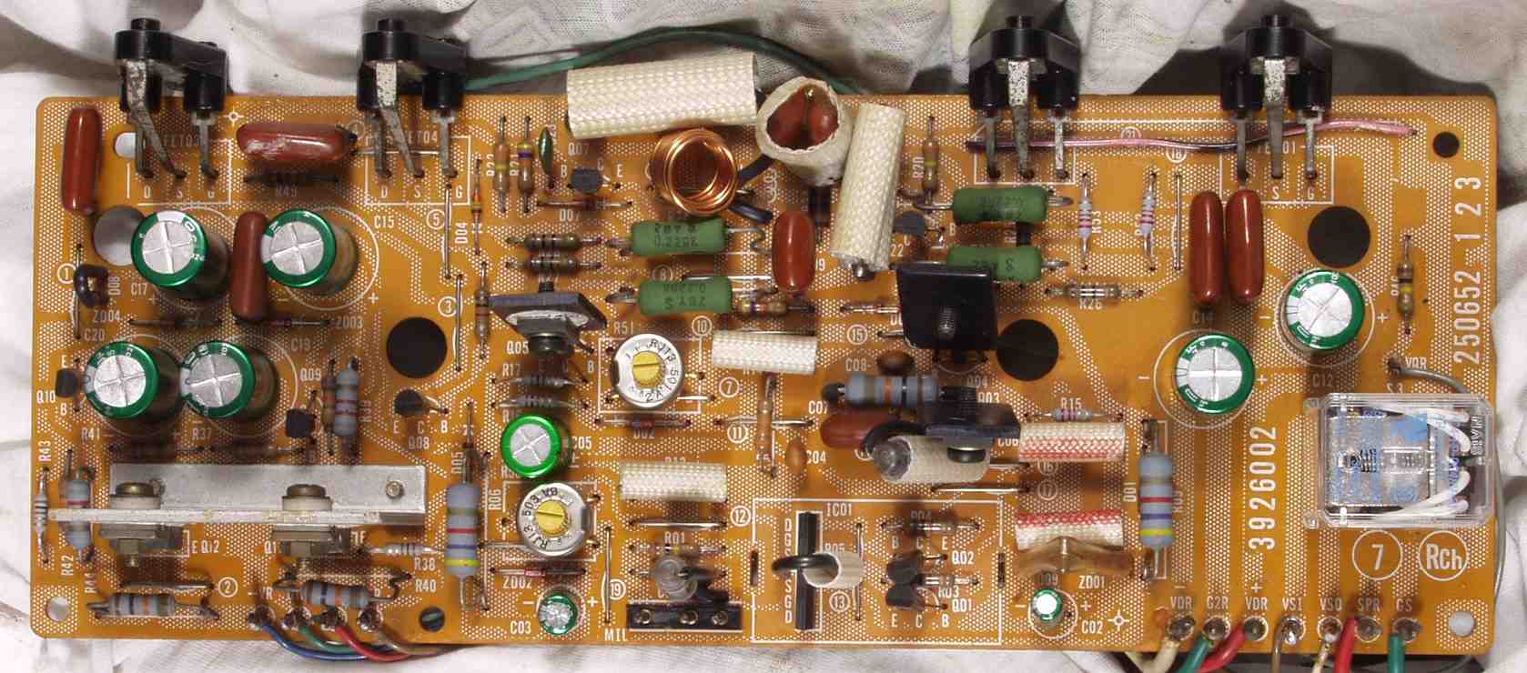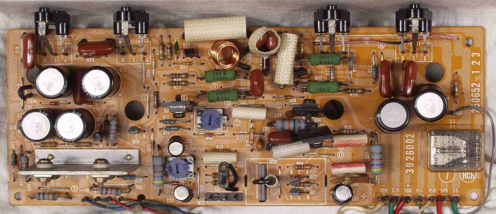 | C1B. 修理後 Rドライブ基板 初段FET(電界効果トランジスター)、バランス/バイアス調整用半固定VR2個、SP接続リレー交換 フューズ入り抵抗も全部交換 全電解コンデンサー9個、TR(トランジスター)2個交換 |