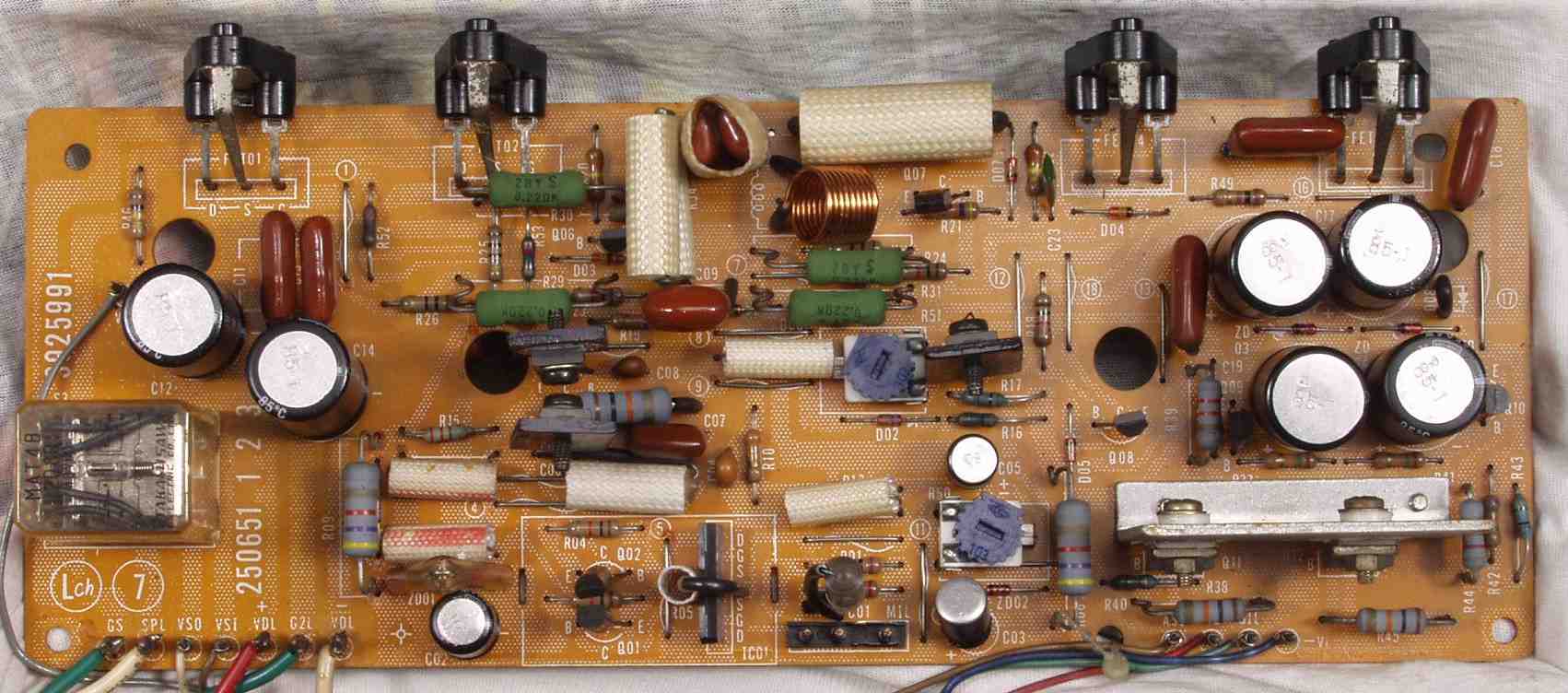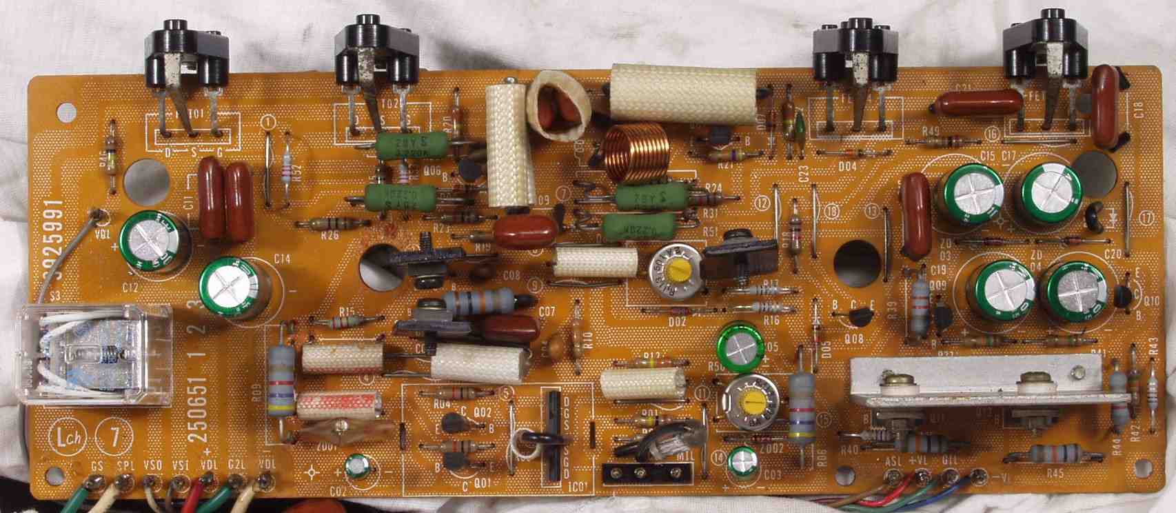 | C2B. 修理後 Lドライブ基板 初段FET(電界効果トランジスター)、バランス/バイアス調整用半固定VR2個、SP接続リレー交換 フューズ入り抵抗も全部交換 全電解コンデンサー9個、TR(トランジスター)2個交換 |