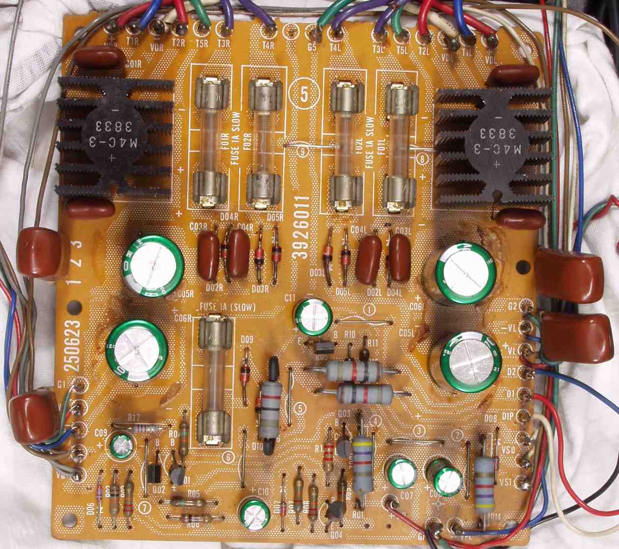 | C4B. 修理後 電源基盤 電解コンデンサー9個、フューズ入り抵抗交換 |