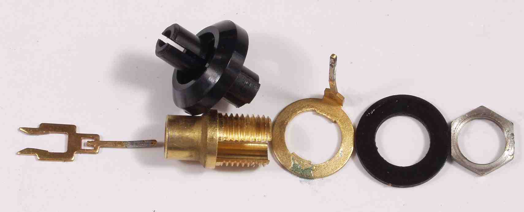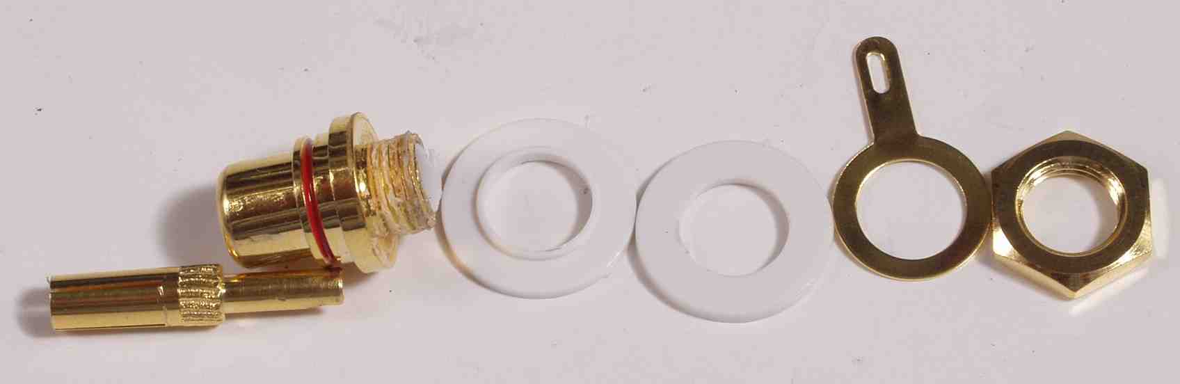 | C5A3. 修理中 WBTはバラせないので、よく使うテフロン絶縁のRCA端子を解体する、芯のピンは4つ割で4点で接触 |