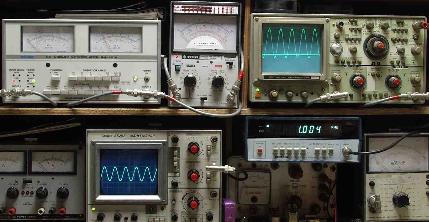 | E. 調整・測定 E1. 出力/歪み率測定・調整 <見方> 上左オーディオ発振器より400HZ・1KHZの信号を出す(歪み率=約0.003%) 下中=入力波形(オーディオ発振器のTTLレベル) 下右=周波数計 上左=SP出力の歪み率測定 左メータ=L出力、右メータ=R出力 上中=SP出力電圧測定器、赤針=R出力、黒針=L出力 上右=SP出力波形オシロ 上=R出力、下=L出力(出力電圧測定器の出力) |