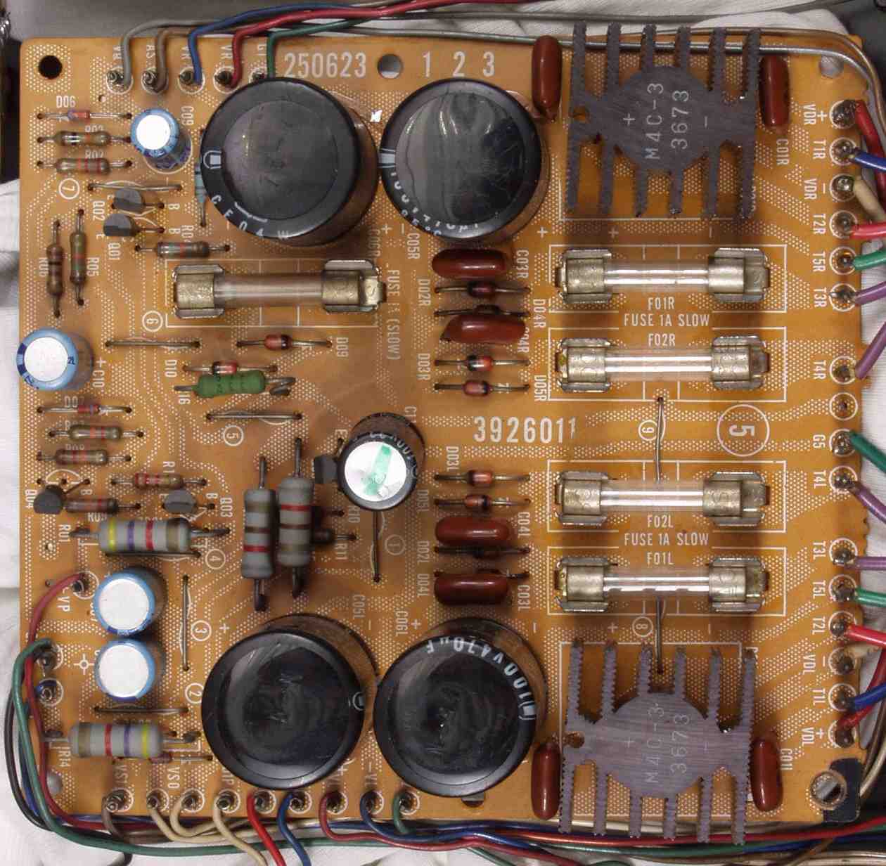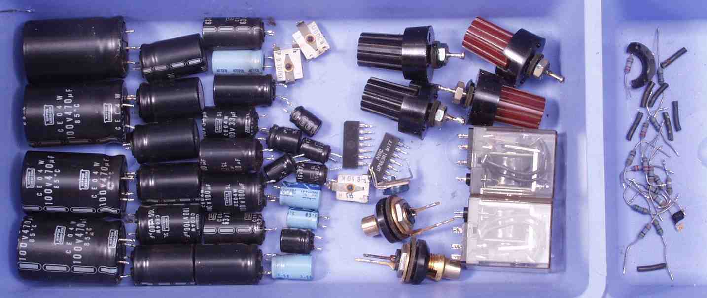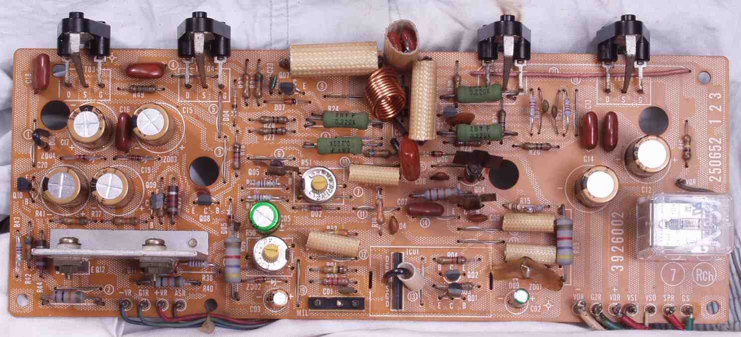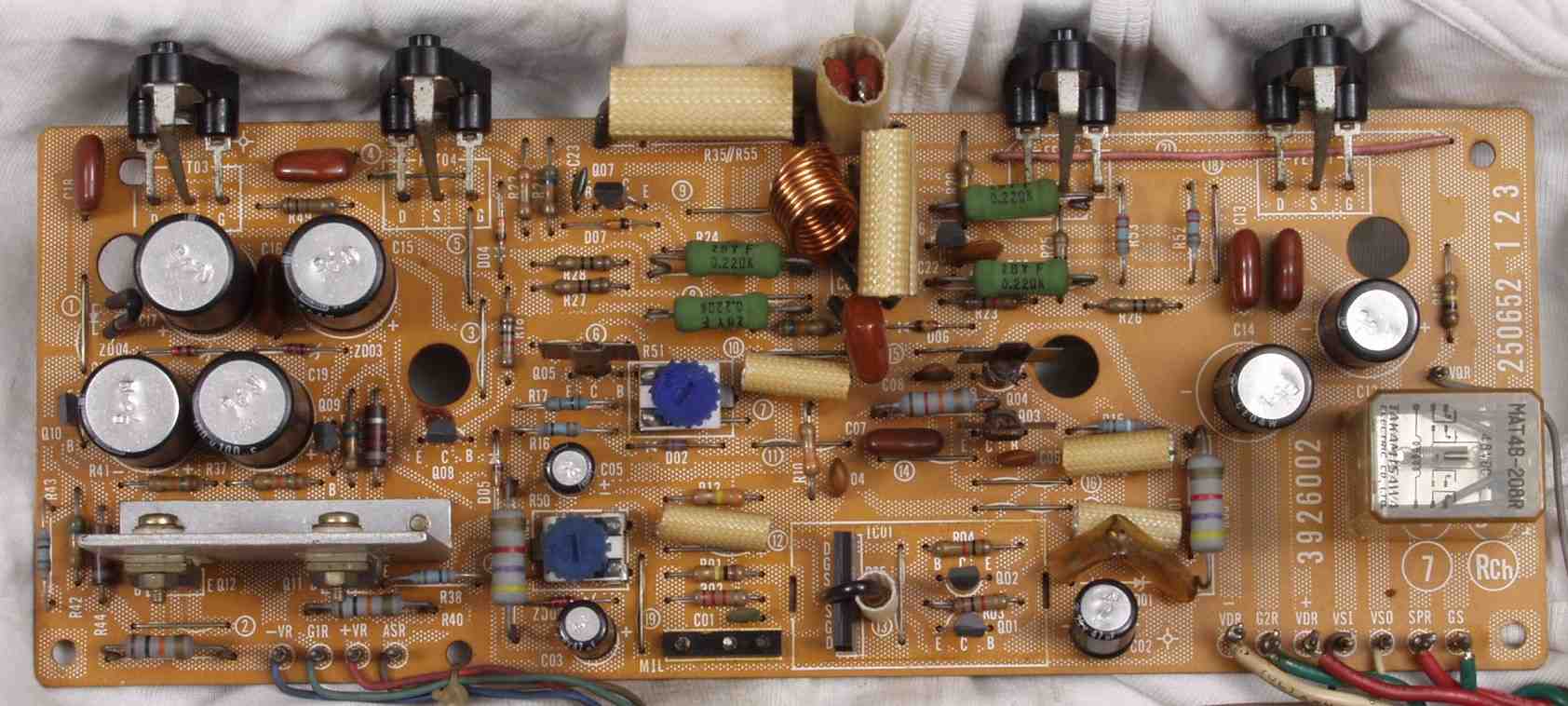 | C1B. 修理後 Rドライブ基板 初段FET(電界効果トランジスター)、バランス/バイアス調整用半固定VR2個、SP接続リレー交換 フューズ入り抵抗も全部交換 全電解コンデンサー9個、TR(トランジスター)2個交換 |