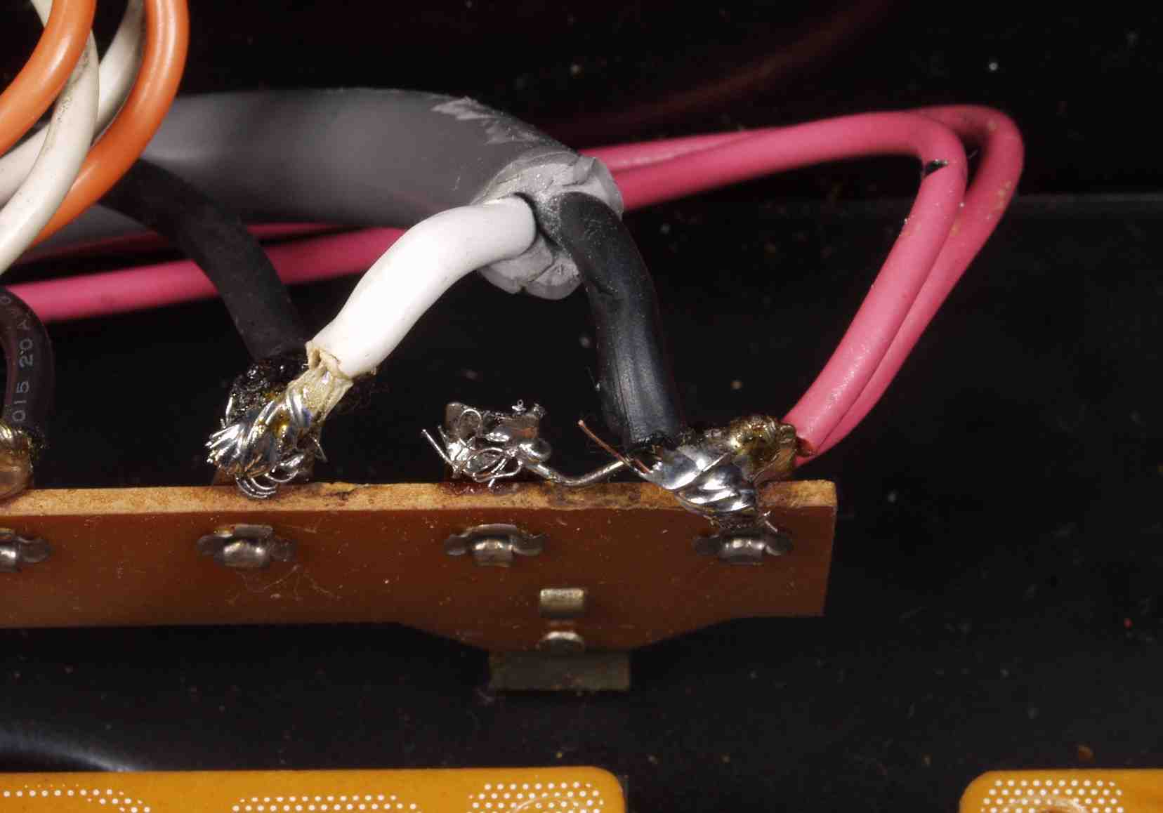 | A2B. 修理前点検中 電源コードのハンダ付け、髭が一杯! |