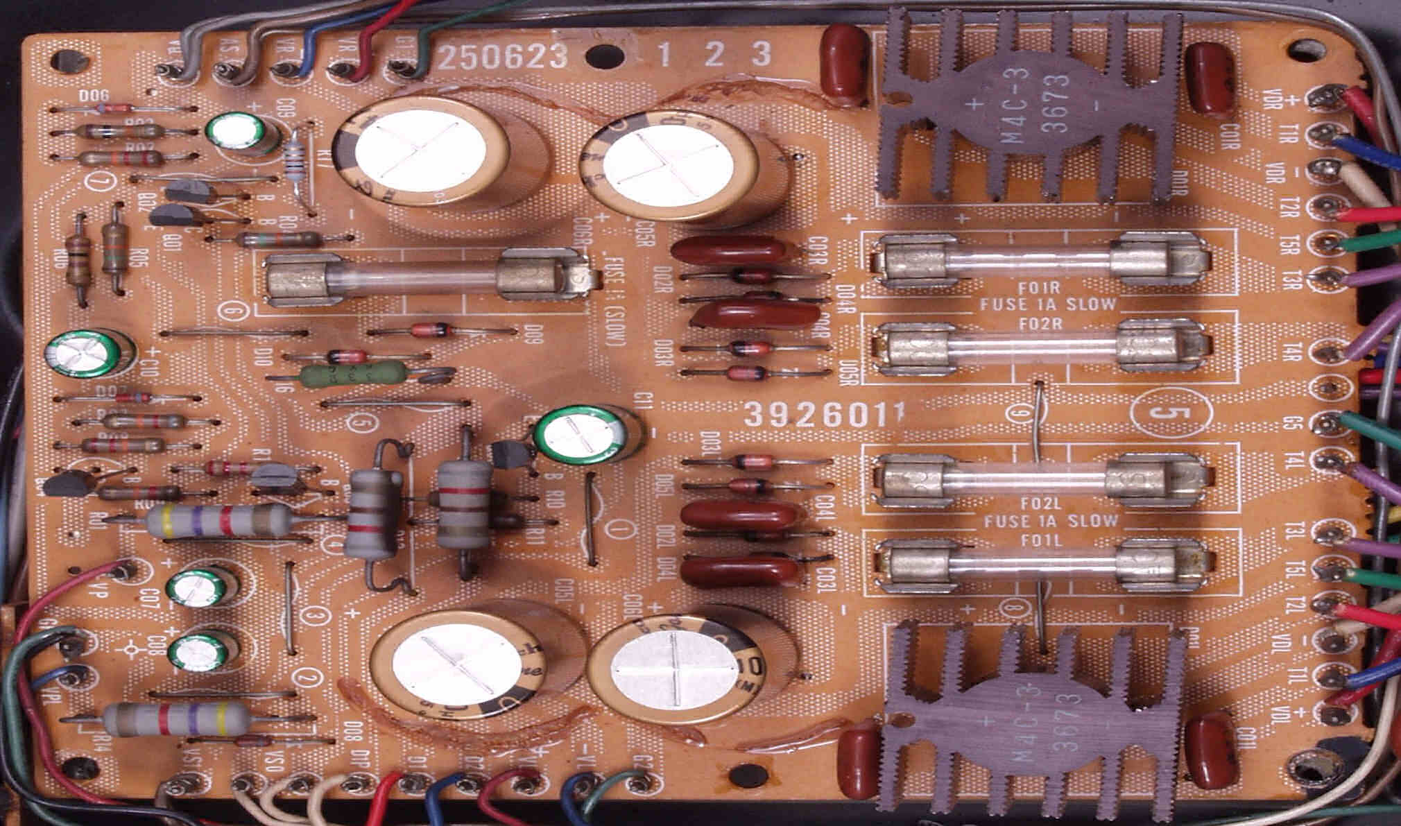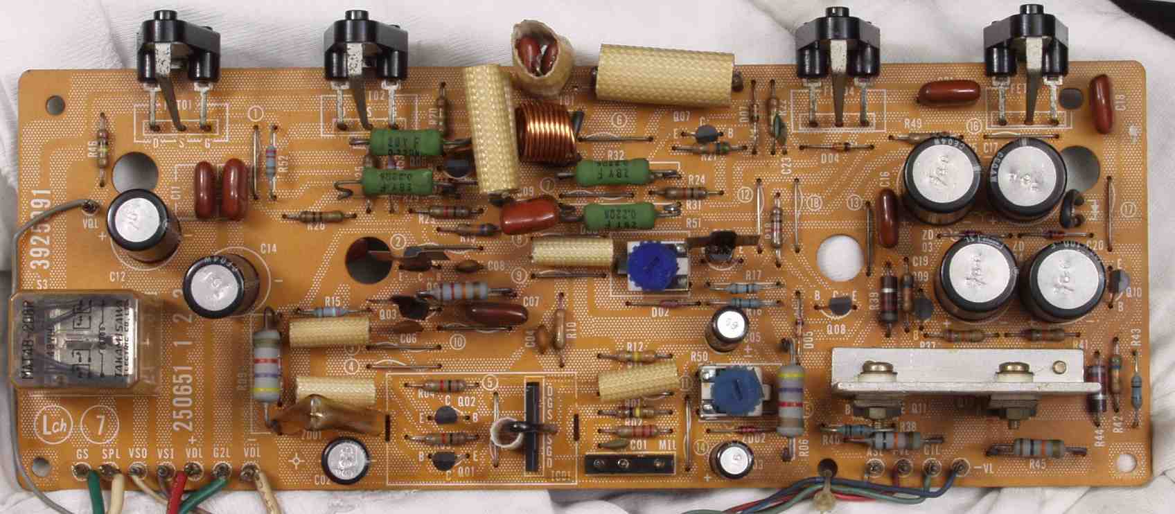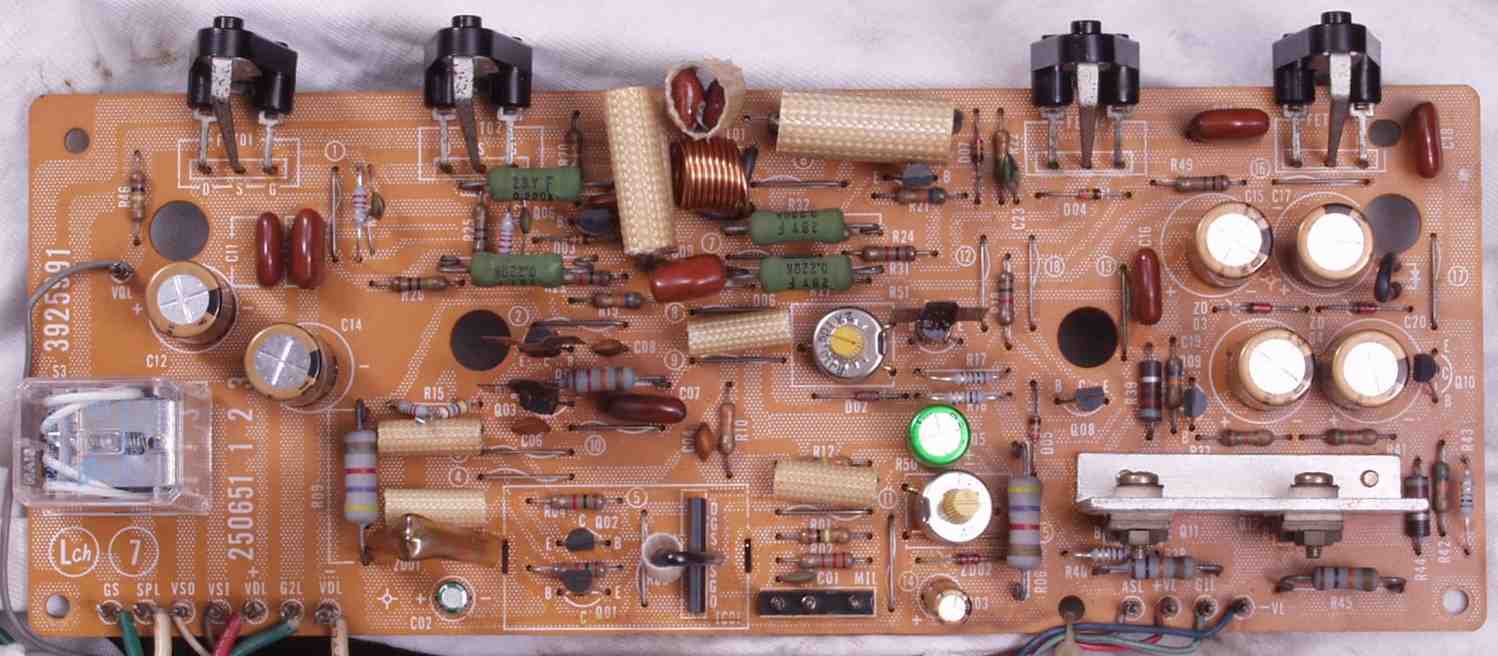 | C2B. 修理後 Lドライブ基板 初段FET(電界効果トランジスター)、バランス/バイアス調整用半固定VR2個、SP接続リレー交換 フューズ入り抵抗も全部交換 全電解コンデンサー9個、TR(トランジスター)2個交換 |