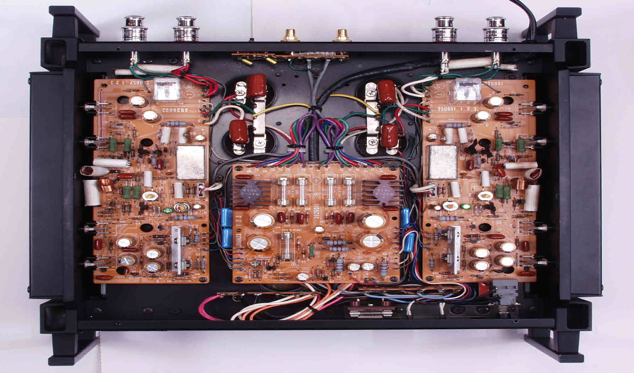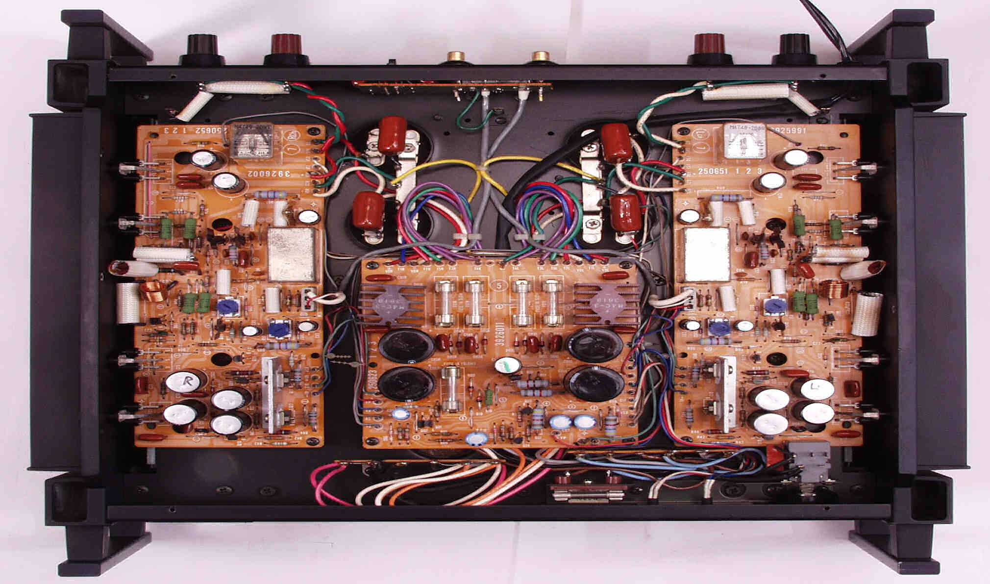 | 注意 このAMPはアースラインが浮いています よって、AMPのシャーシにSPの線(アース側)や入力のRCAプラグのアース側も接続してはいけません RL−SPのアース線も接続(共通)してもいけません 又、DC(directconnection)入力が可能ですが、絶対に使用しないこと=ここ参照 |