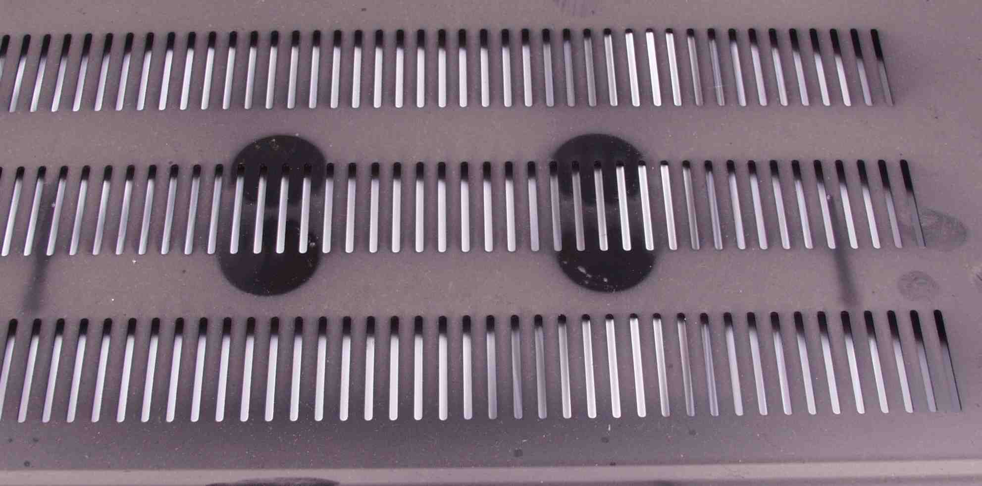 | A2. 修理前見積り点検中 底板に残る電解コンデンサーの当たった跡 |