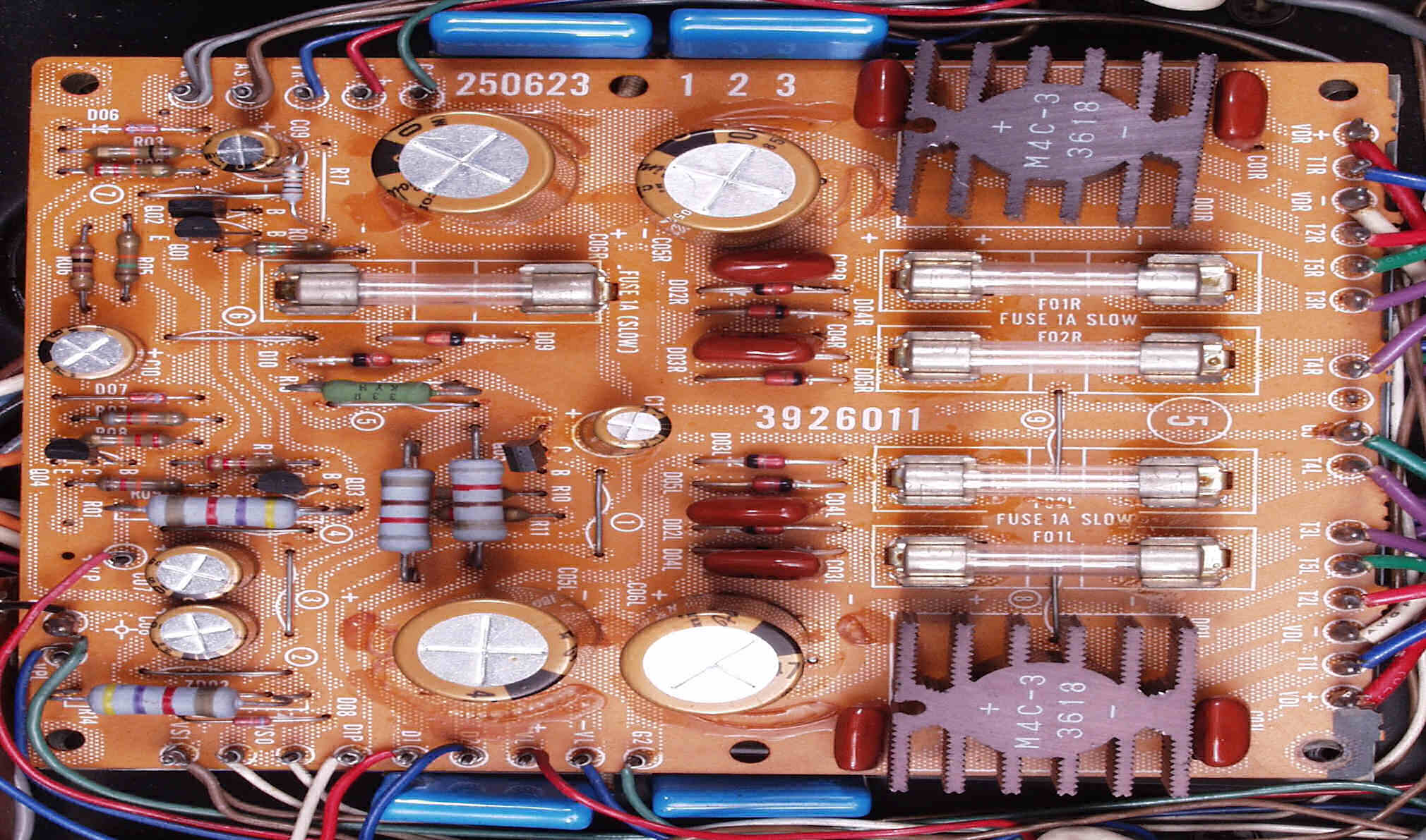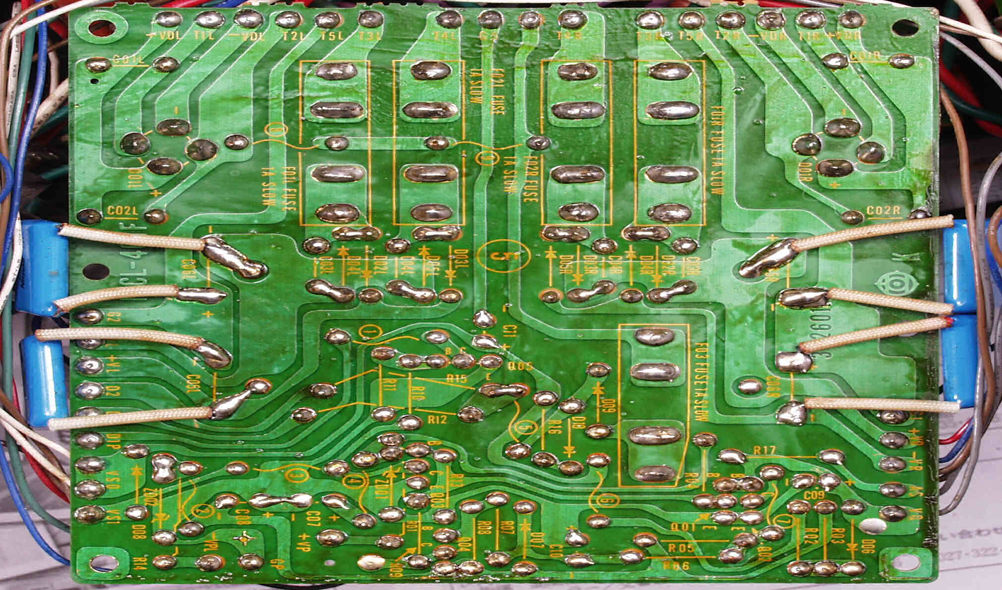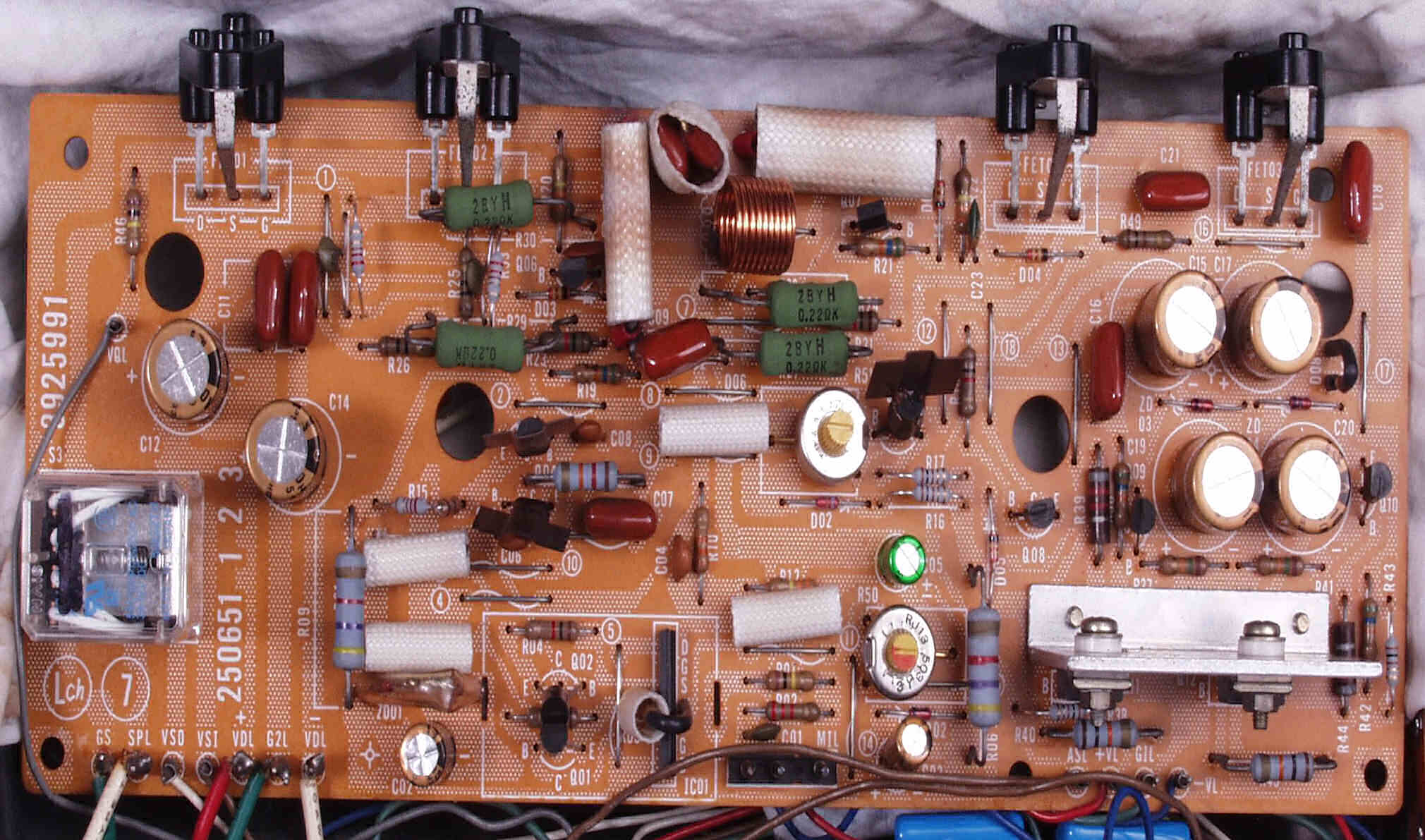 | C2B. 修理後 Lドライブ基板 初段FET(電界効果トランジスター)、バランス/バイアス調整用半固定VR2個、SP接続リレー交換 フューズ入り抵抗も全部交換 電解コンデンサー9個交換 |