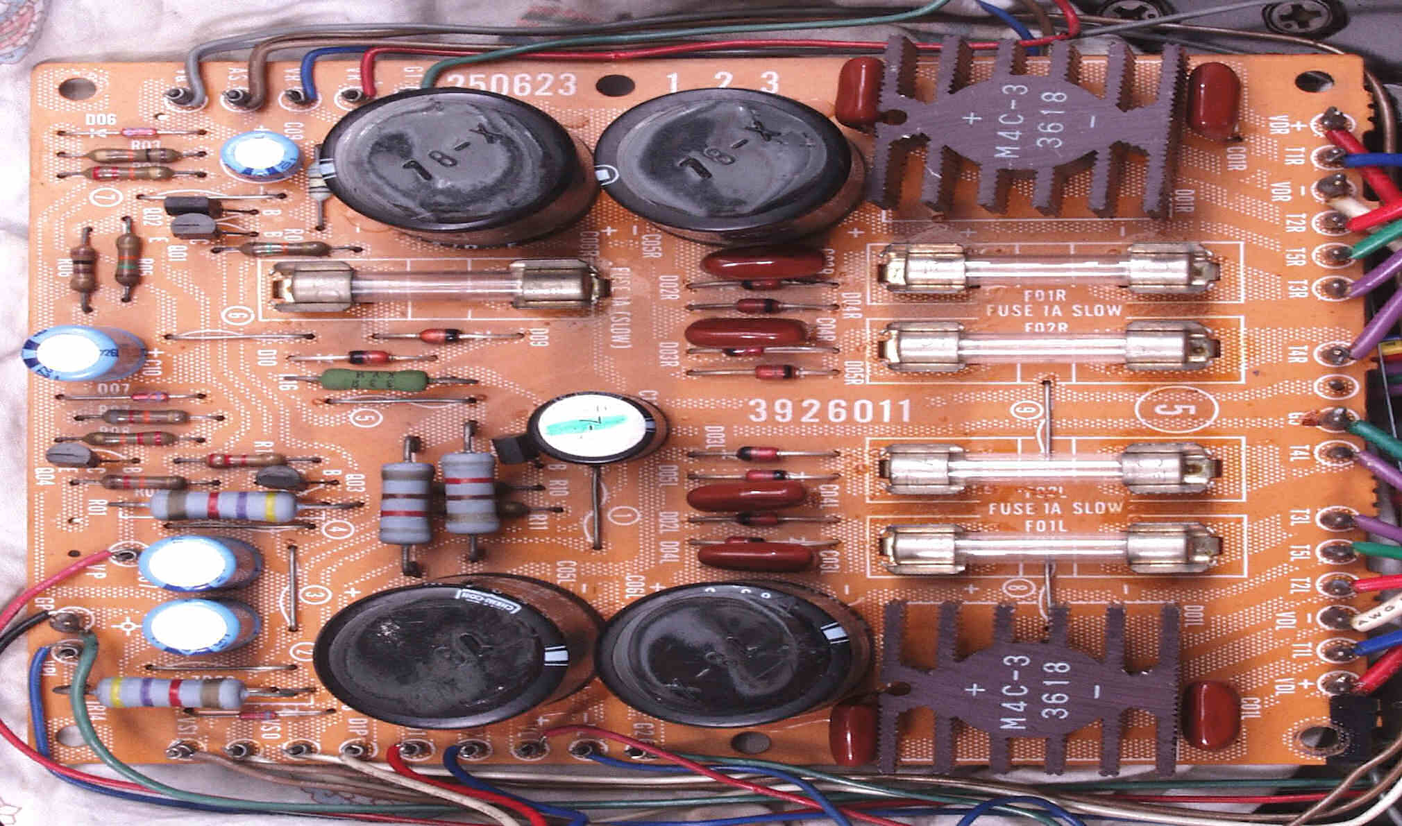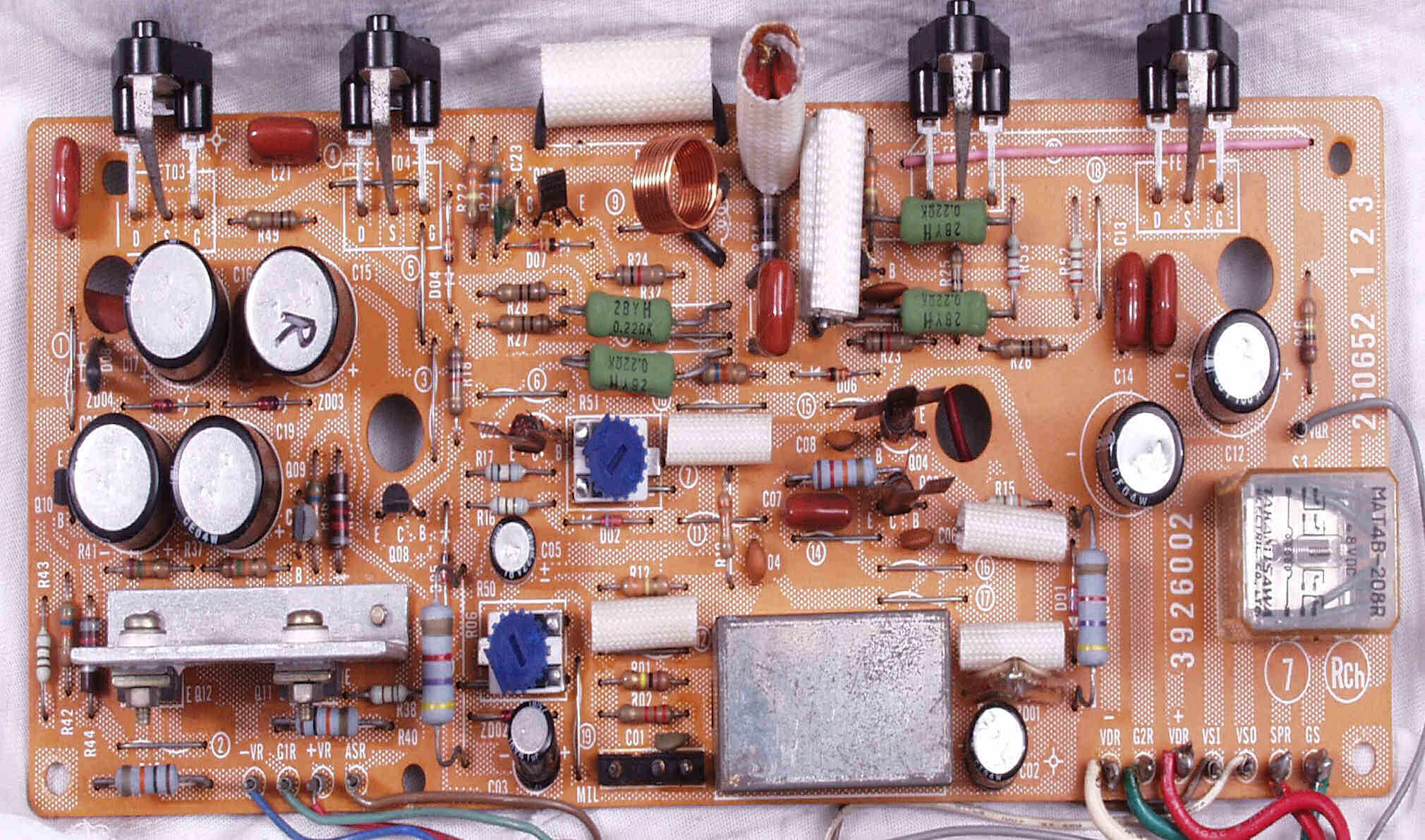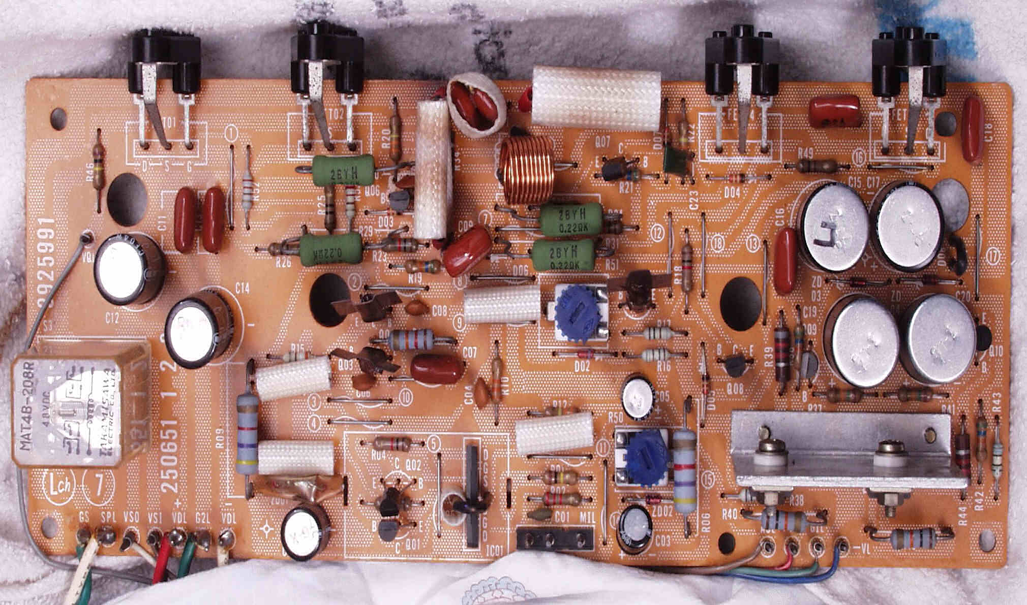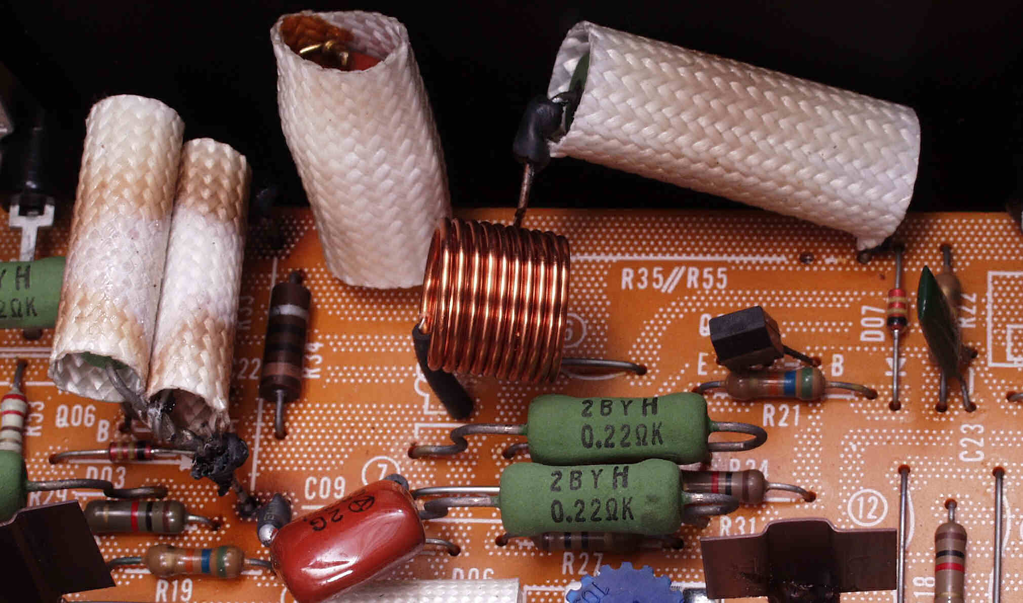 | A6. 修理前見積り点検中 L側AMP基板、発振の為焼けた抵抗の保護チューブ |
