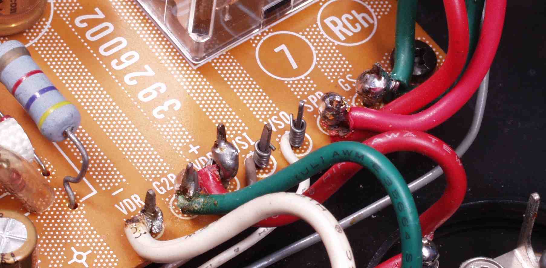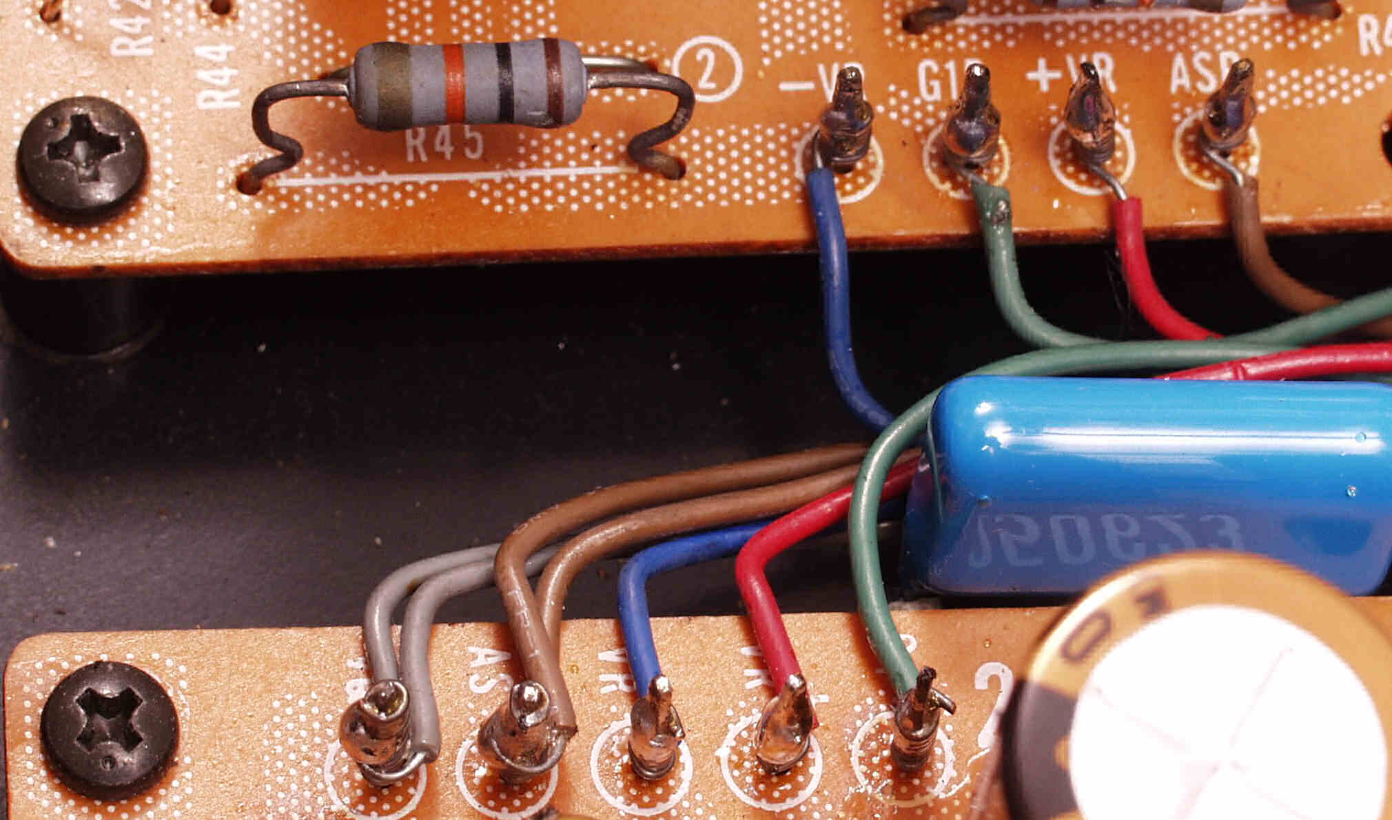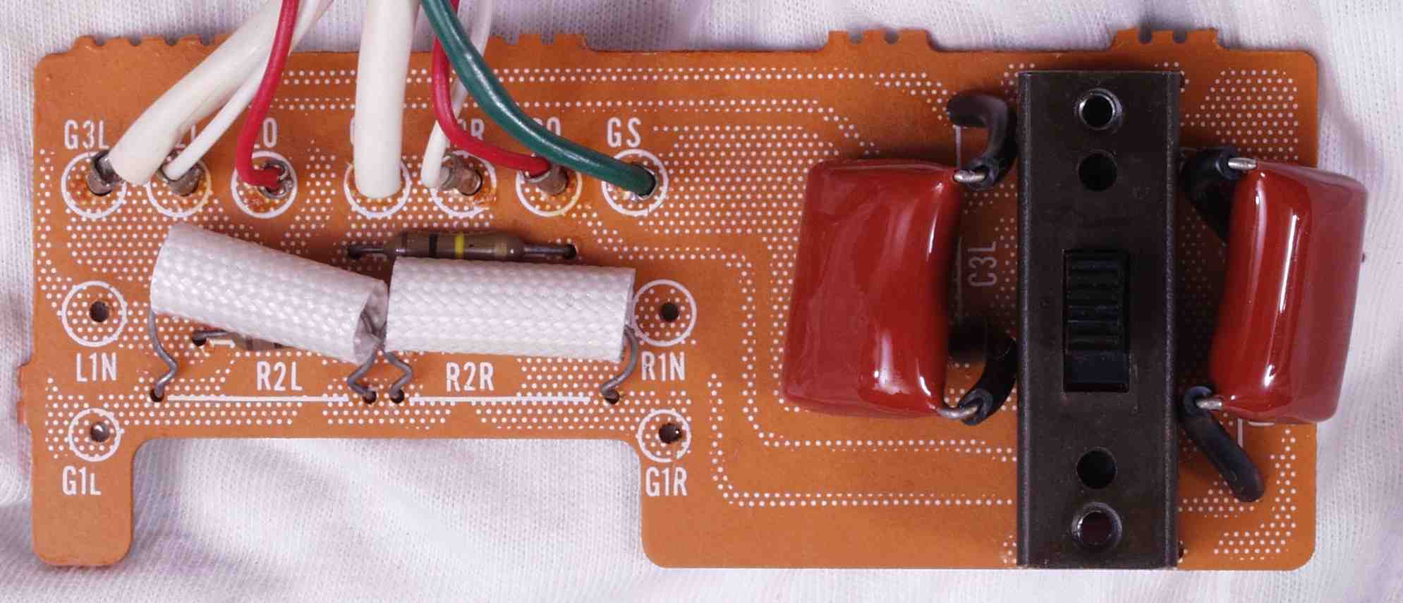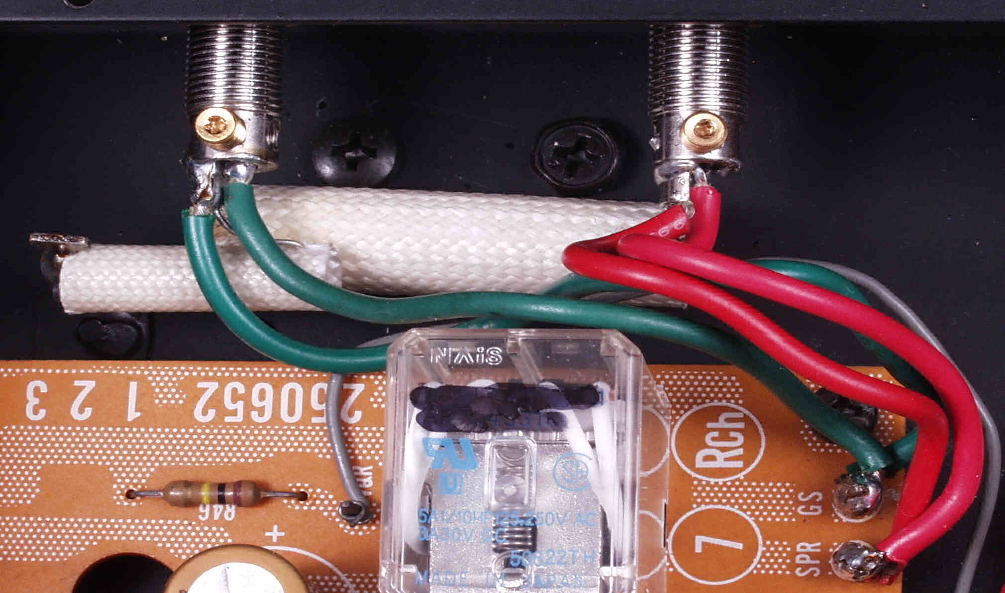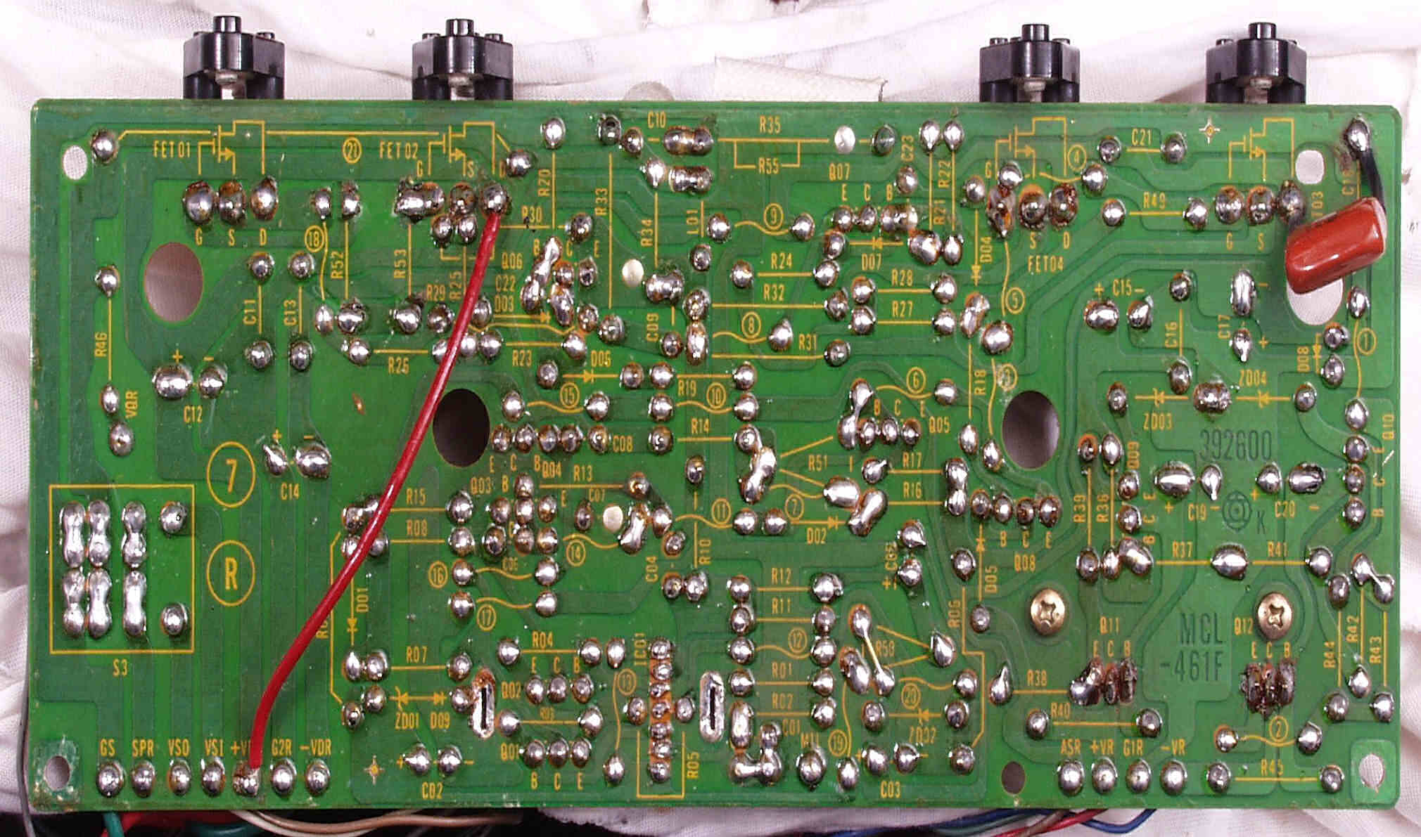 | A6. 修理前見積り点検中 L側AMP基板、発振の為焼けた抵抗の保護チューブ |