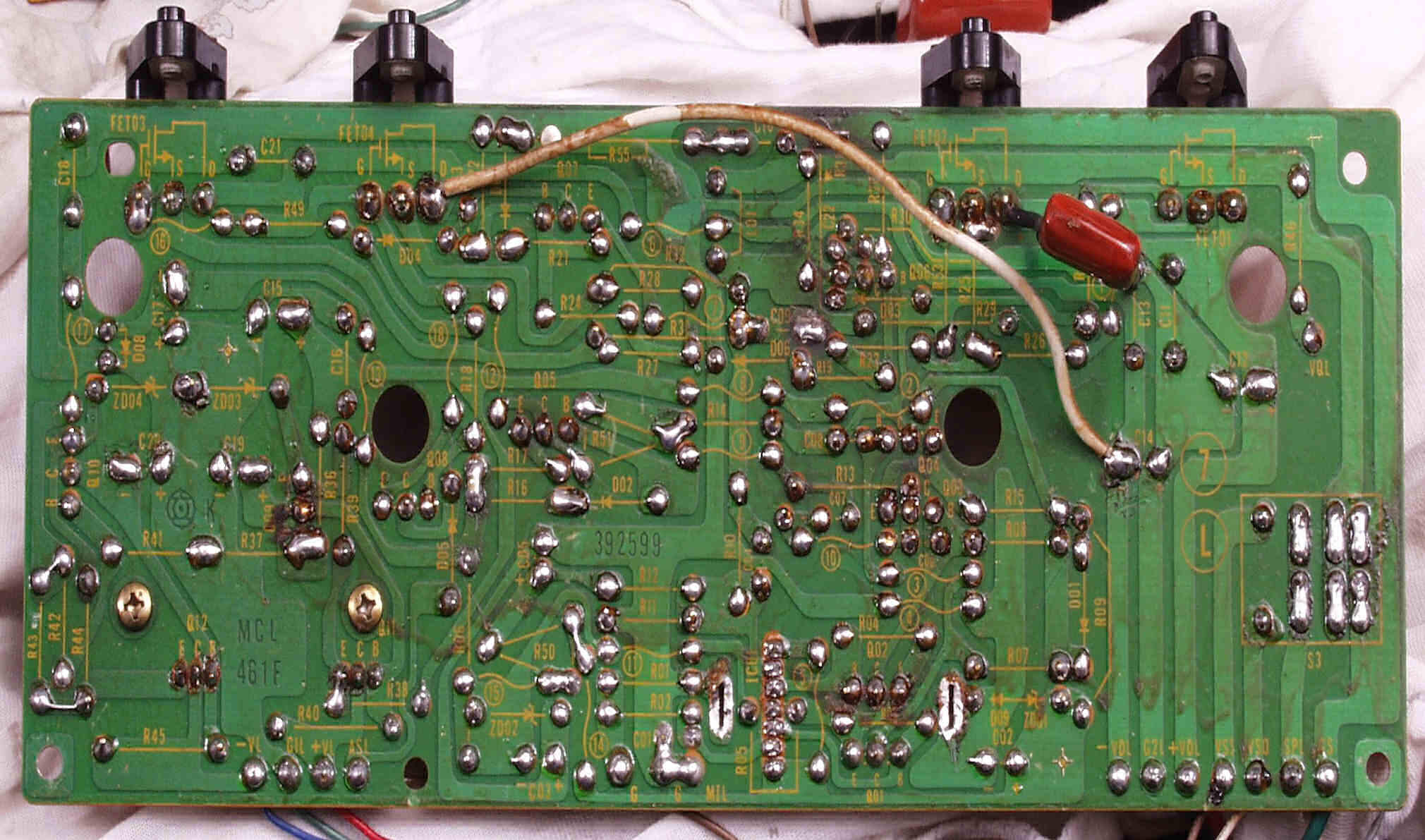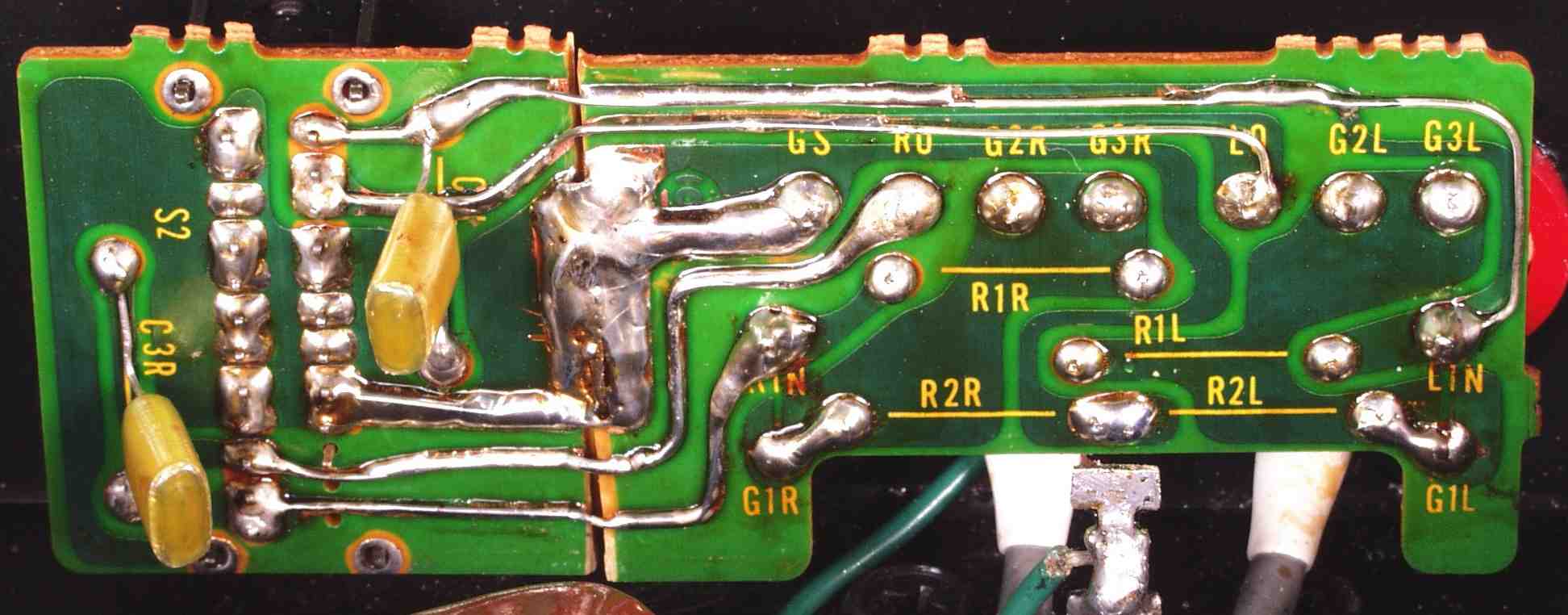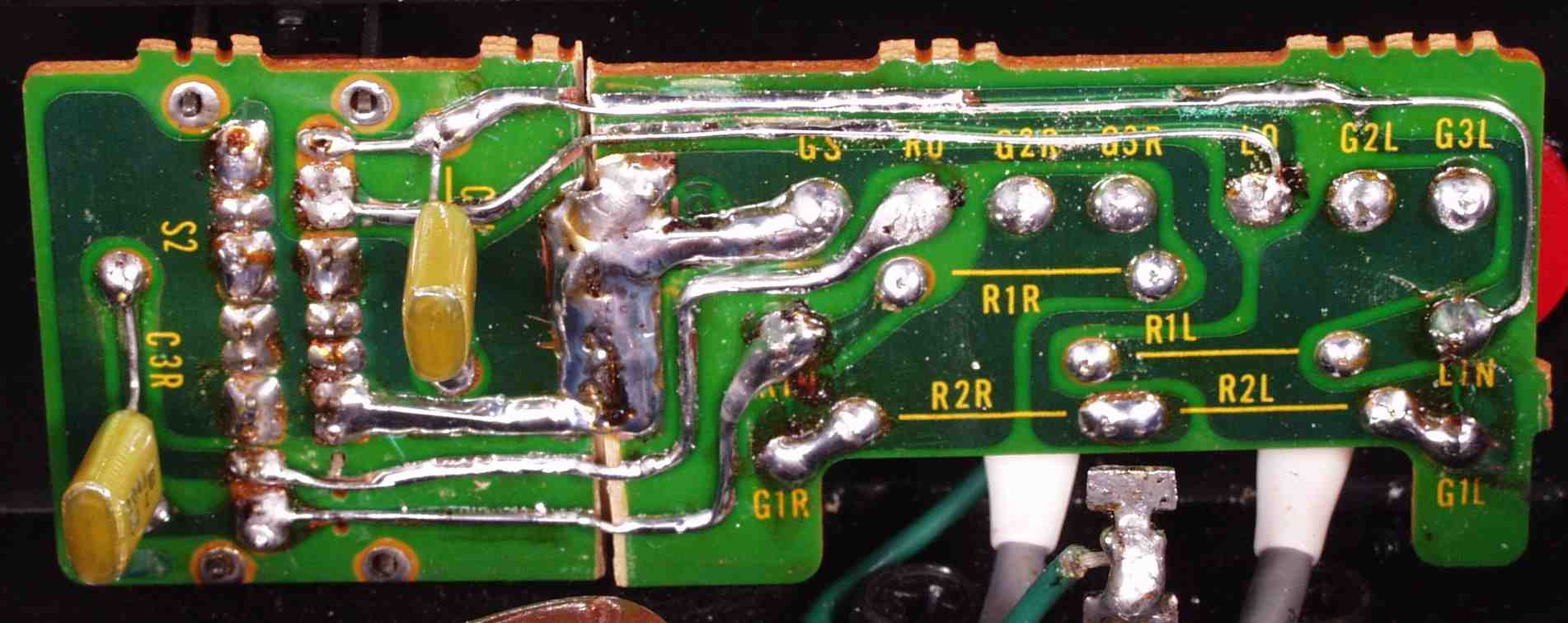 | C5E. 修理(半田補正)後 修理後 入力RCA端子基盤裏 |