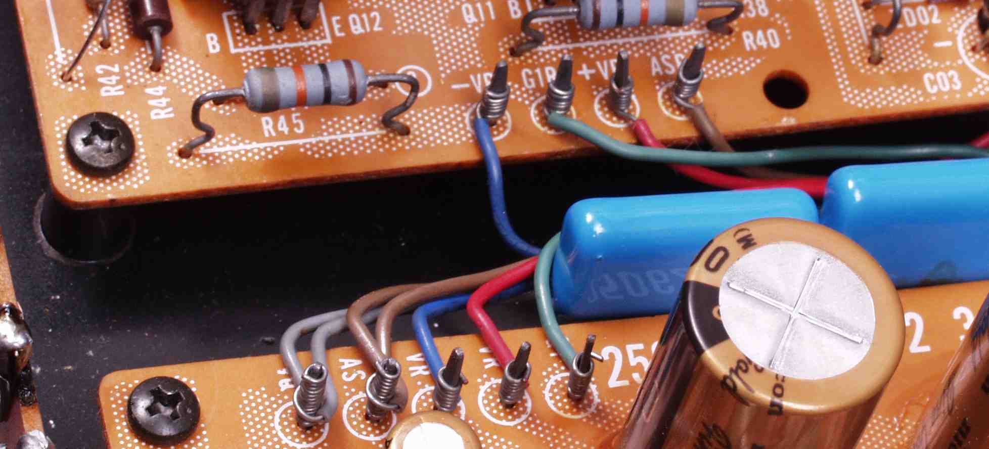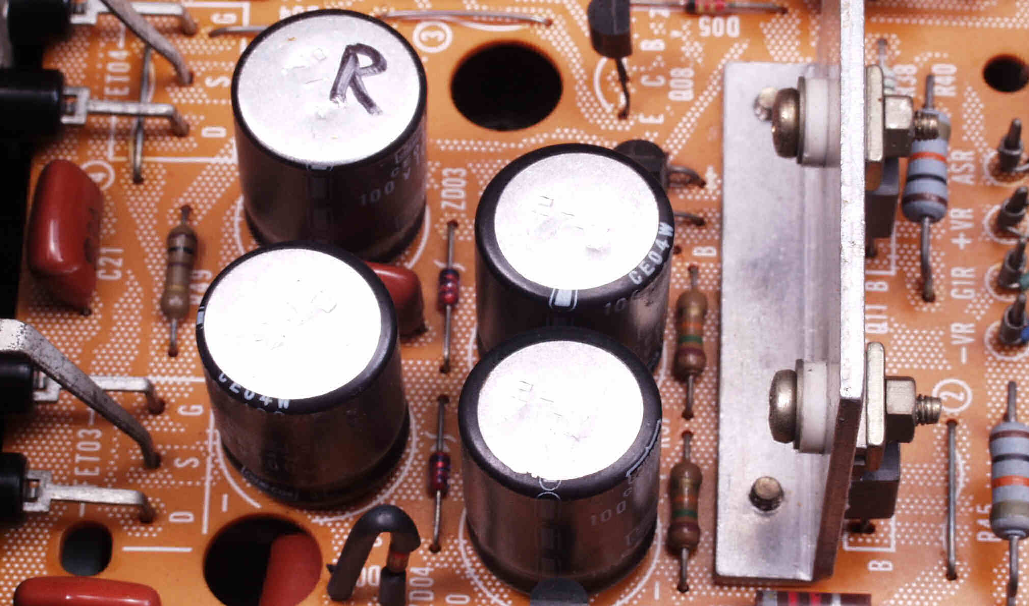 | A5A. 修理前見積り点検中 R側AMP基板の電解コンデンサーが熱のため、頭のビニールが剥けた |