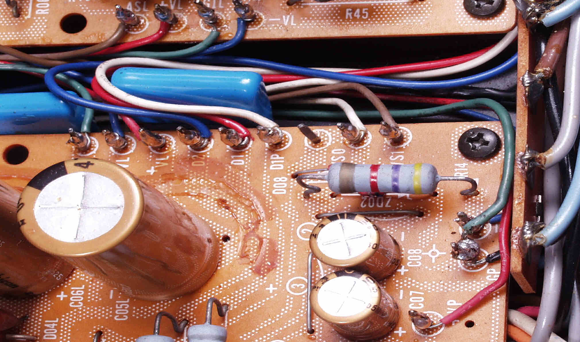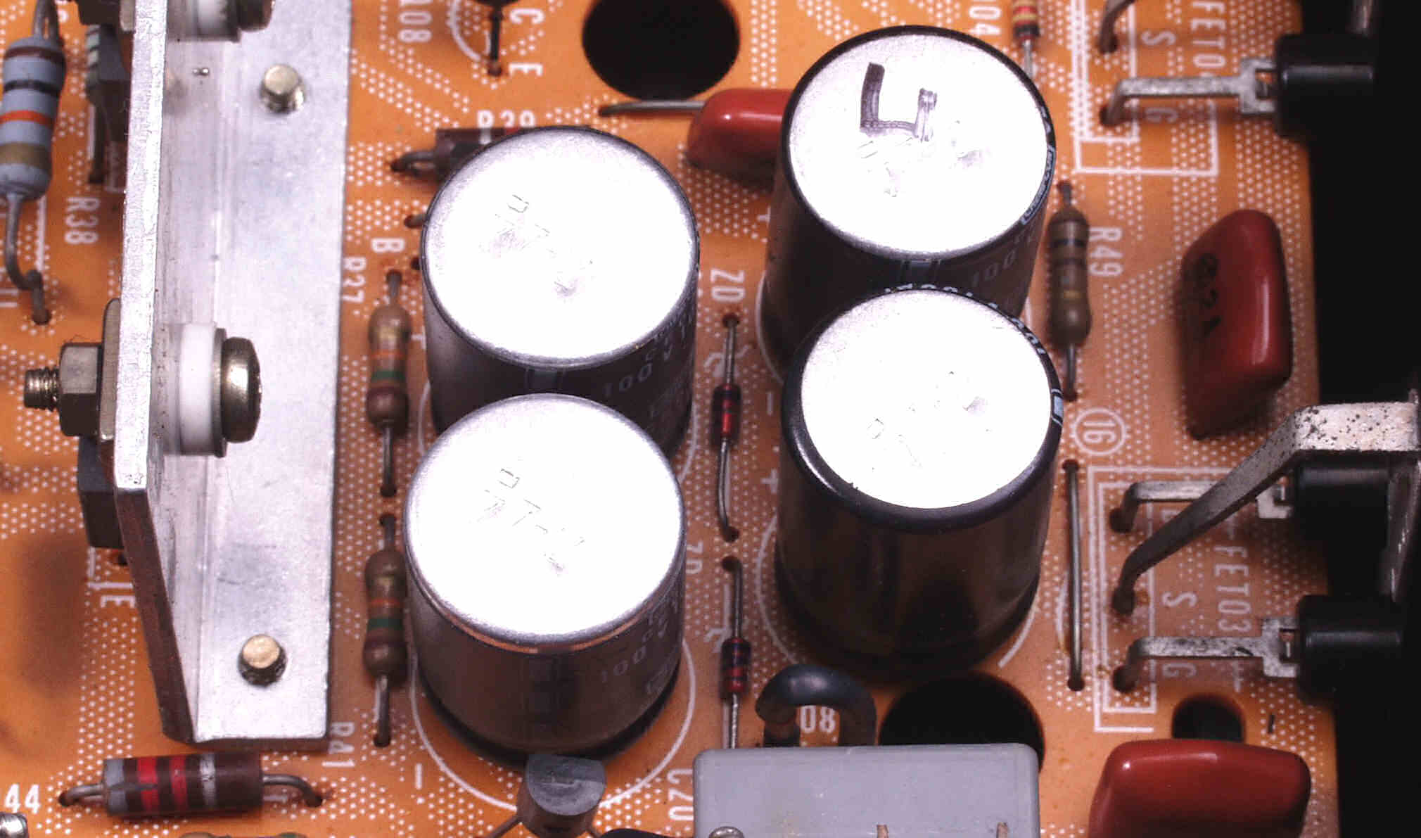 | A5B. 修理前見積り点検中 L側AMP基板の電解コンデンサーが熱のため、頭のビニールが剥けた |