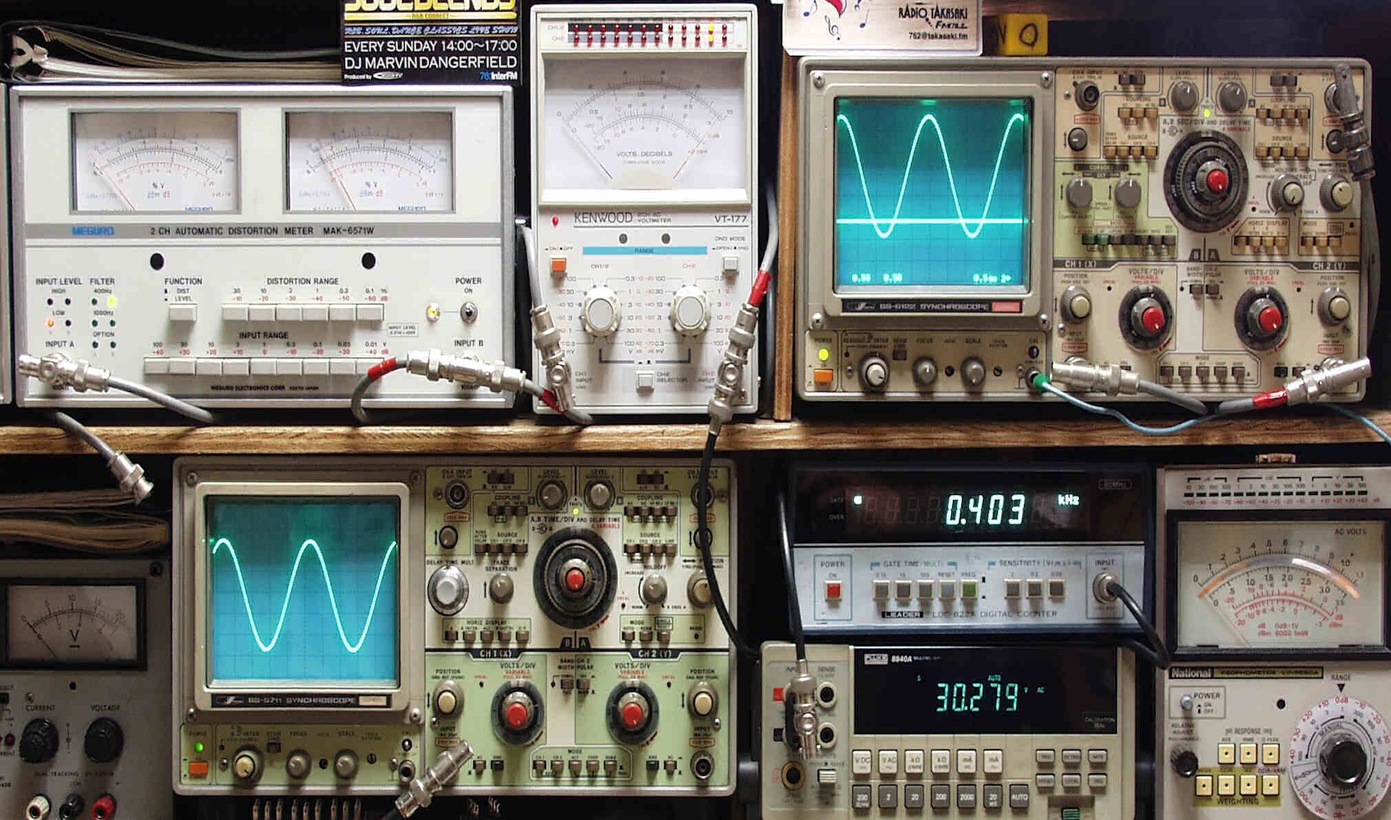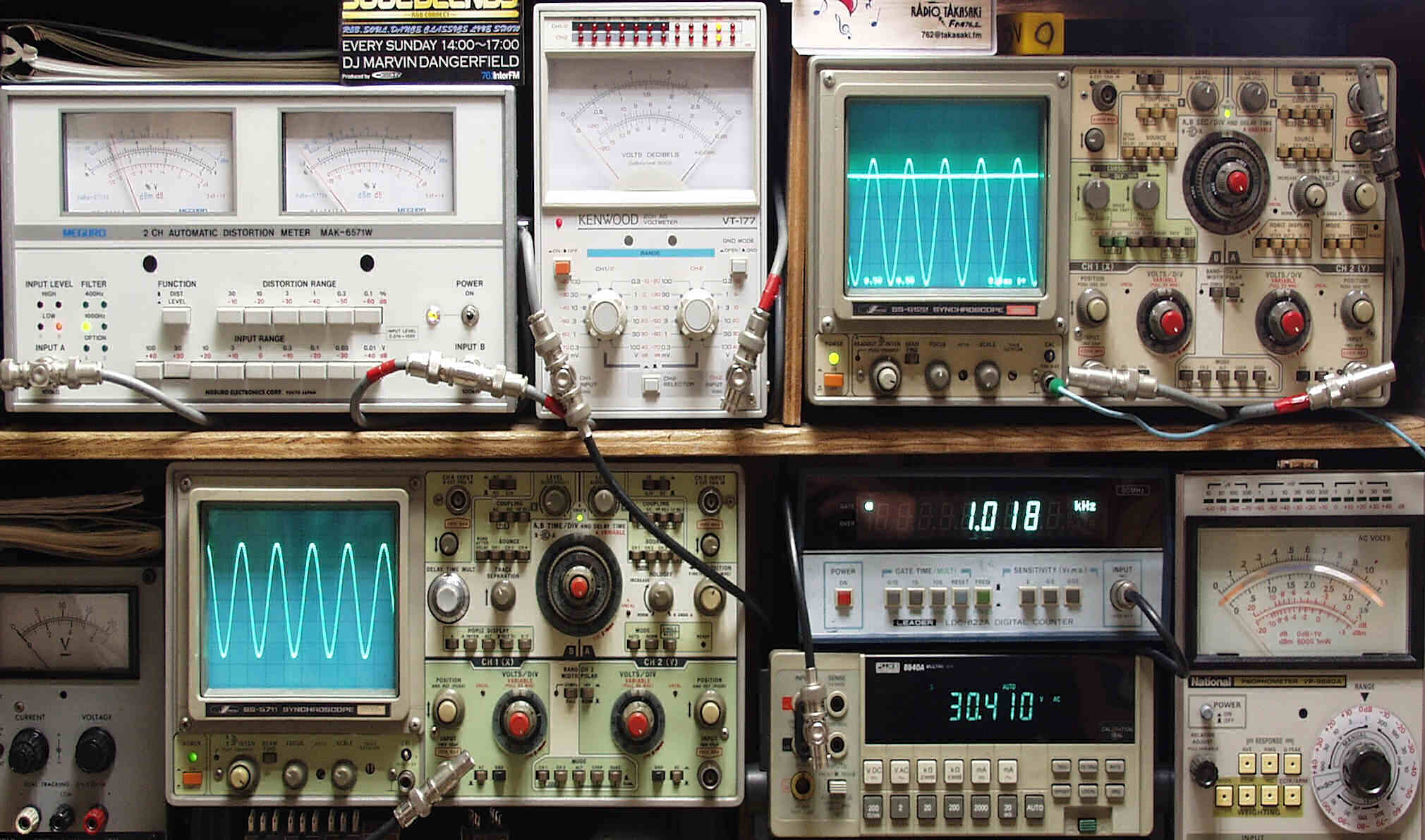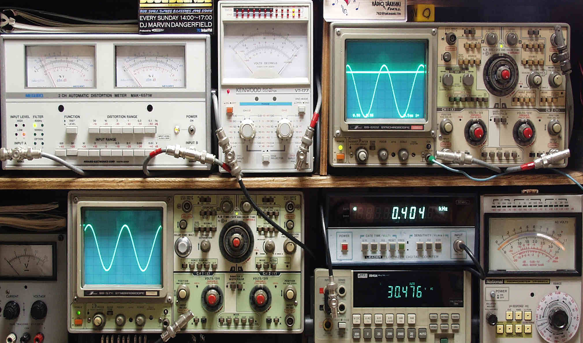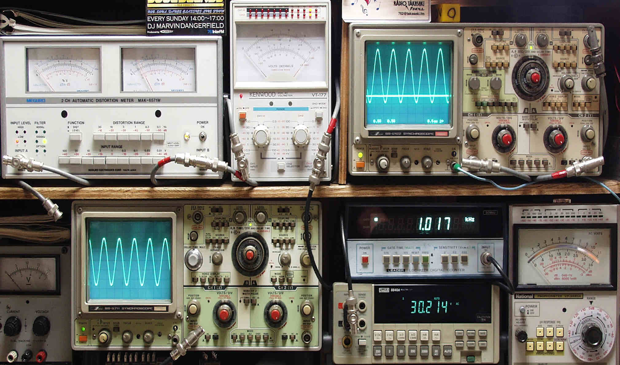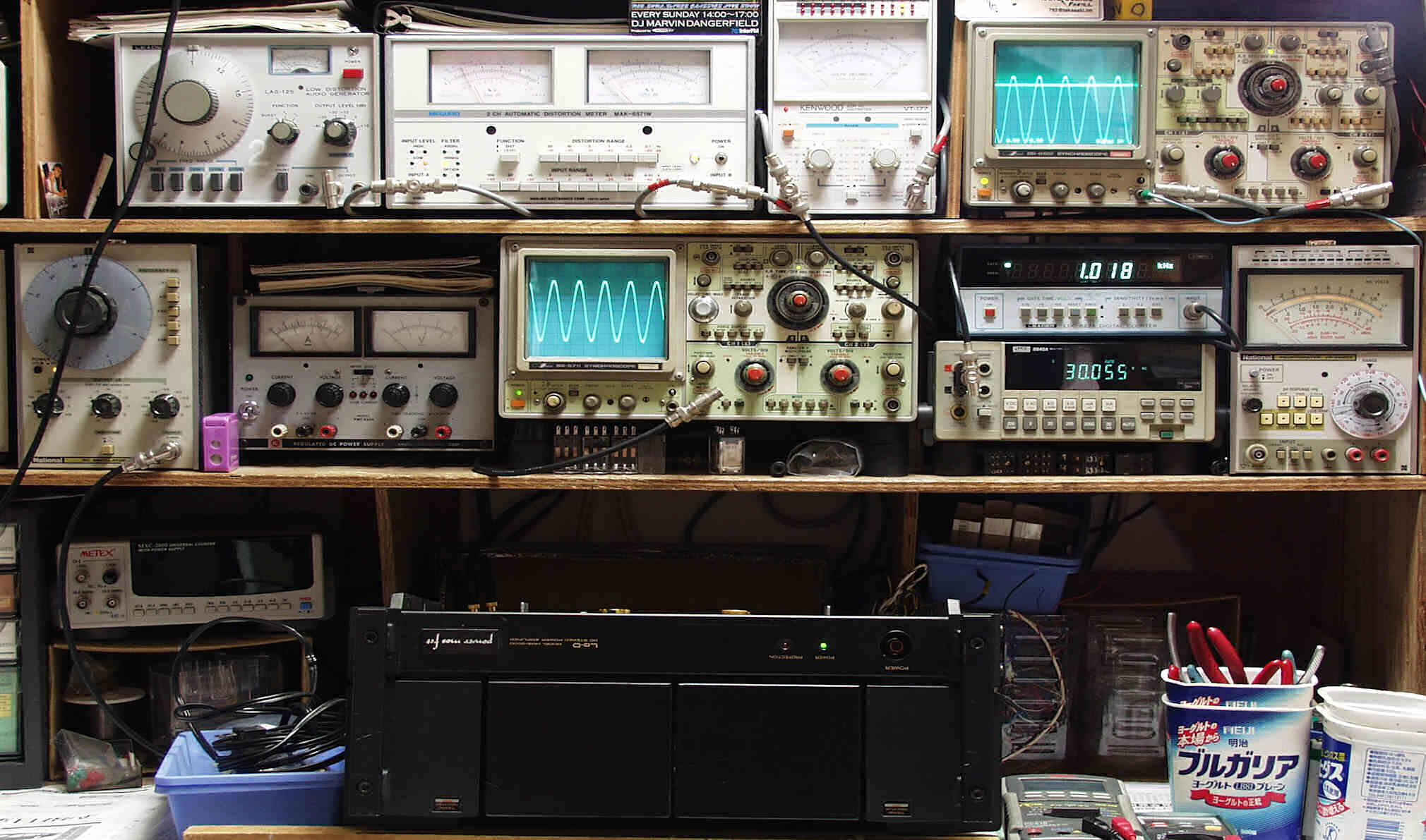 | E. 調整・測定 E1. 出力/歪み率測定・調整 <見方> 下左オーディオ発振器より400HZ・1KHZの信号を出す(歪み率=約0.003%) 下中=入力波形(オーディオ発振器のTTLレベル) 上中左=SP出力の歪み率測定 左メータ=L出力、右メータ=R出力 上中=SP出力電圧測定器、赤針=R出力、黒針=L出力 上右端=SP出力波形オシロ 上=R出力、下=L出力(出力電圧測定器の出力) 下中右上=周波数計 下中右下=SP出力電圧デジタル電圧計で測定 |