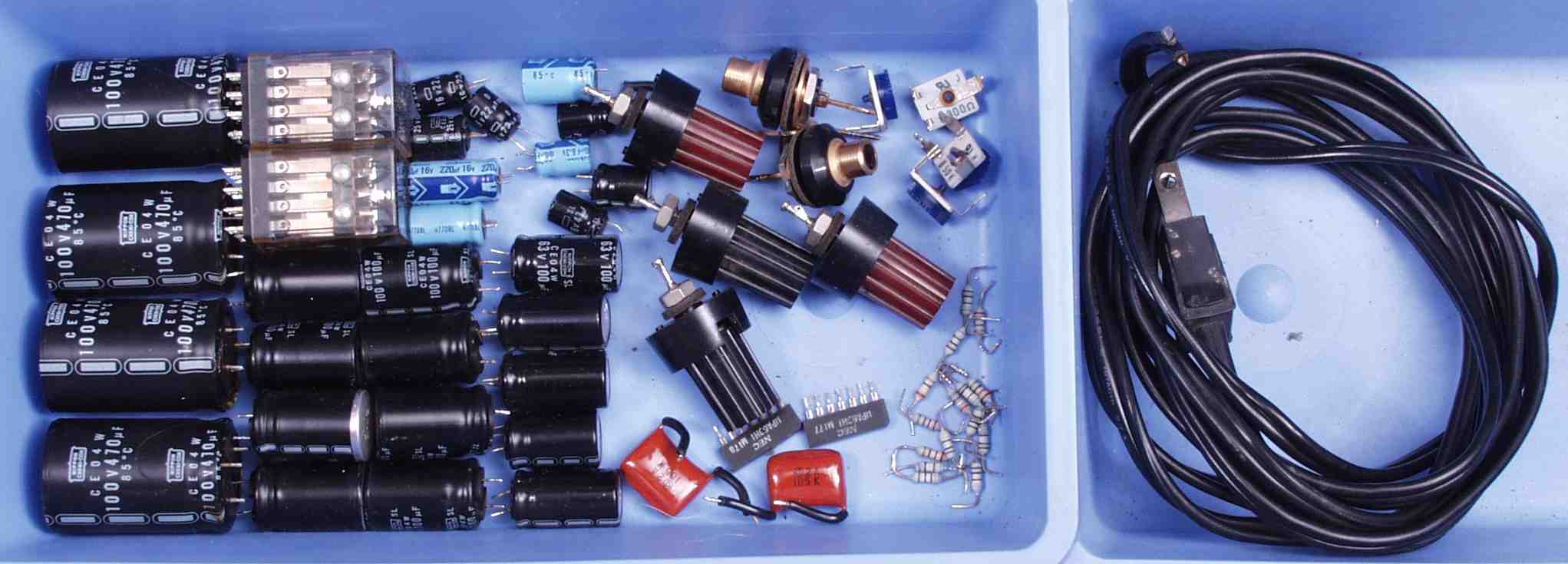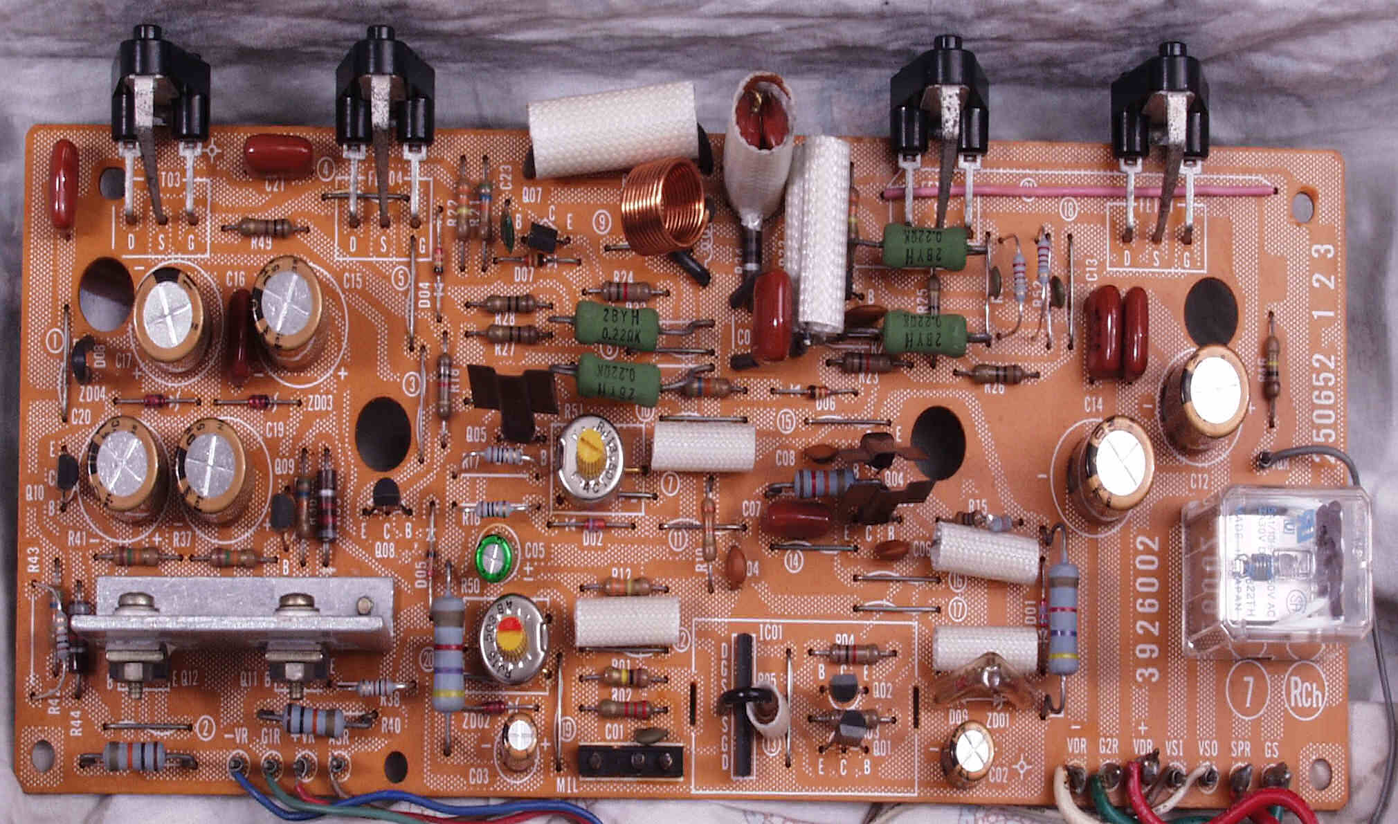 | C1B. 修理後 Rドライブ基板 初段FET(電界効果トランジスター)、バランス/バイアス調整用半固定VR2個、SP接続リレー交換 フューズ入り抵抗も全部交換 電解コンデンサー9個交換 |