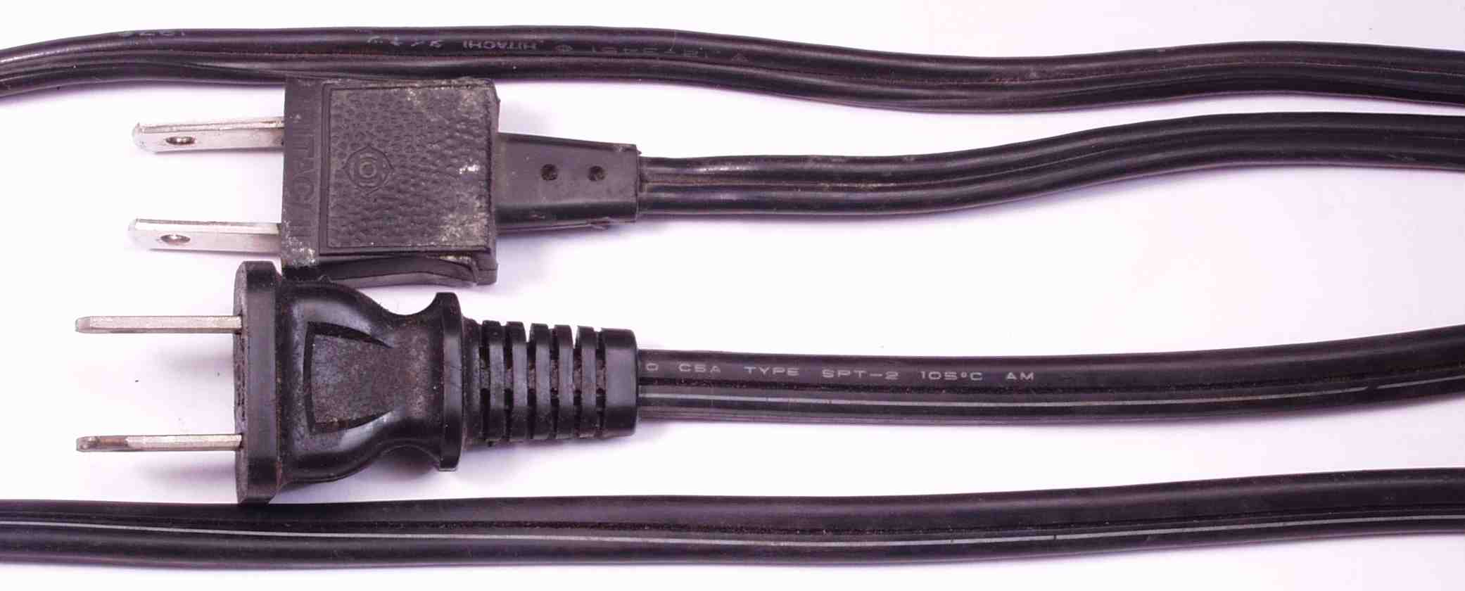 | A7. 修理前見積り点検中。 ACコードの比較。 上=付いている物。 下=交換する物 |