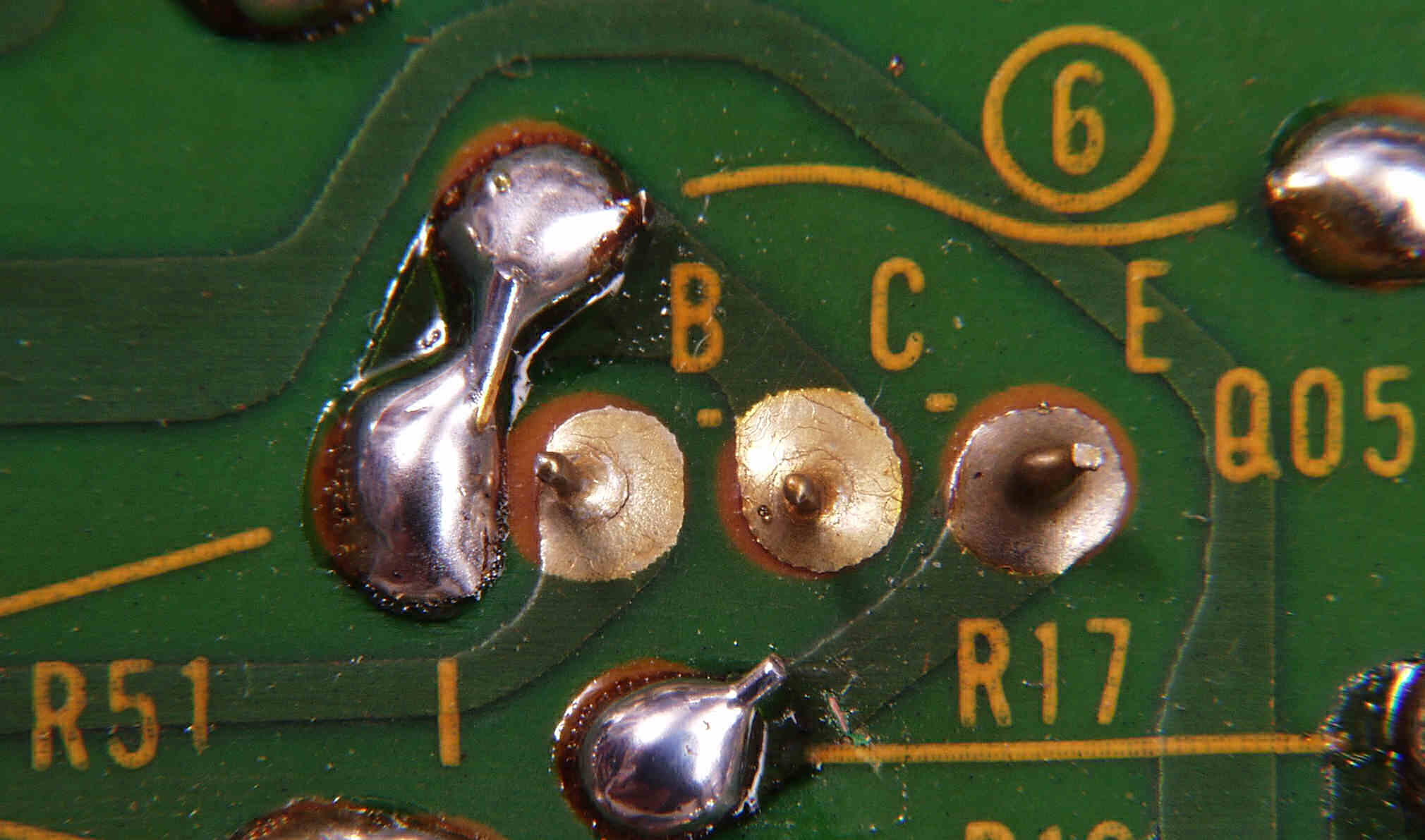 | C1E. 修理中 Rドライブ基板裏 余分なフラックスを取る |