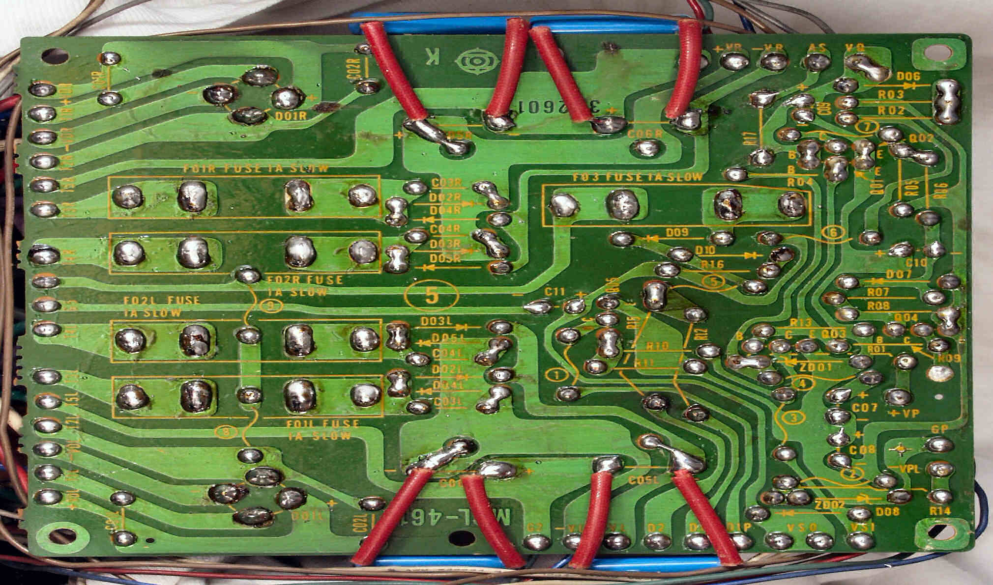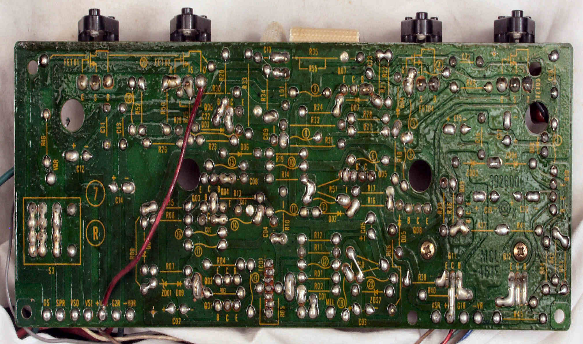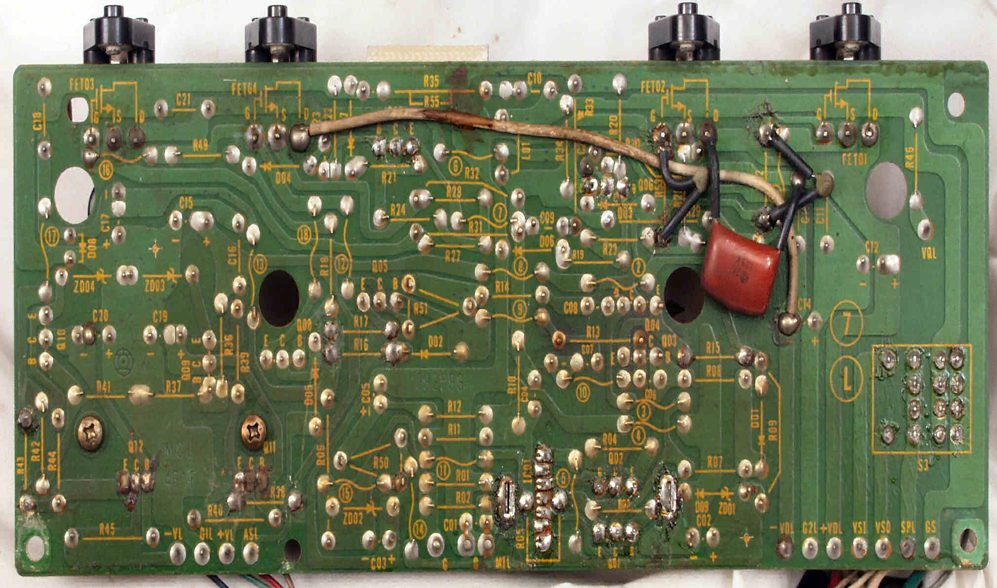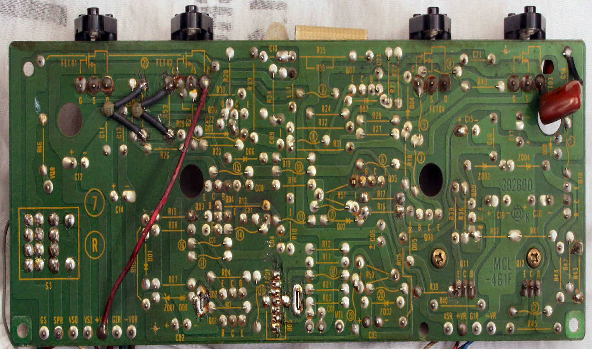 C1A−2. 修理前 Rドライブ基板、抵抗を交換するのに、基板を外すのが面倒なのでリード線を半田でジョイント。