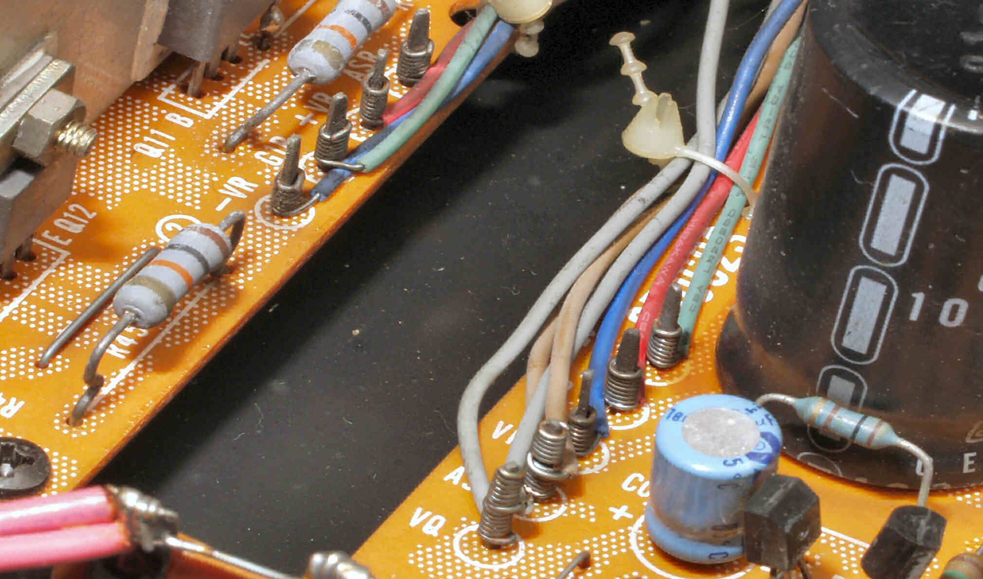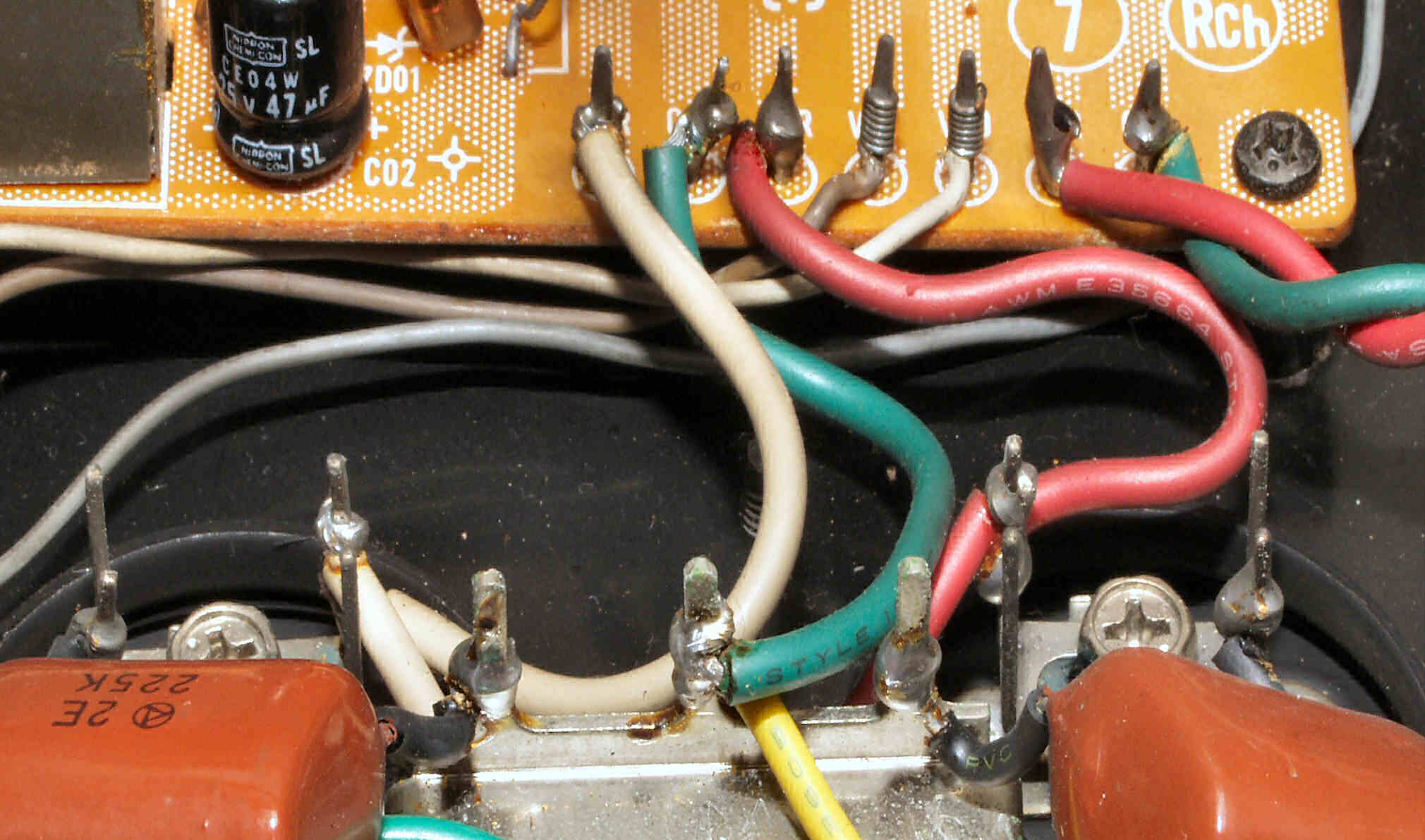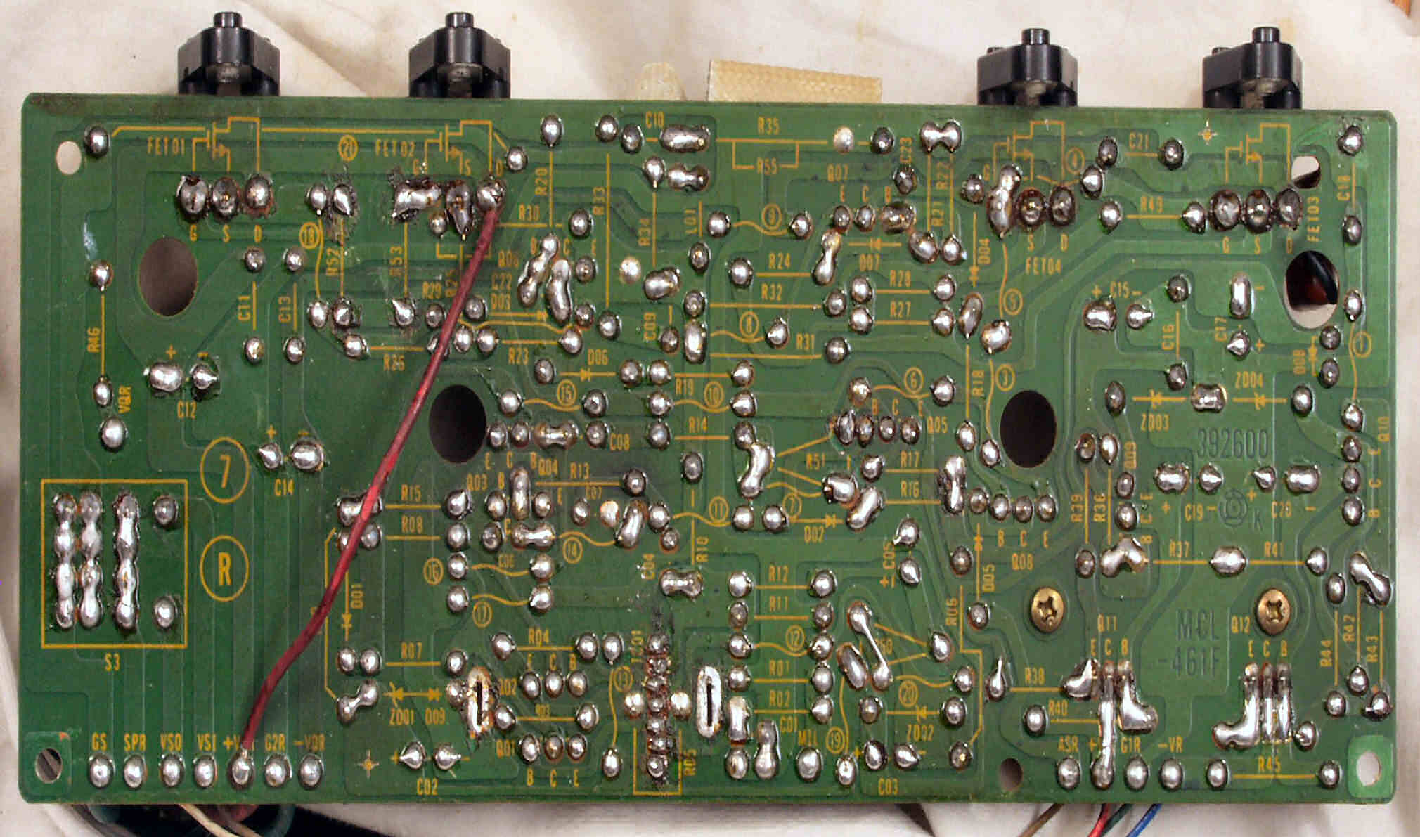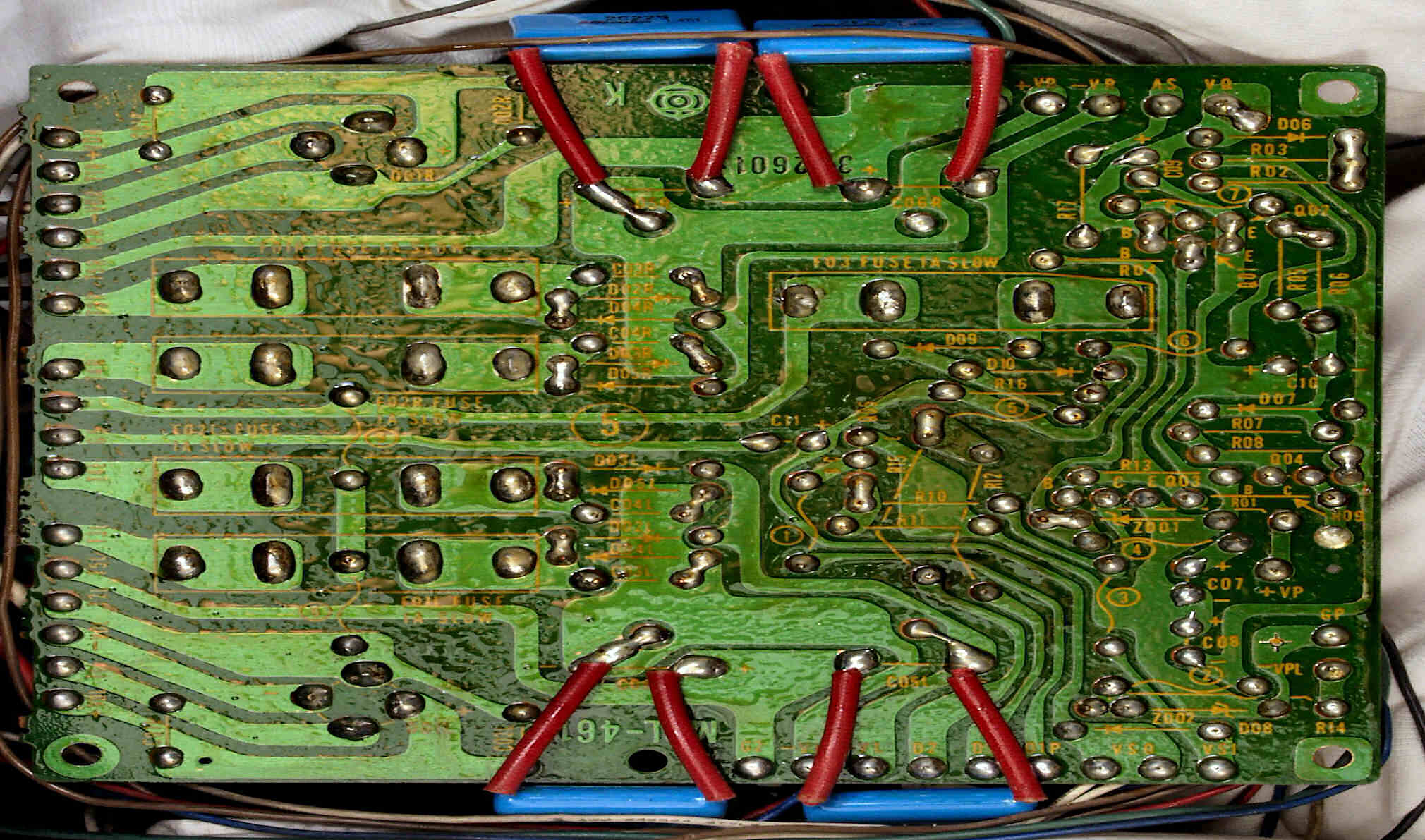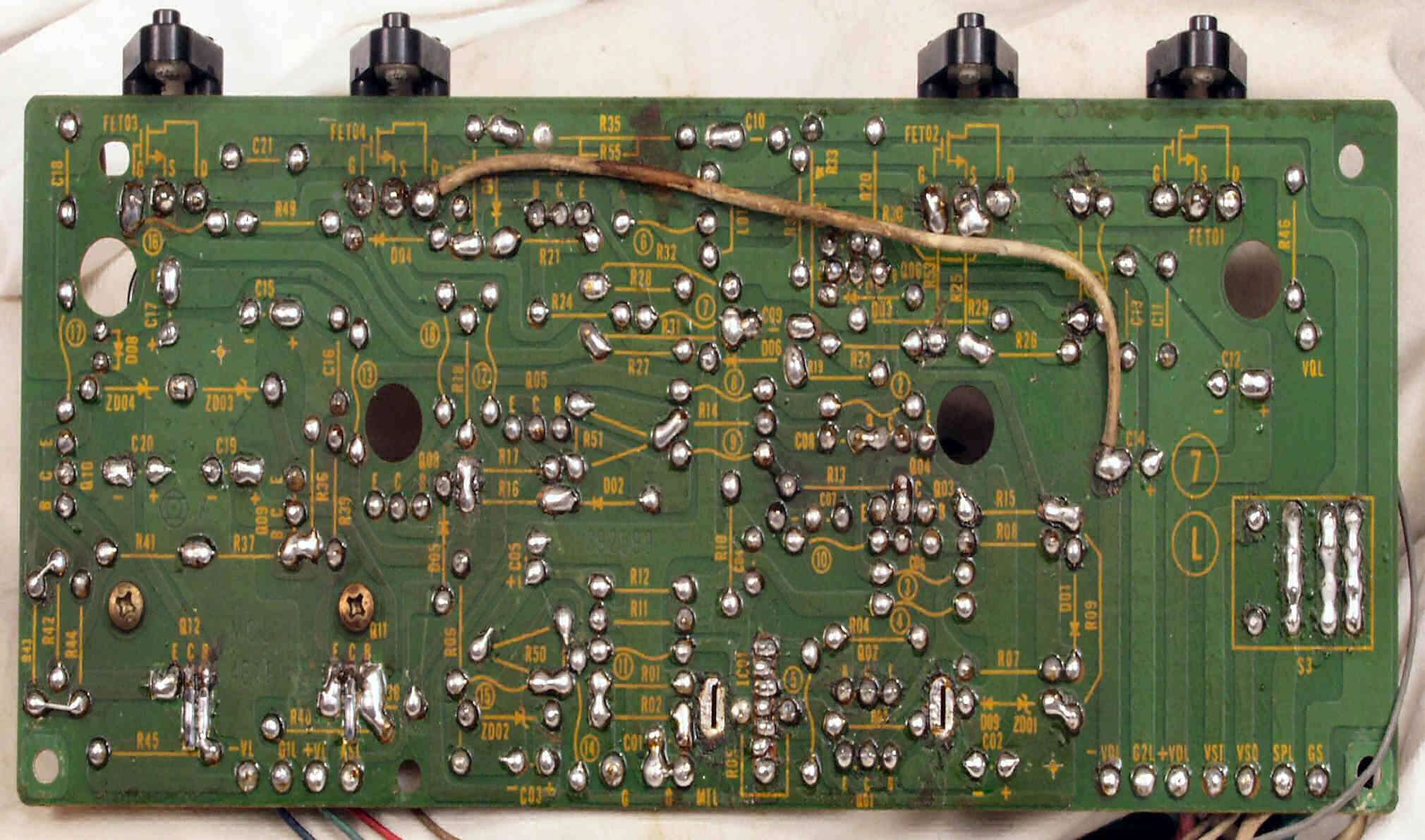 C1A−2. 修理前 Rドライブ基板、抵抗を交換するのに、基板を外すのが面倒なのでリード線を半田でジョイント。