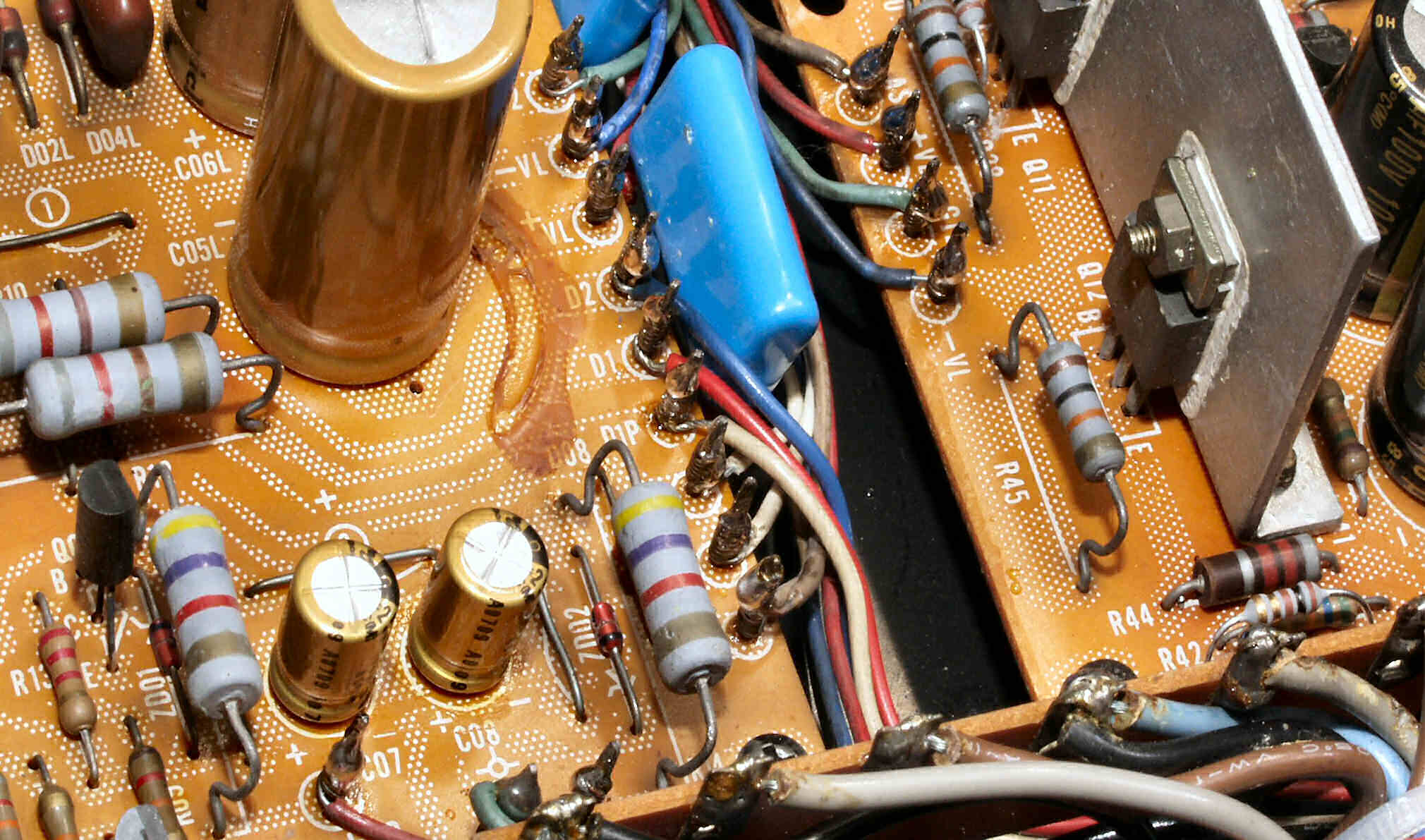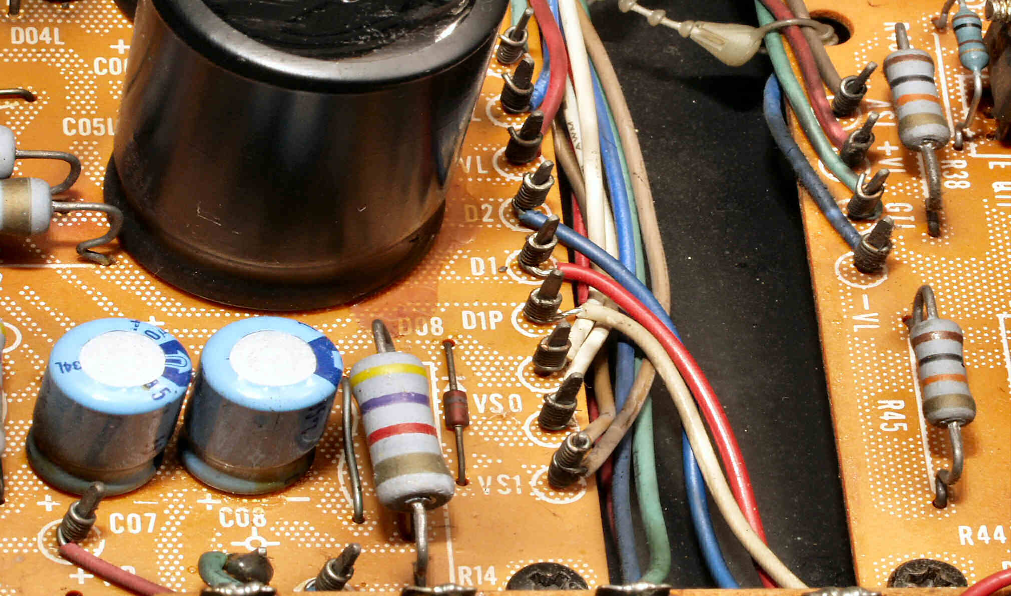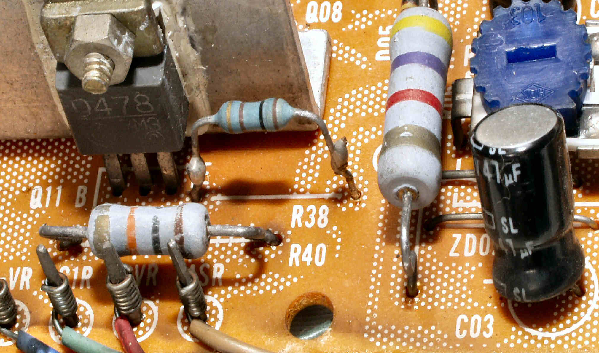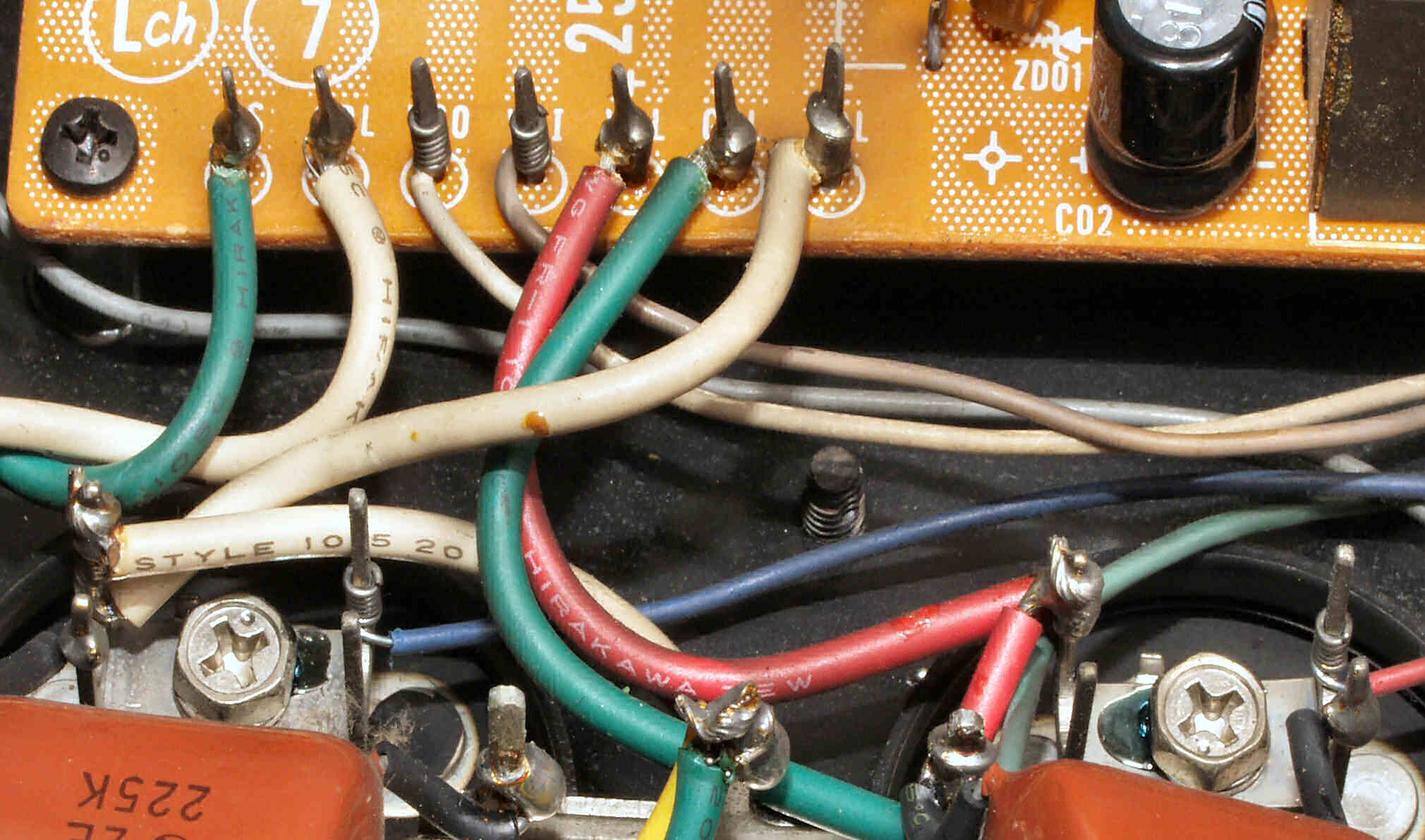 C1A−2. 修理前 Rドライブ基板、抵抗を交換するのに、基板を外すのが面倒なのでリード線を半田でジョイント。