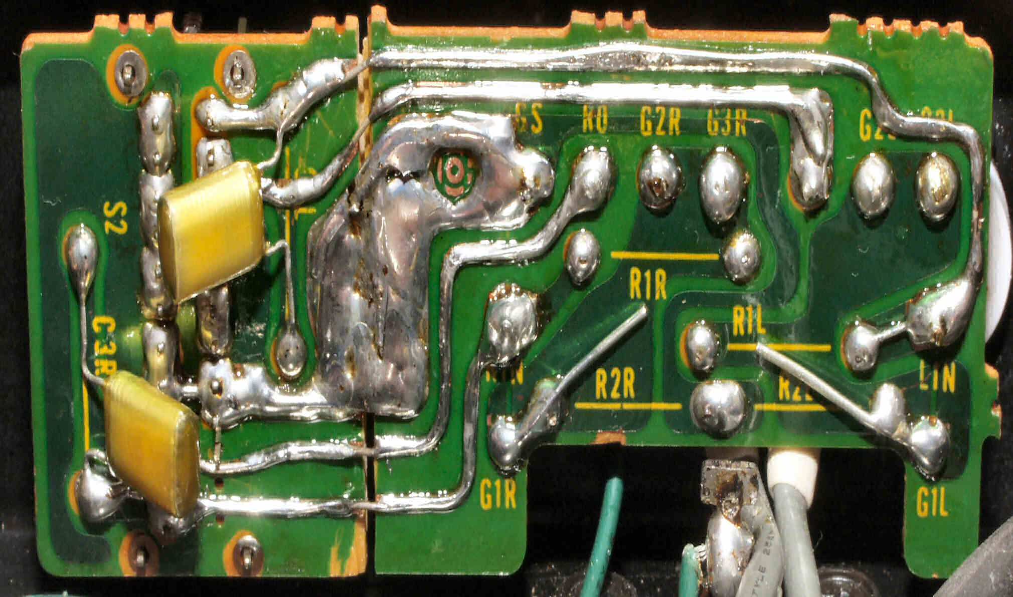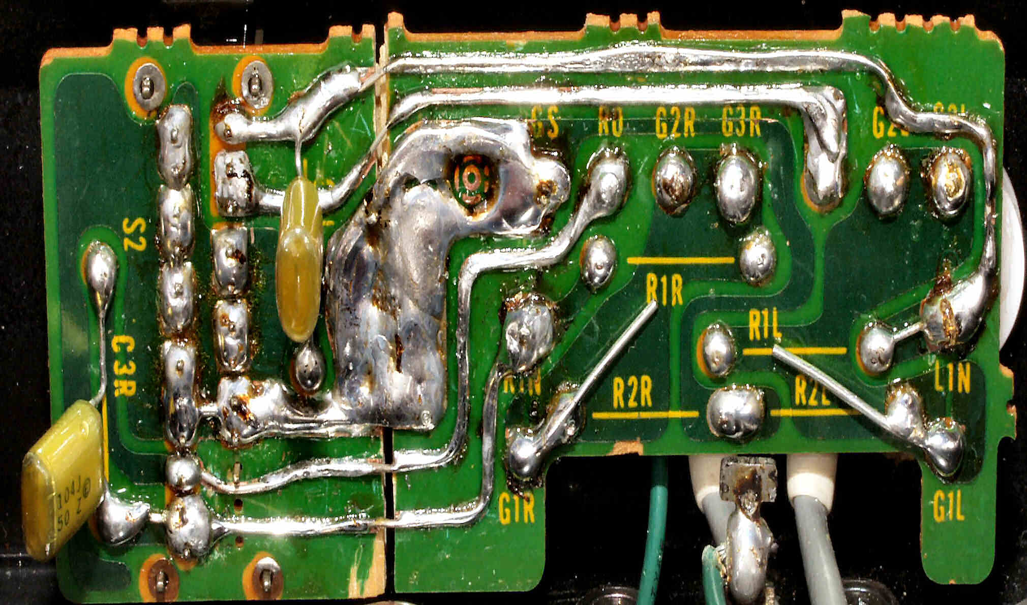 C1C2. 修理前 Rドライブ基板裏、前回の修理の半田が未熟の拡大。