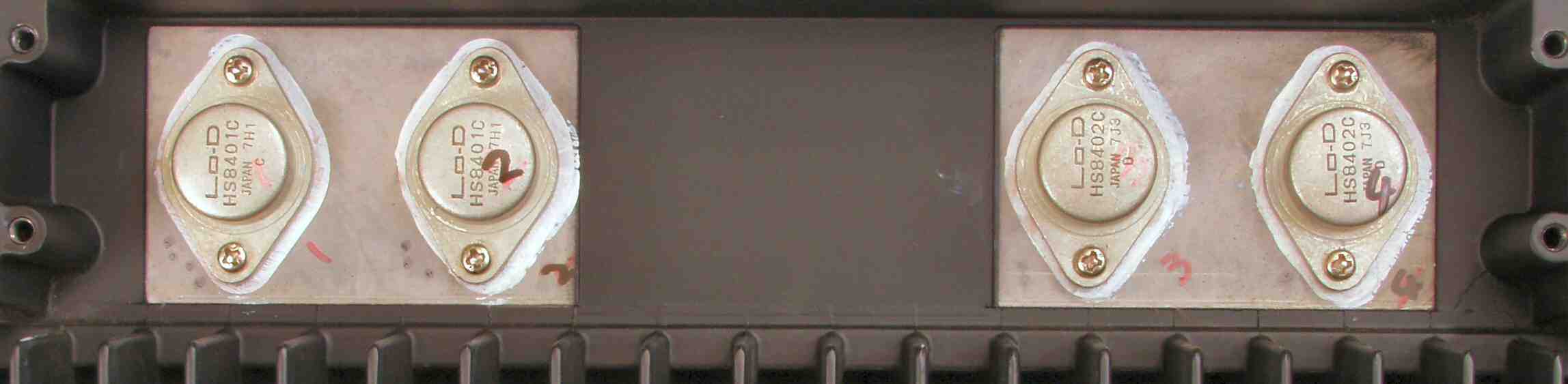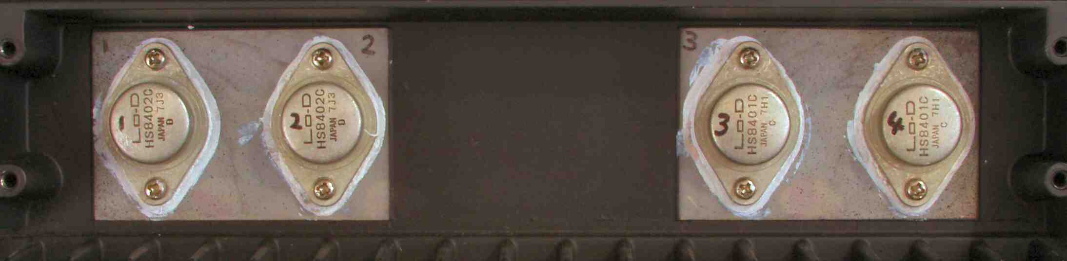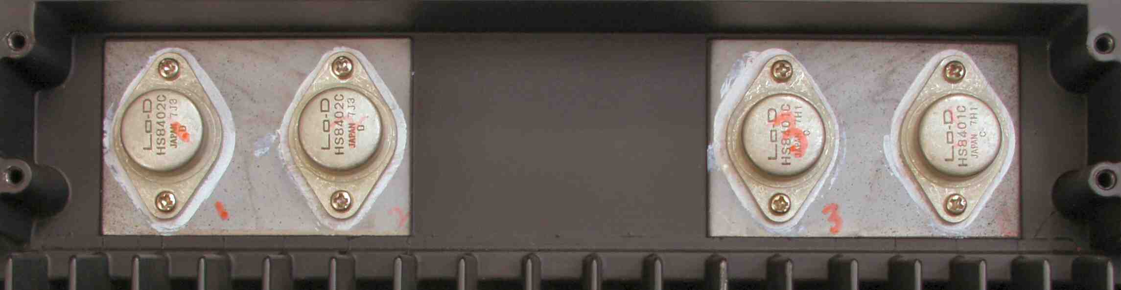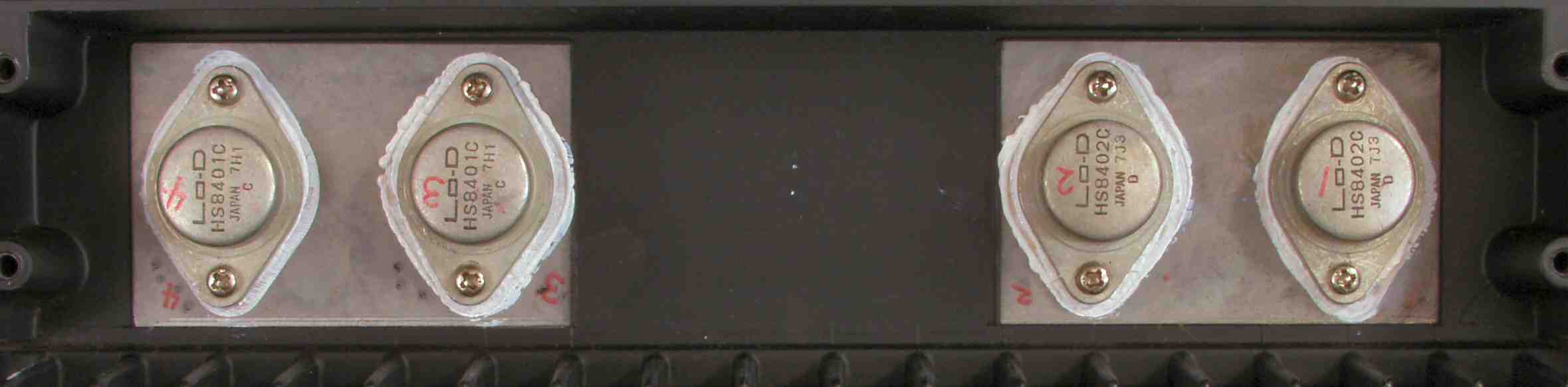 C3C1. 修理前 L側 終段FET(電界トランジスター)、何回も取り外したのか、絶縁雲母の穴が大分大きくなっている。