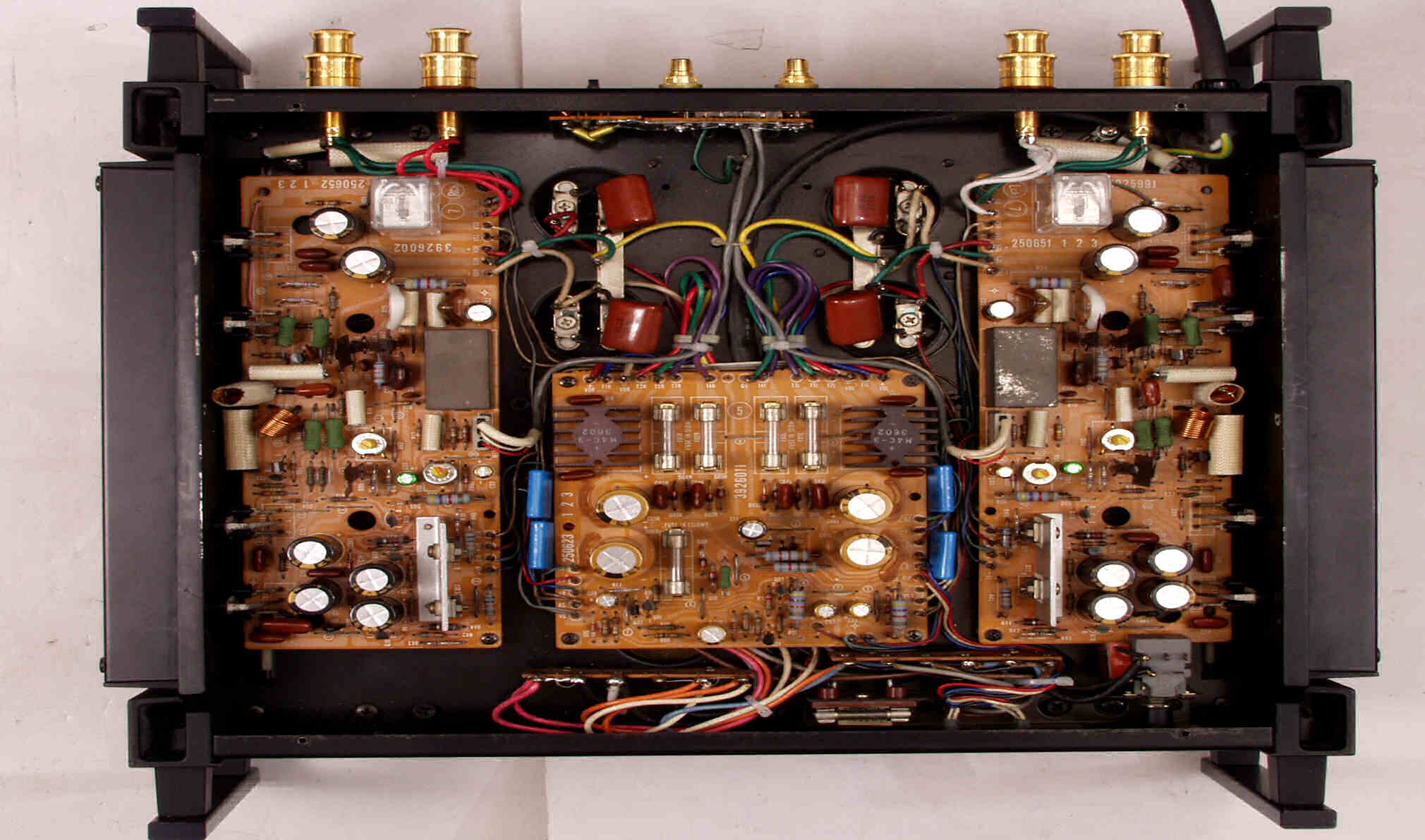 C5E. 修理(半田補正)中 修理後 入力RCA端子基盤裏、 フイルムコンデンサー2個交換、2個追加