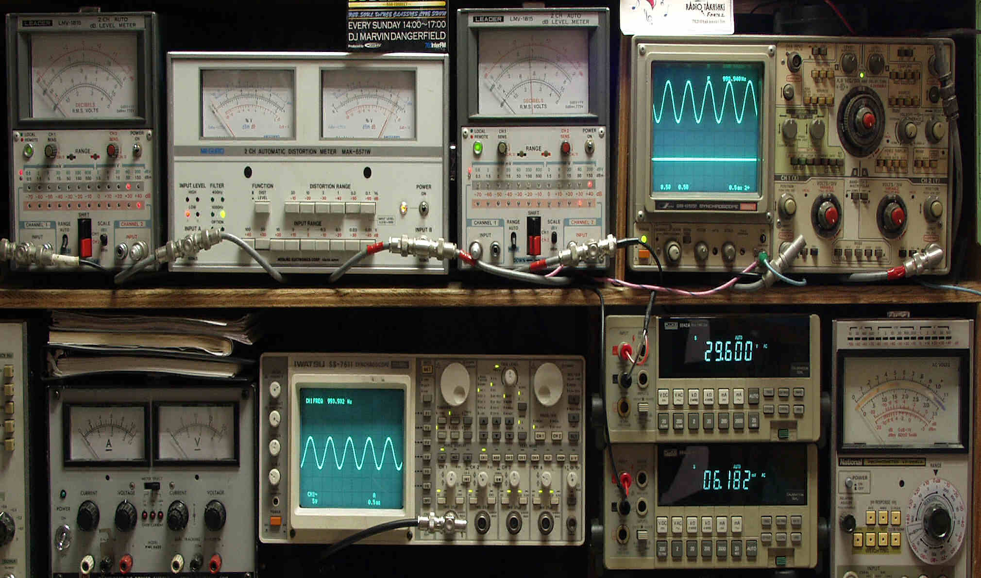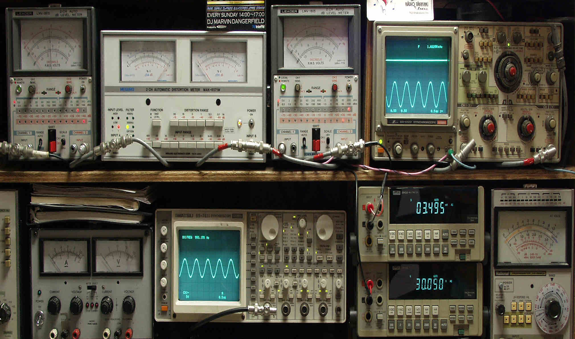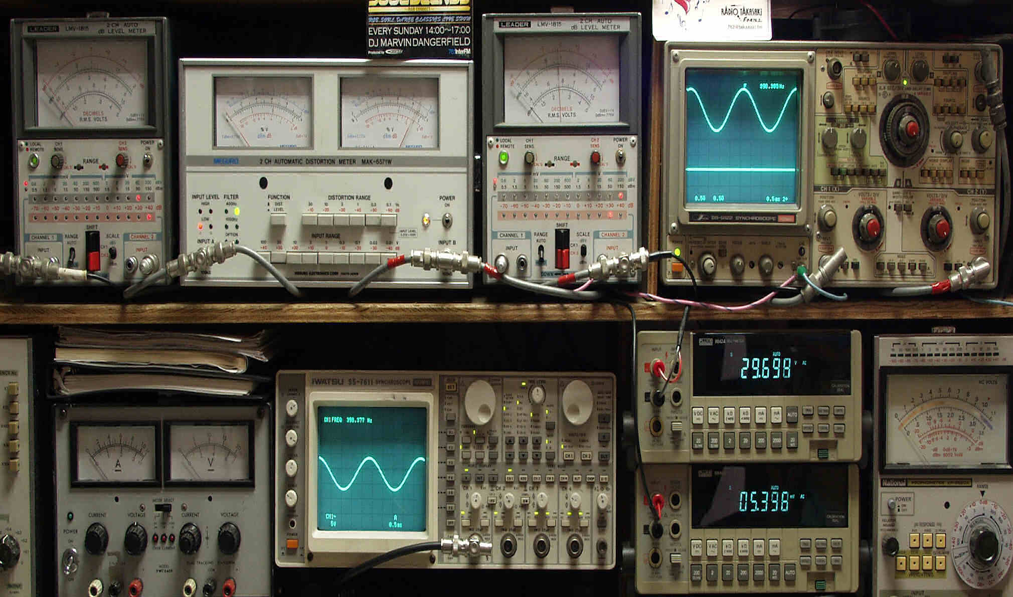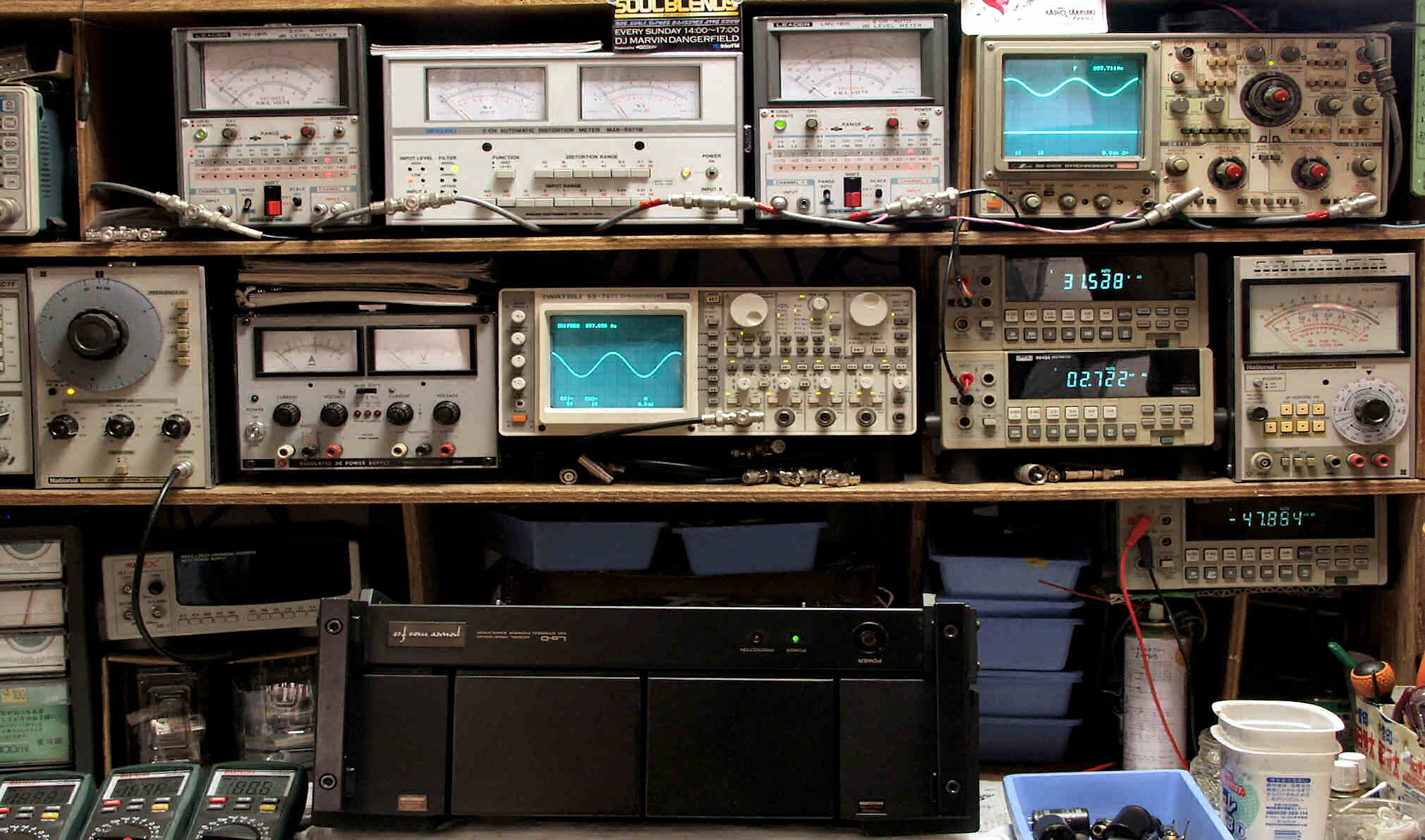上段中左 歪み率計=出力の歪み率測定 左メータ=L出力、右メータ=R出力