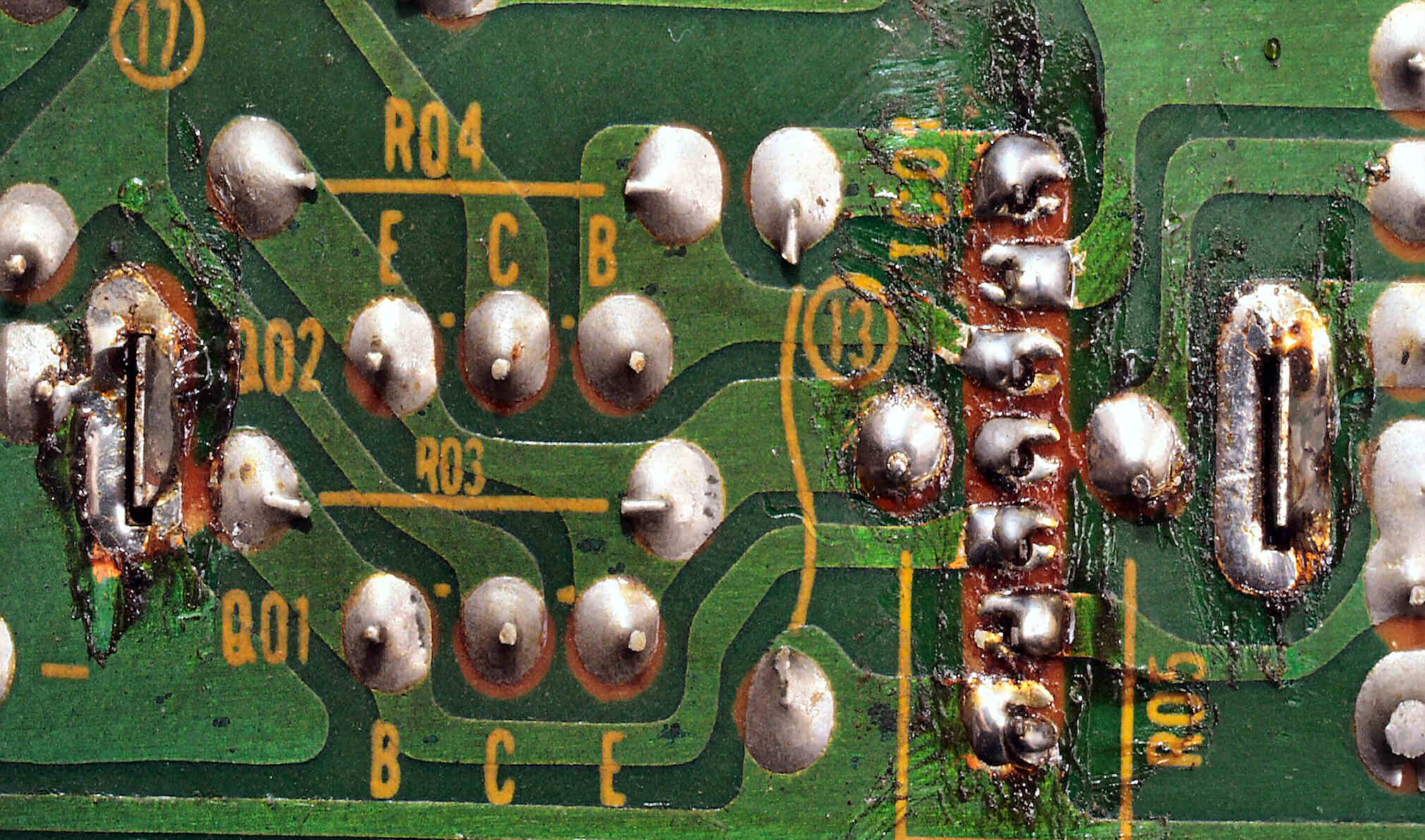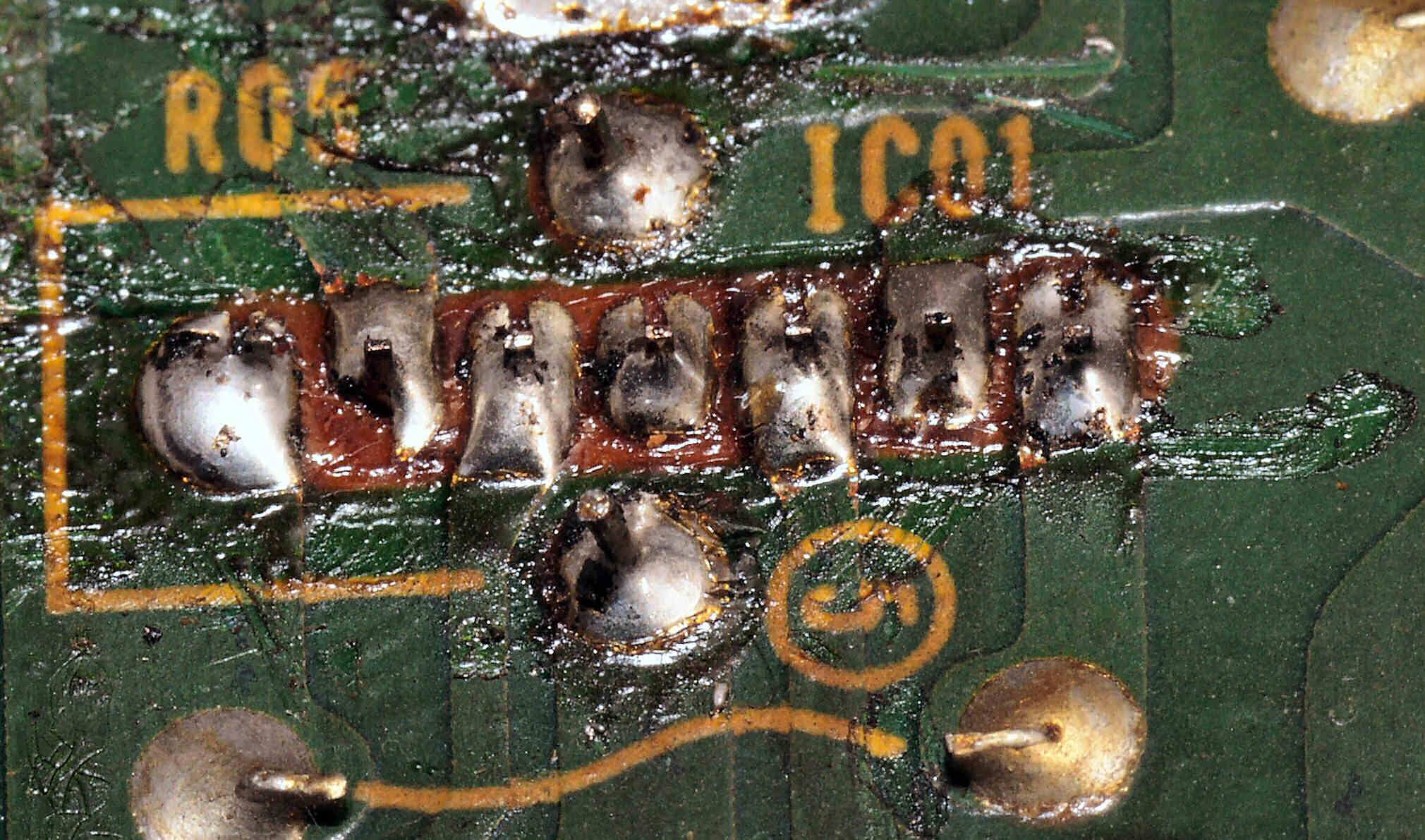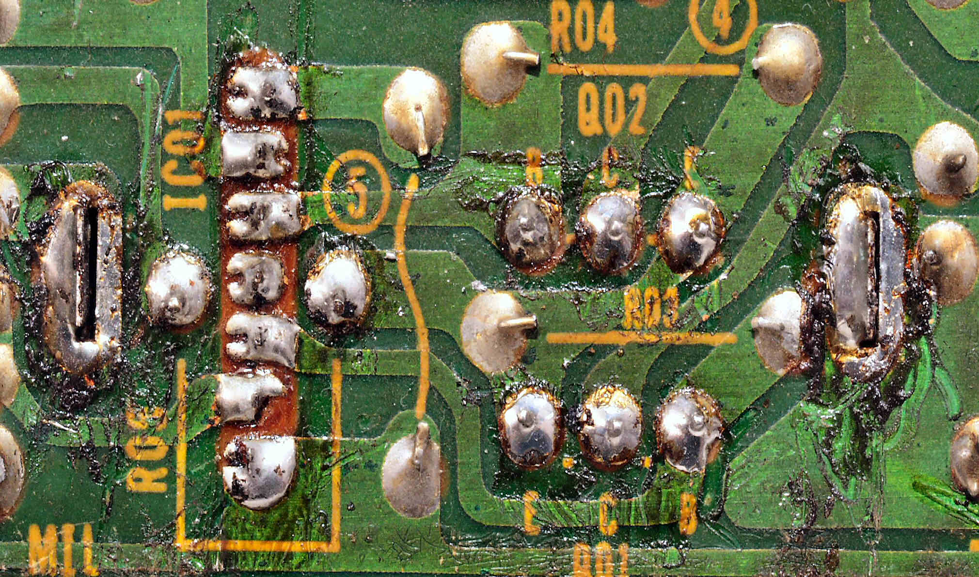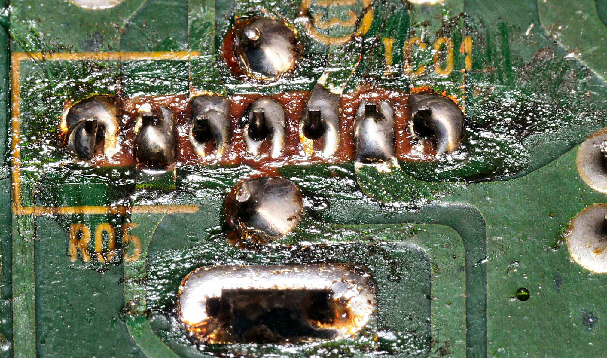 C2C2. 修理前 Rドライブ基板裏、前回の修理の半田が未熟の拡大。