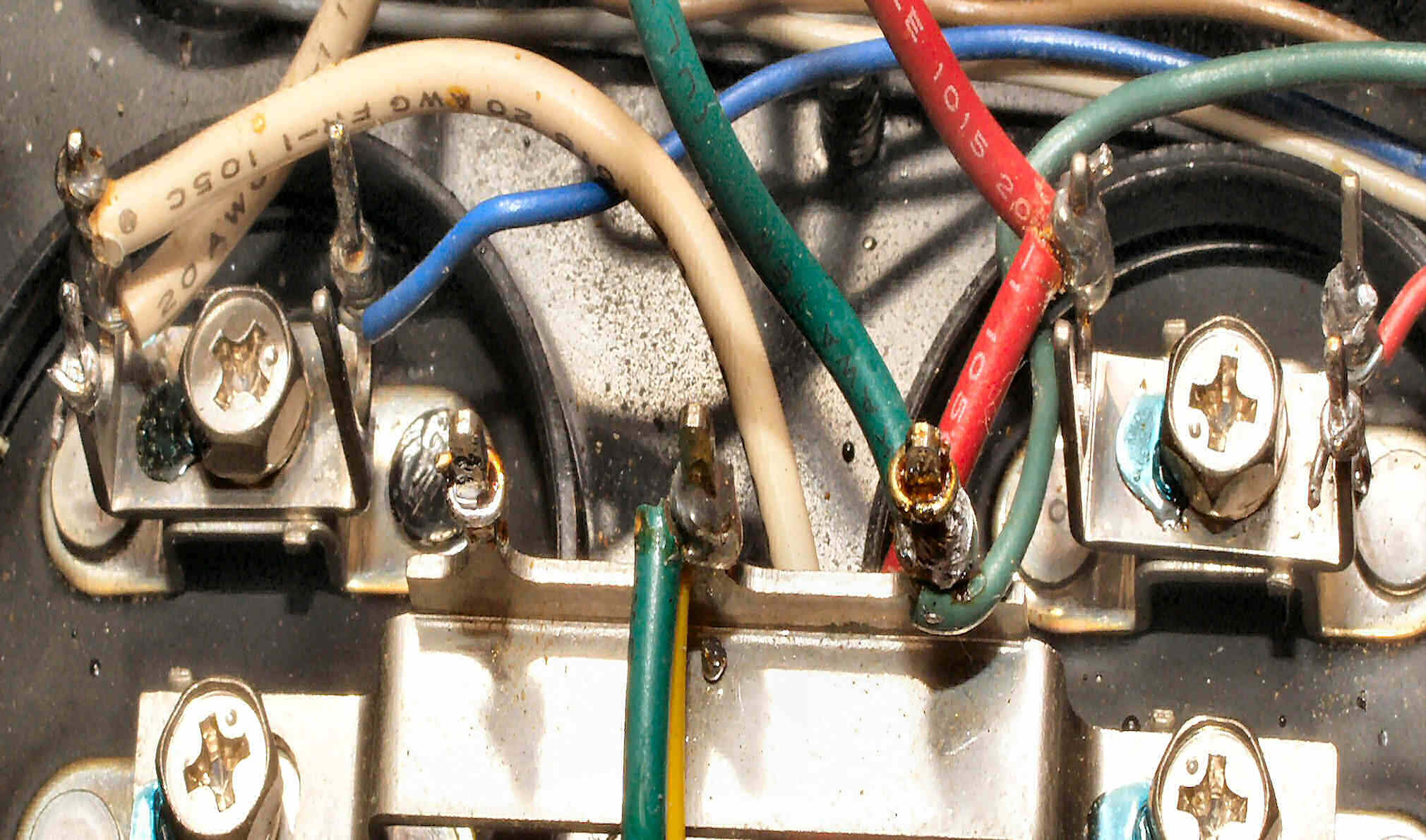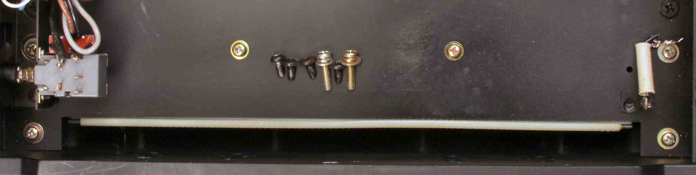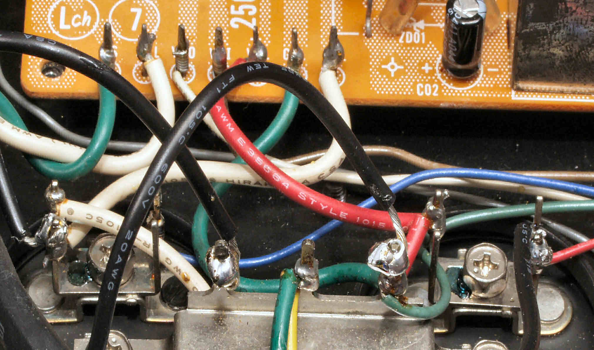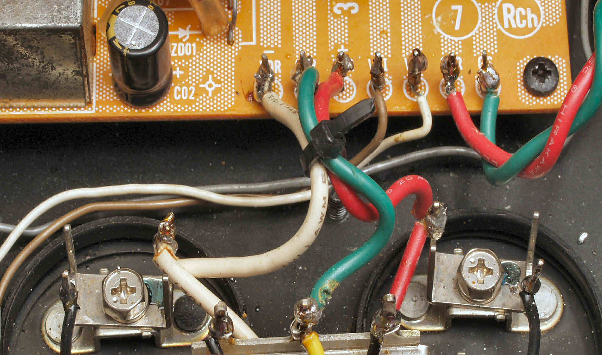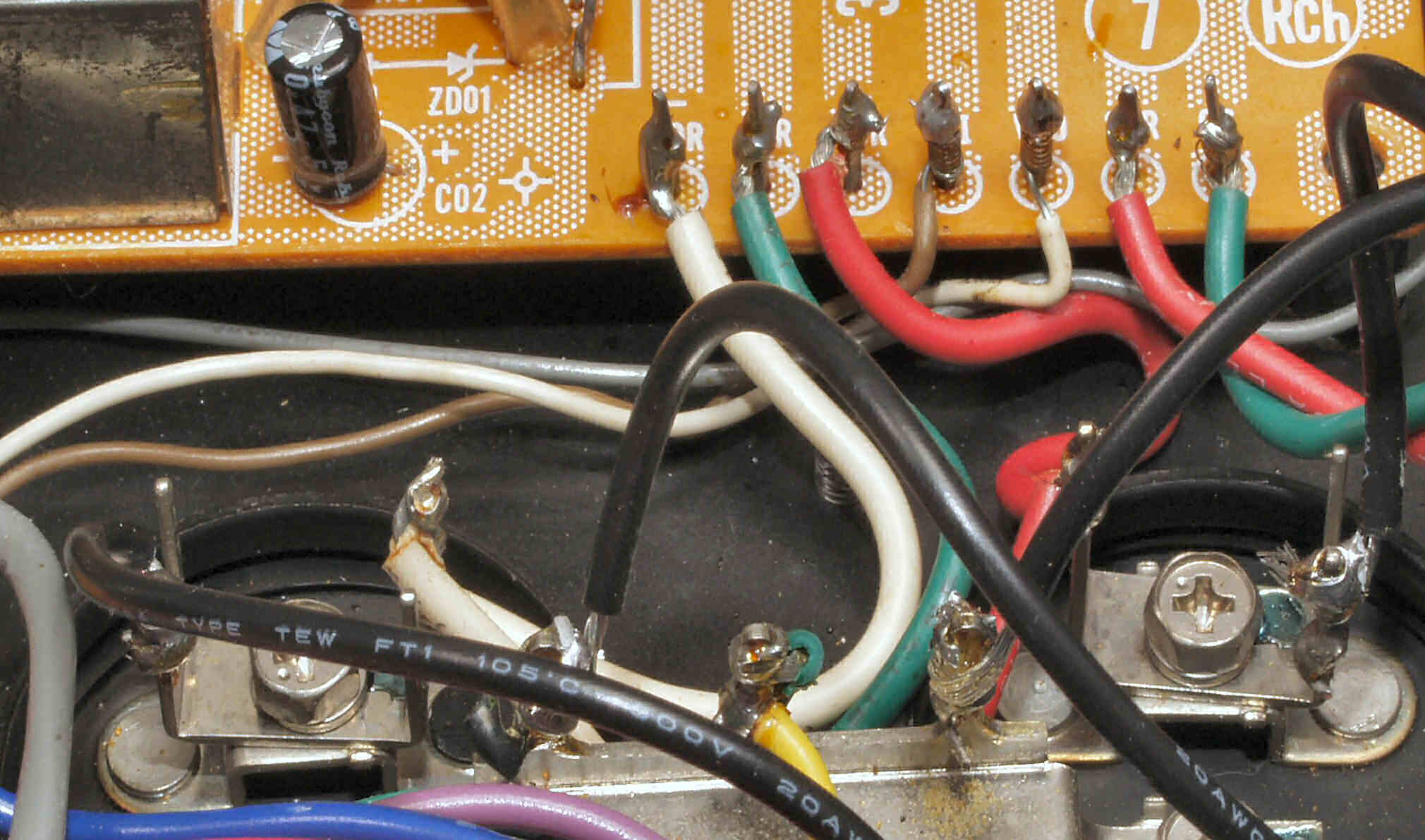 C6E. 修理中 L−SP接続端子穴加工・電源コード、端末の処理、アース線が有るのでシャシに接続する。