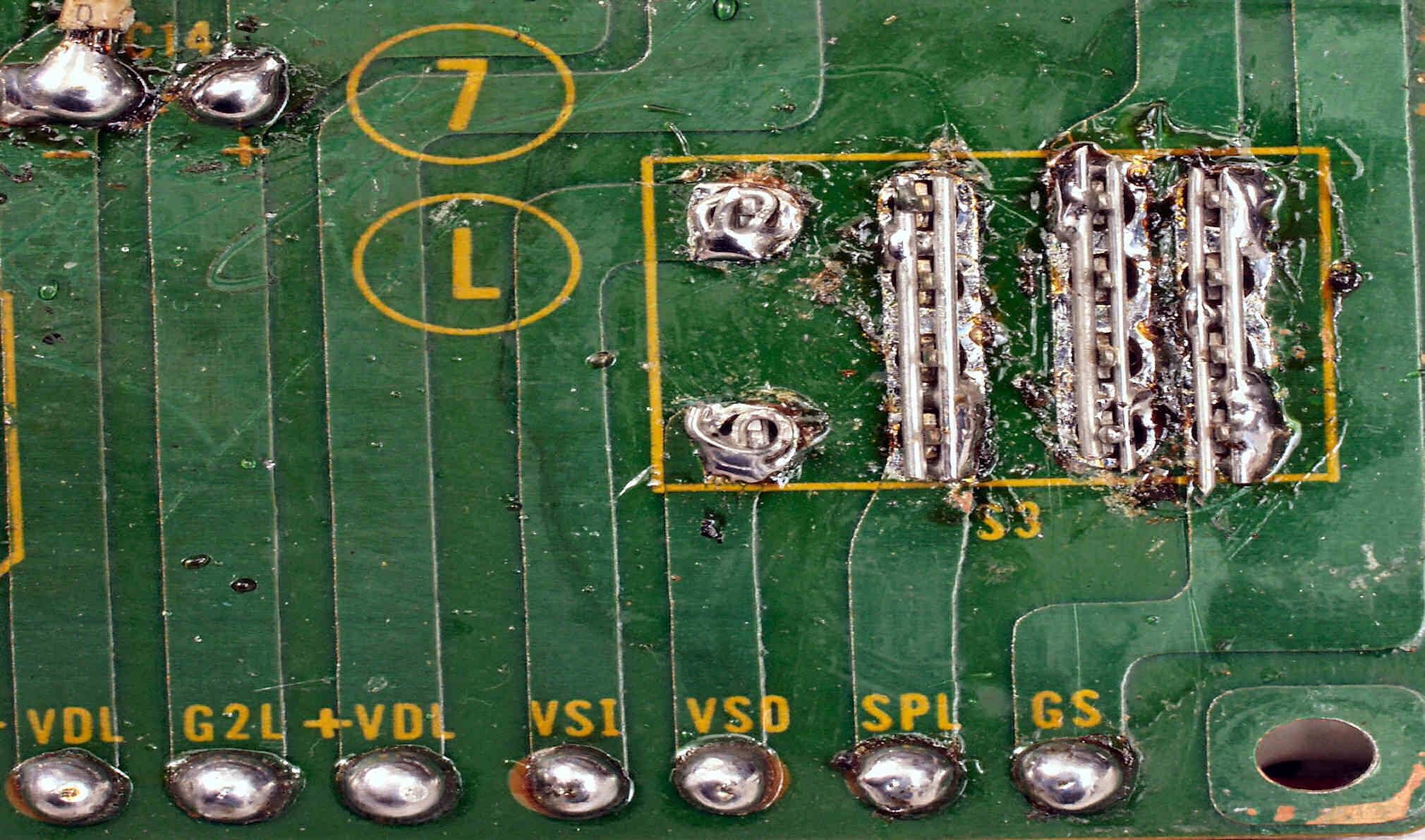 C2D. 修理(半田補正)後 Lドライブ基板裏  全ての半田をやり修す