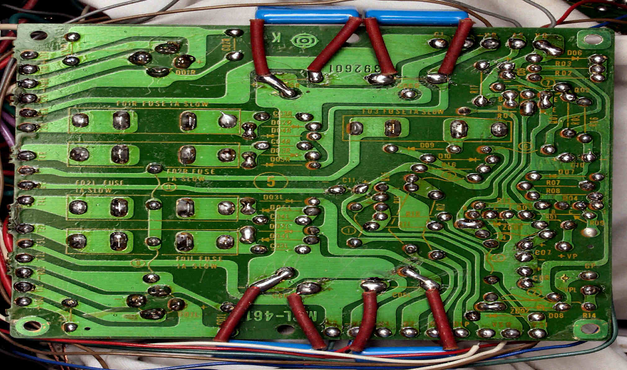 C4B. 修理後 電源基盤 電解コンデンサー9個、フューズ入り抵抗交換、フイルムコンデンサー4個追加