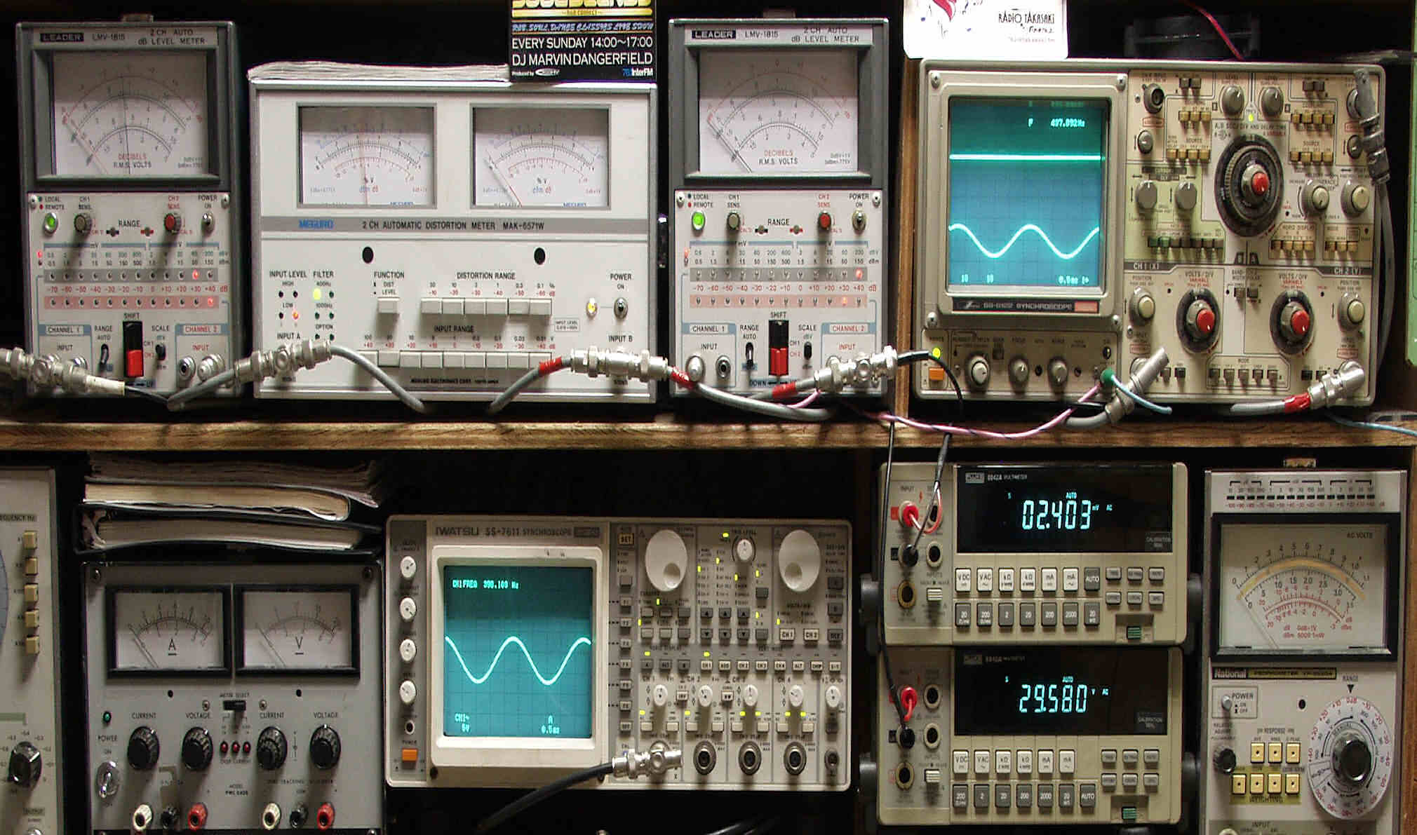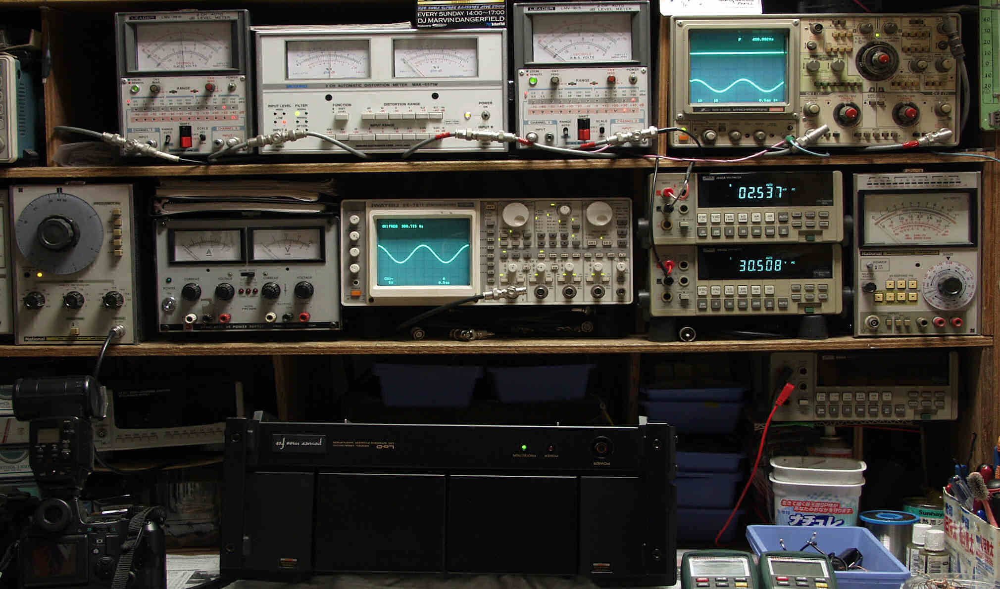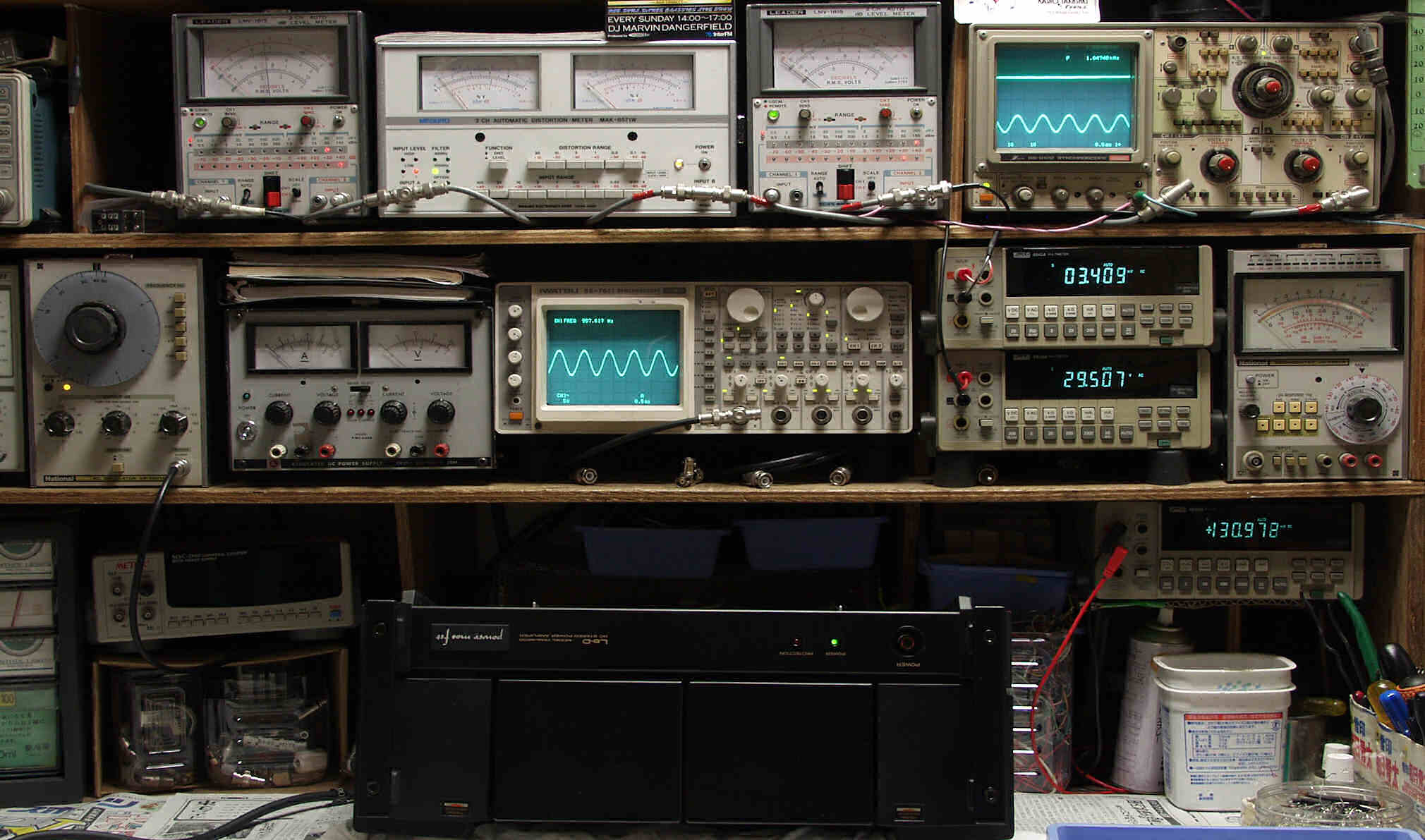 上段中左 歪み率計=出力の歪み率測定 左メータ=L出力、右メータ=R出力