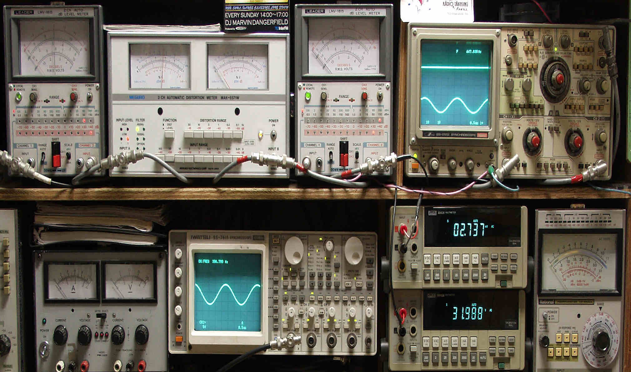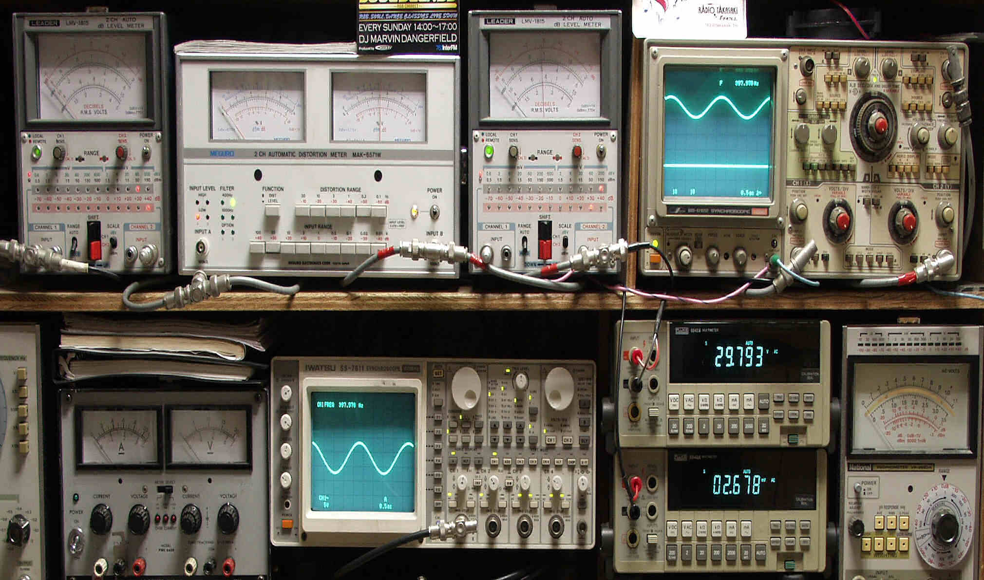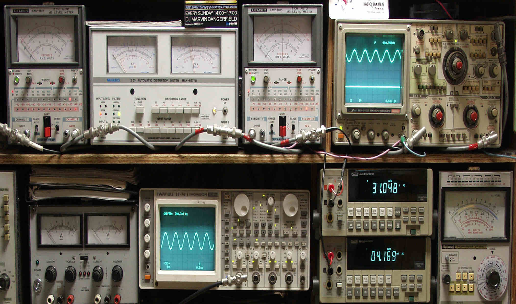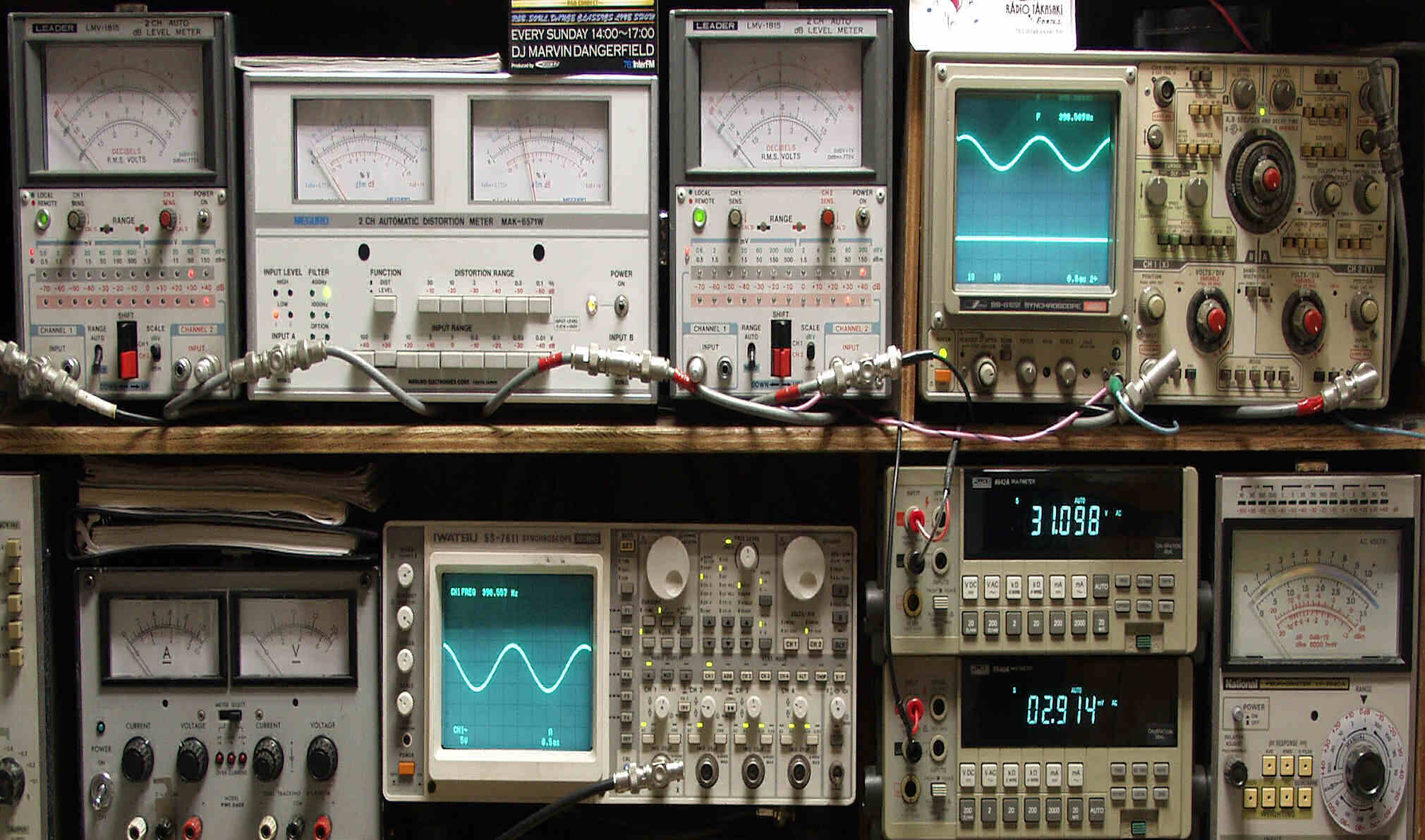 上段中左 歪み率計=出力の歪み率測定 左メータ=L出力、右メータ=R出力