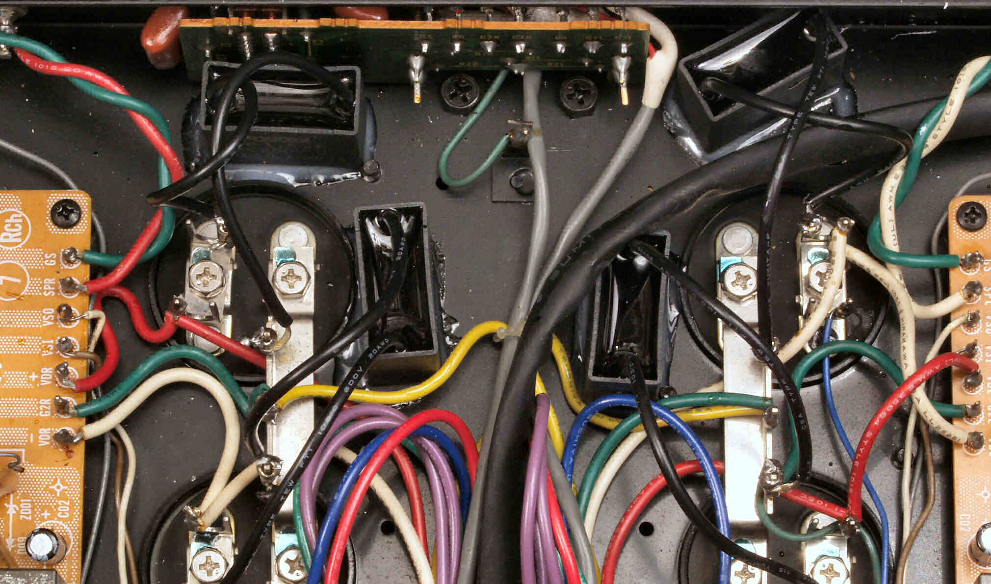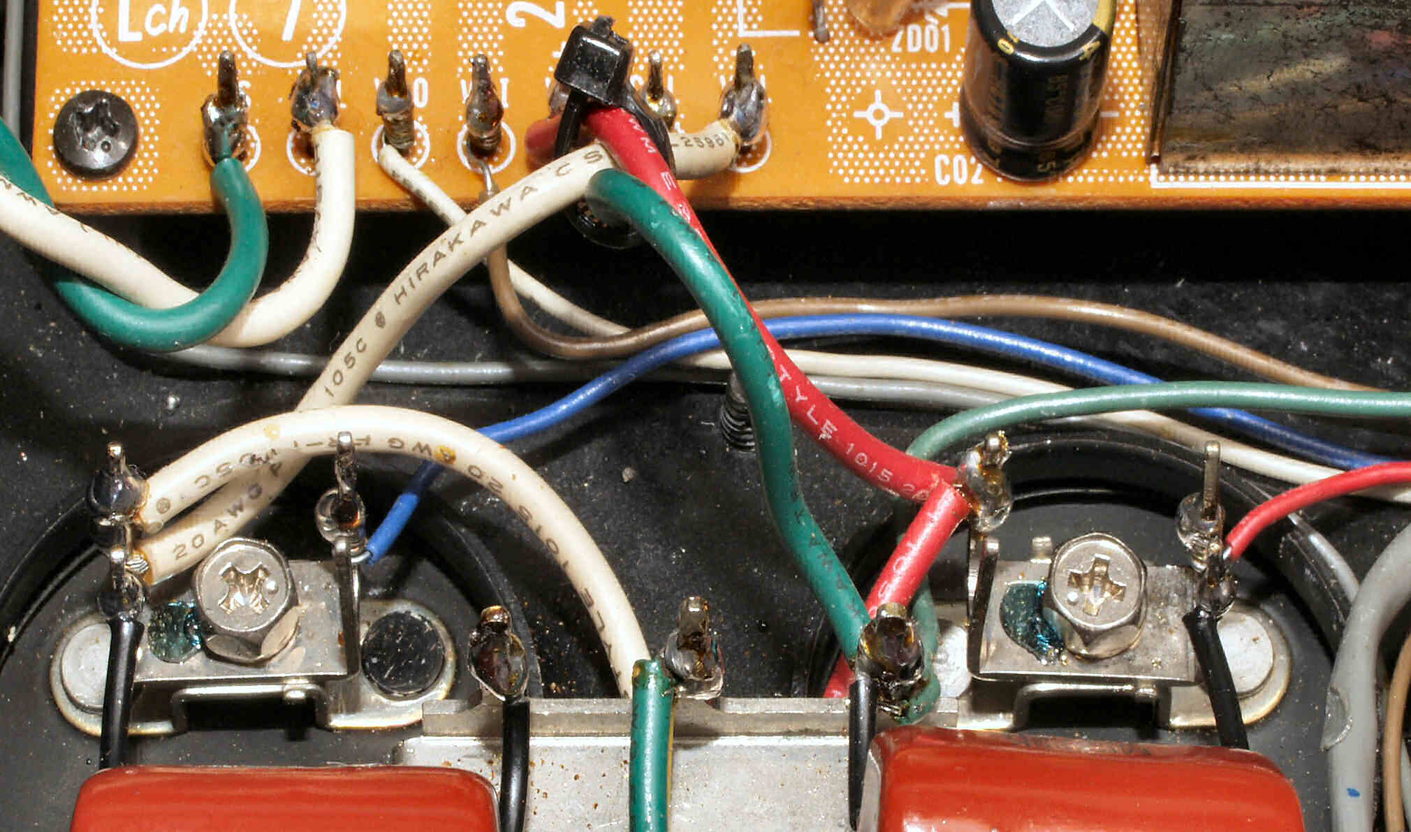 C9D. 修理中 R側終段電源パスコンの交換、リード線は端子に巻き付ける、さらに上から半田で固定する。