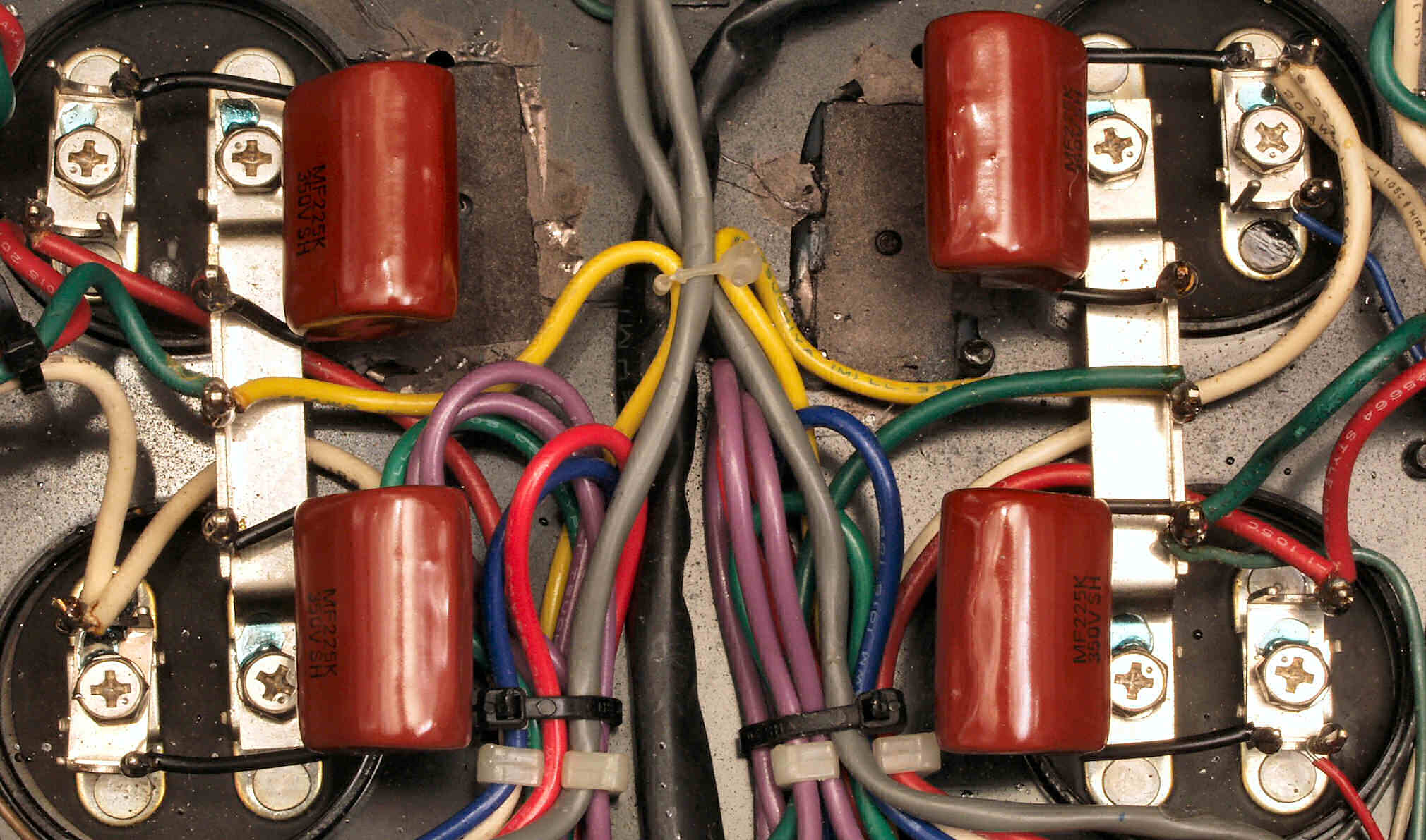 C5E. 修理(半田補正)中 修理後 入力RCA端子基盤裏、 フイルムコンデンサー2個交換、2個追加