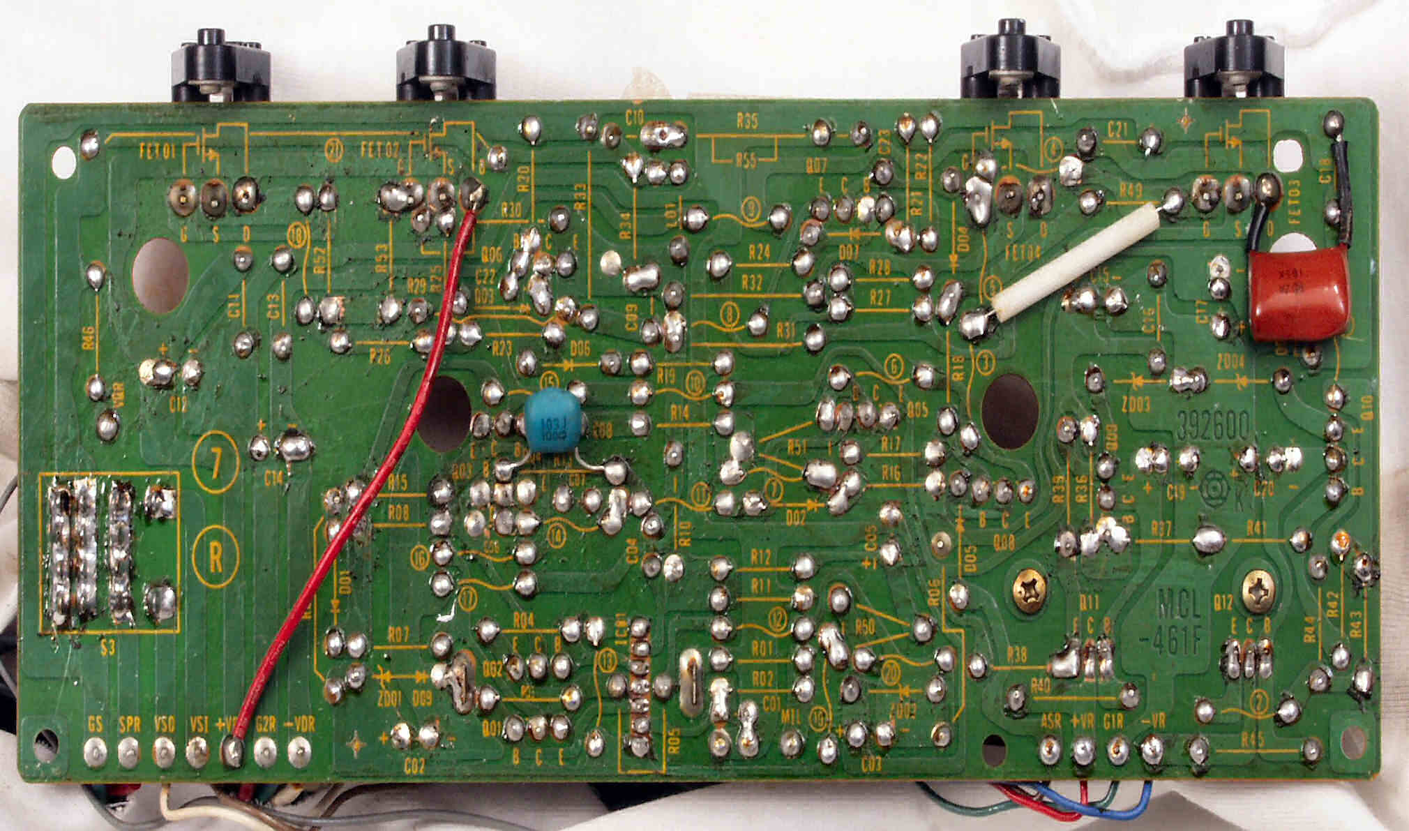 C1C1. 修理前 Rドライブ基板裏、交換されたSP接続リレー、基板用が入手難名為、汎用を取り付ける為、基板加工してある。