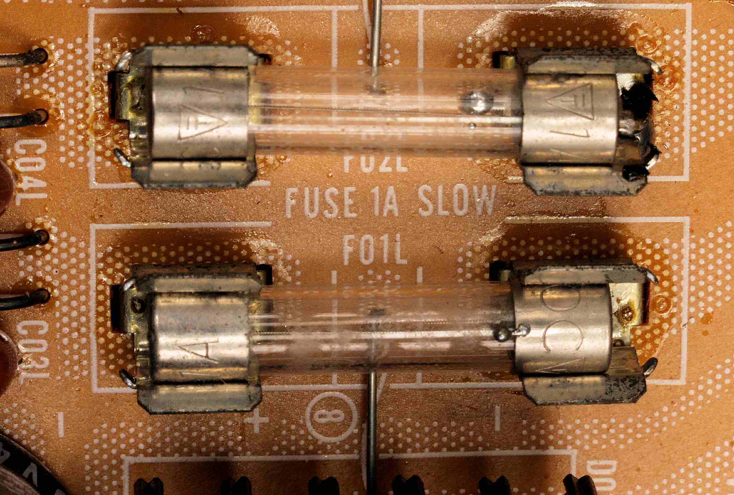 | A72. 点検中 上=フューズの中に半田球、下=フューズの電極に半田屑。 |