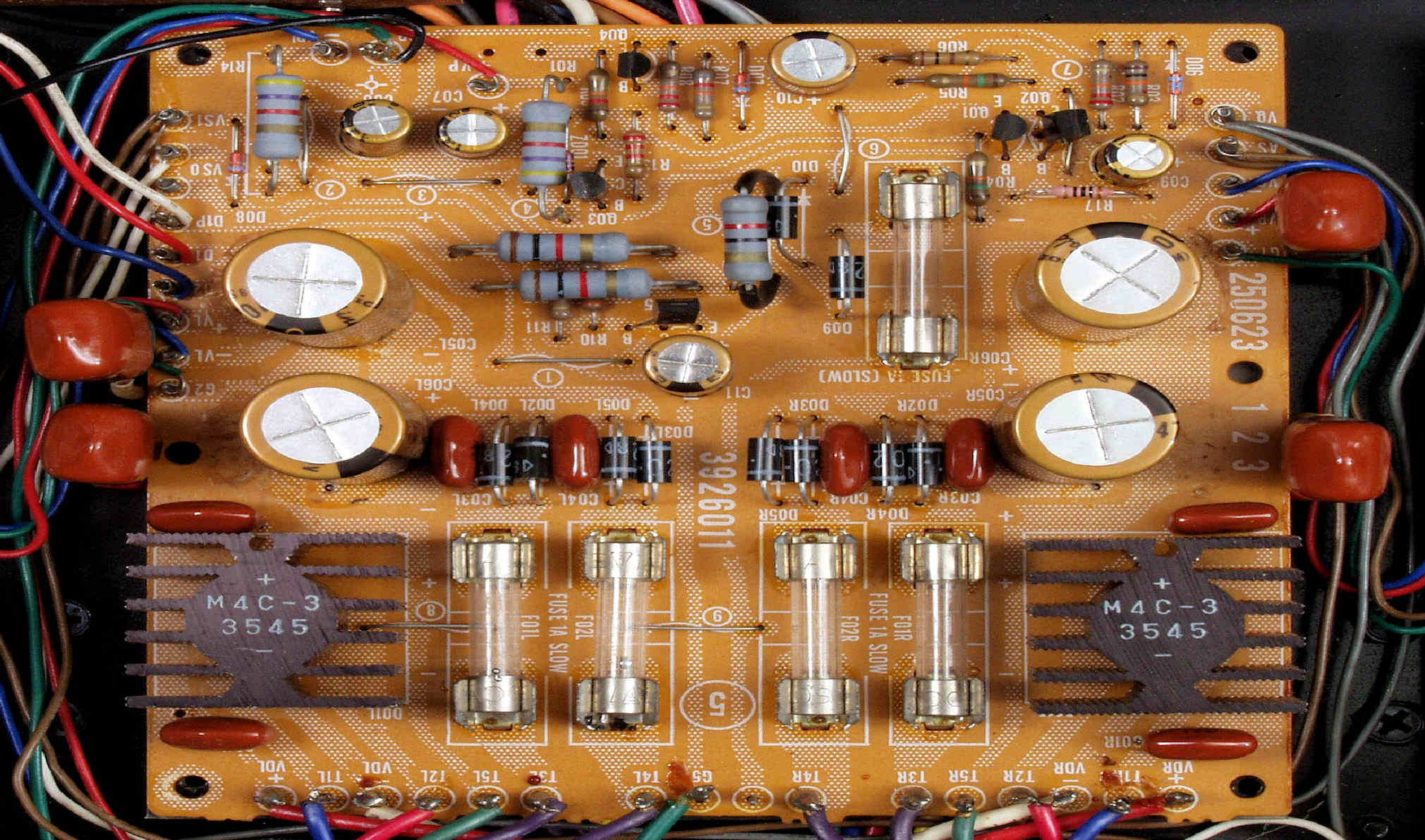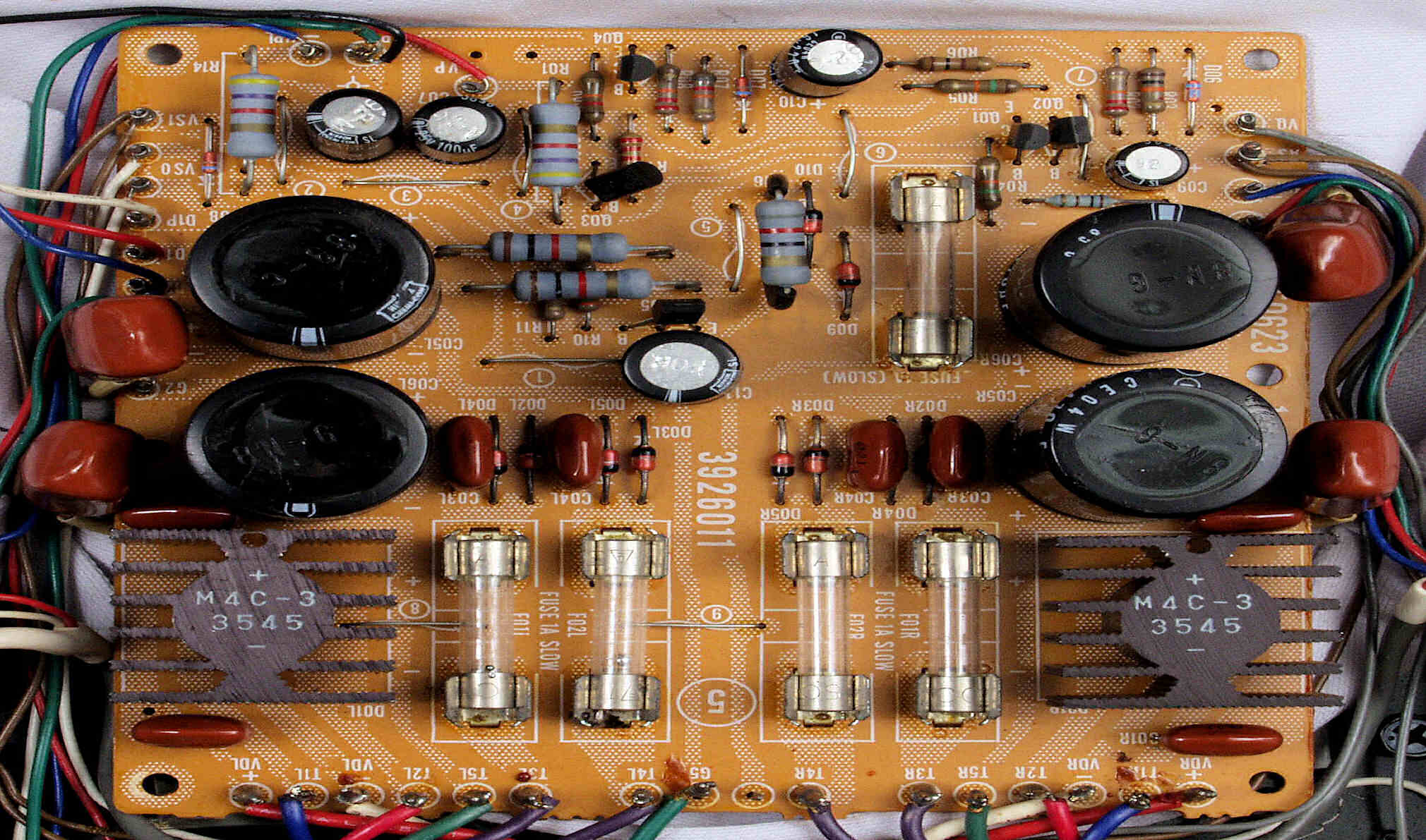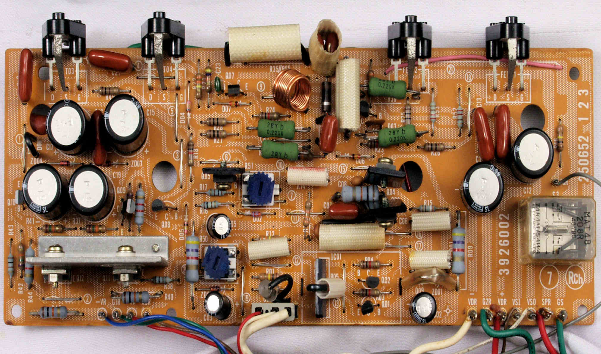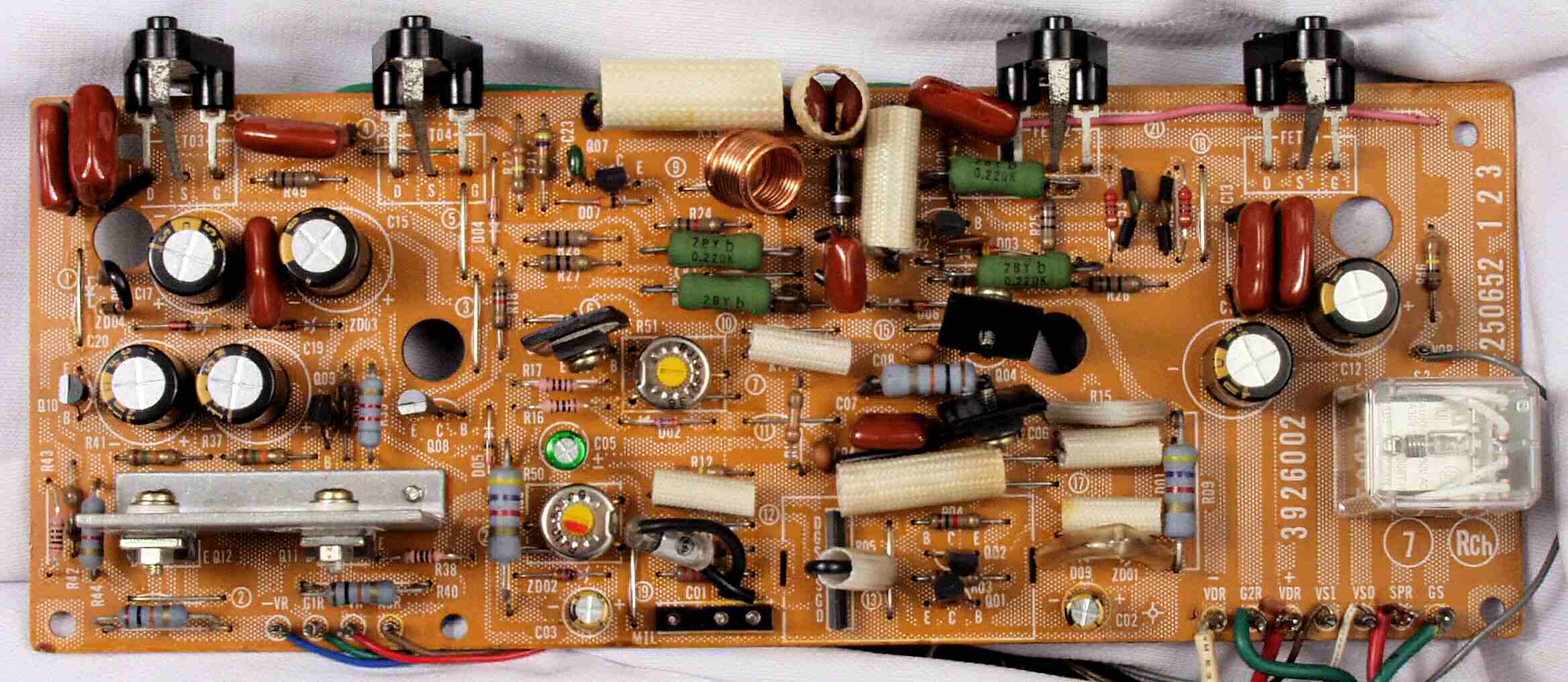 | C12. 修理後 R側ドライブ基板 初段FET(電界効果トランジスター)、バランス・バイアス調整用半固定VR3個、SP接続リレー交換 フューズ入り抵抗全部、電解コンデンサー11個、TR(トランジスター)2個交換 |