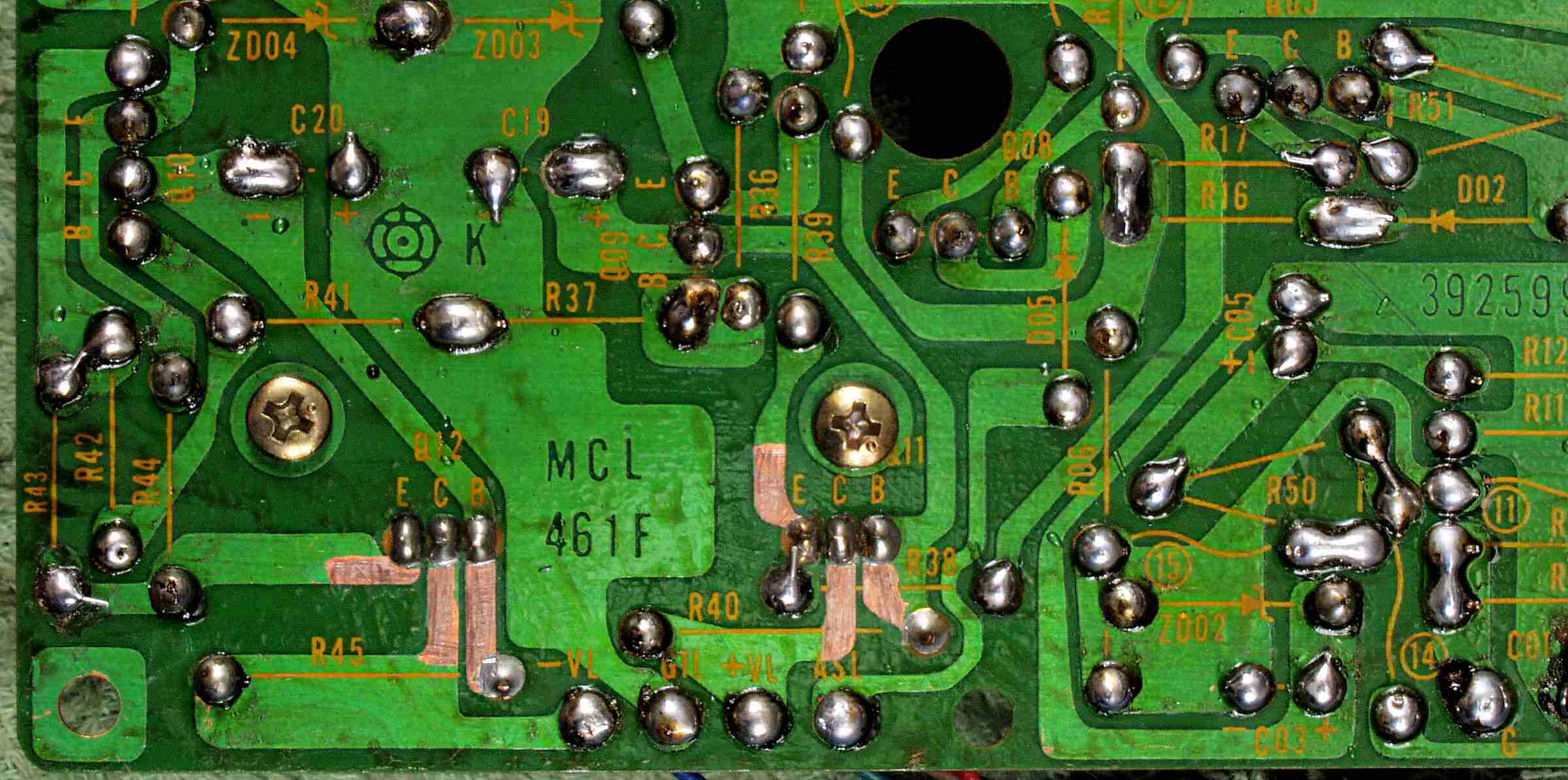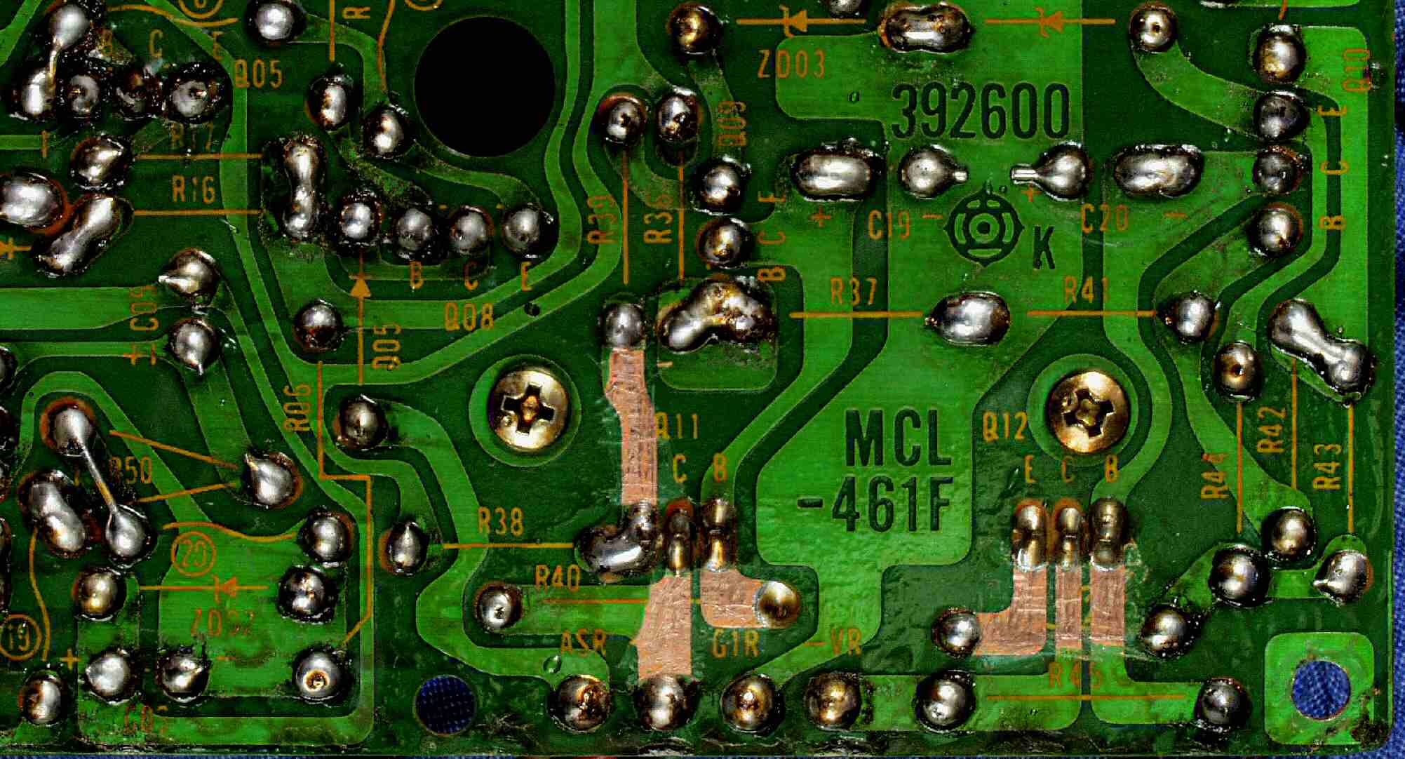 | C14. 修理(半田補正)後 R側ドライブ基板裏 半田を全部やり直す。 普通はこれで完成。 |
