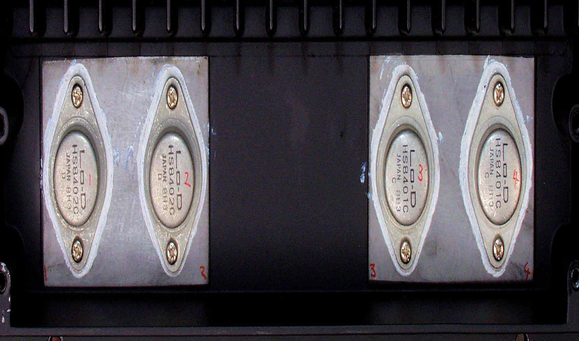 | A62. 点検中 L側終段FET(電界効果トランジスター)の絶縁マイカーの穴は小さい、シリコングリスも湿気有り。 熱伝導の良い「シリコン製絶縁シート」は比誘電率が、シリコーンオイル=2.60〜2.75、雲母=5〜8と、 2倍の開きがあり、高域特性に影響が出るので、現在は未採用。 |