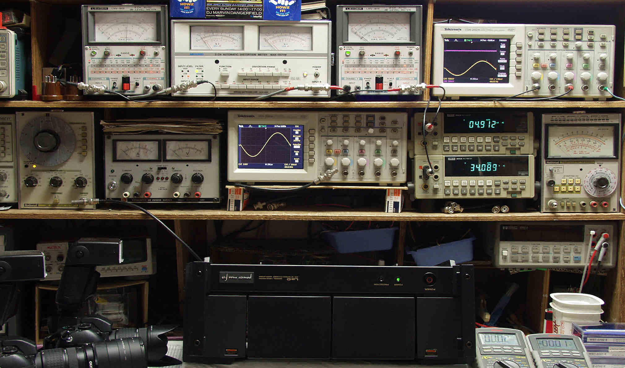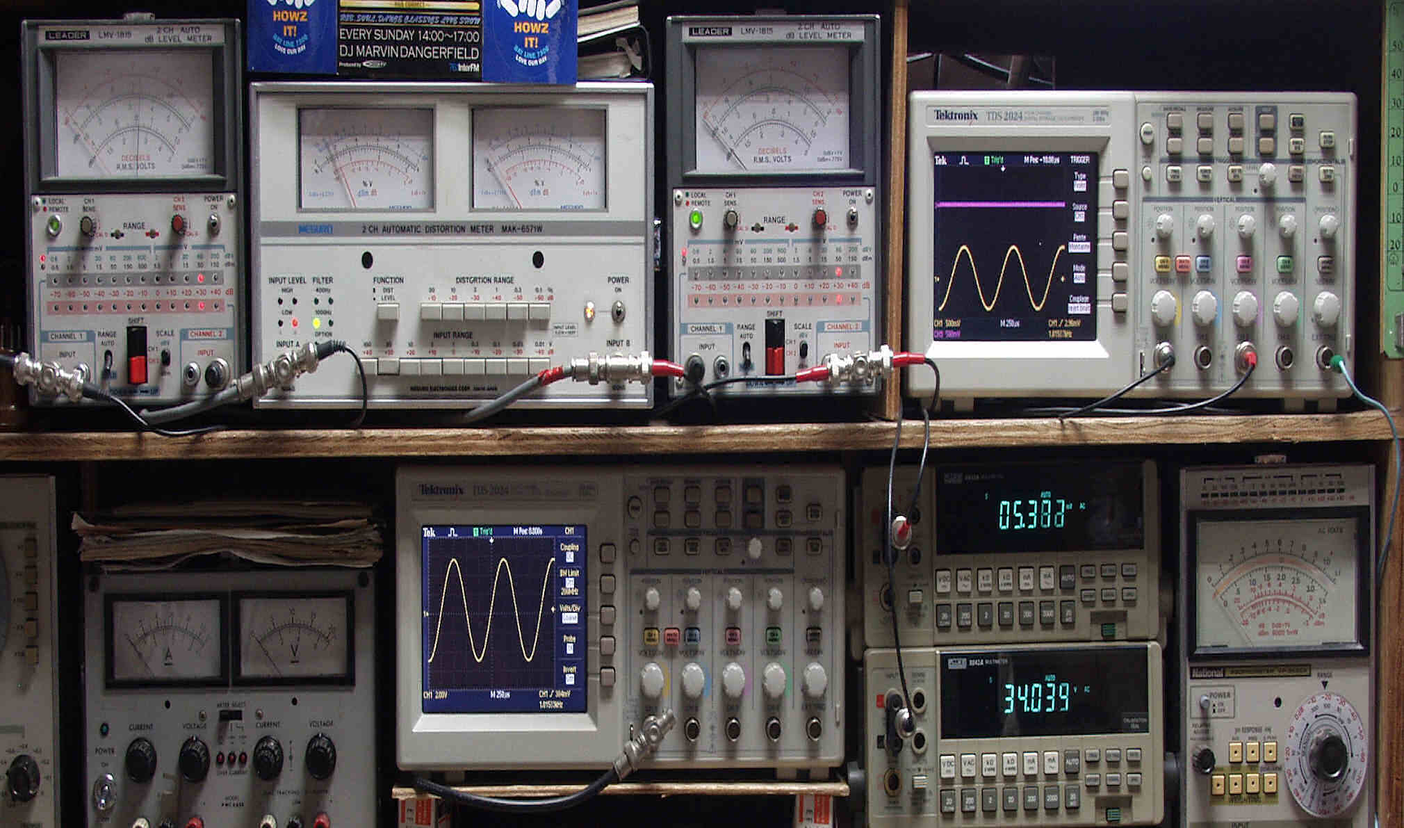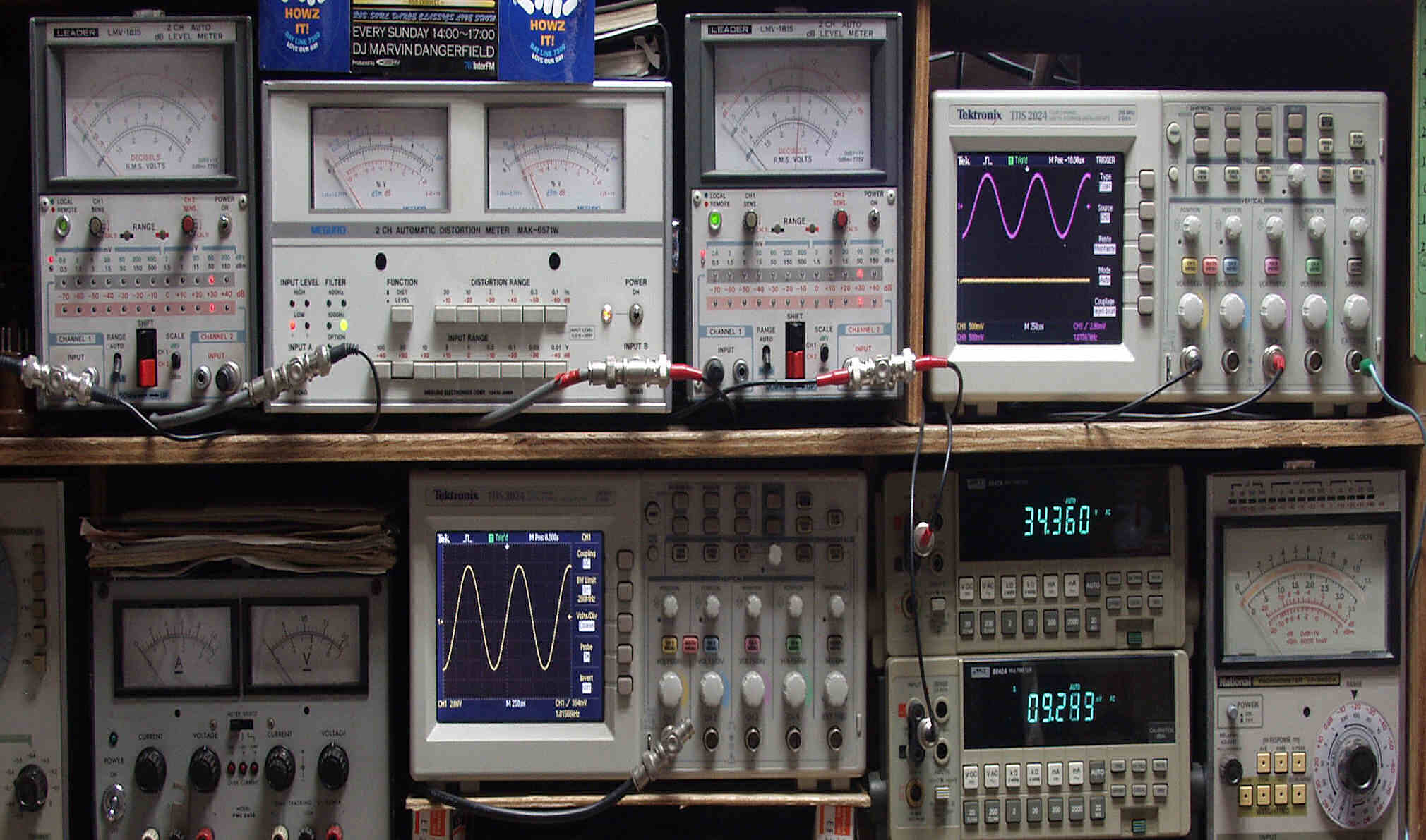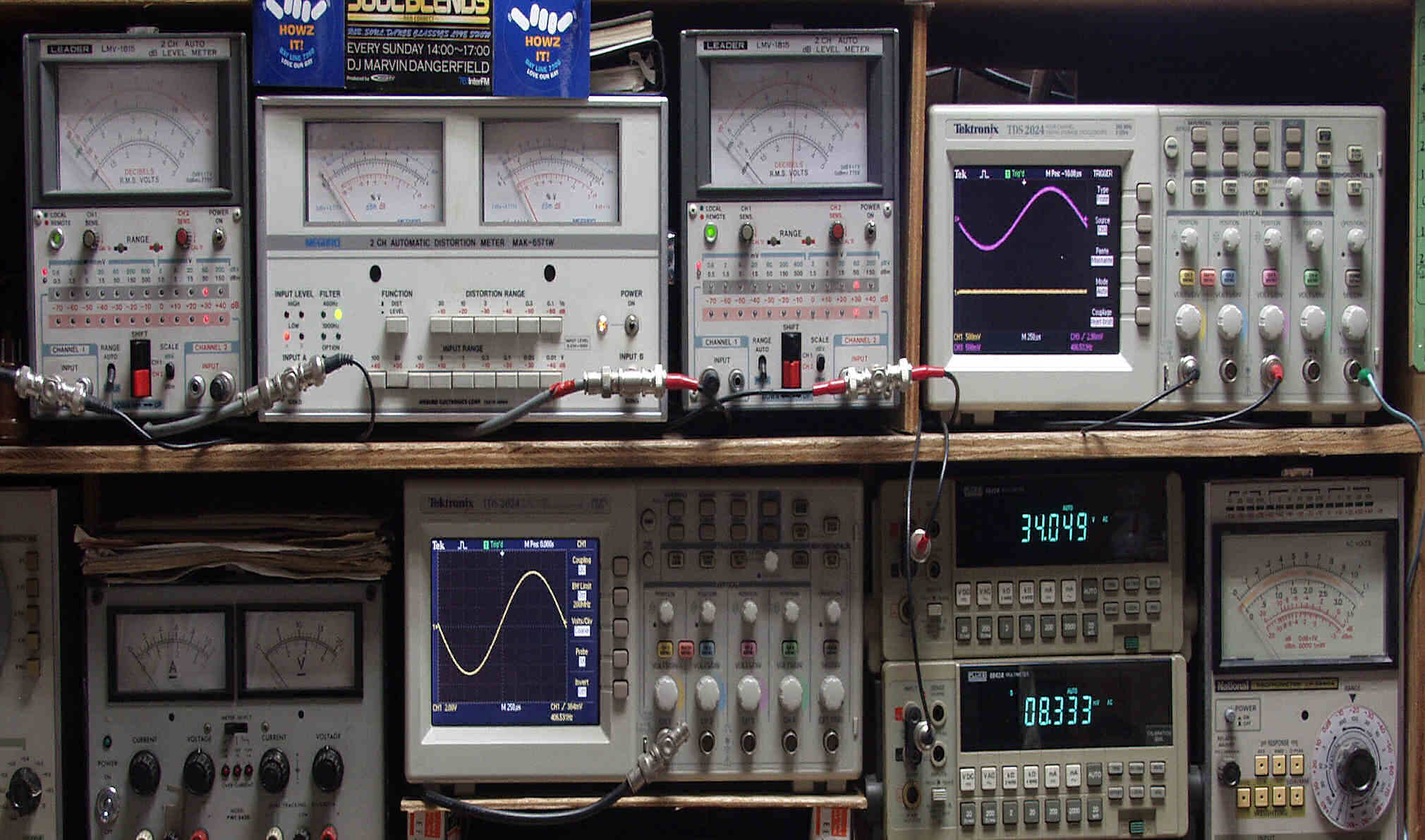 | E. 調整・測定 E1. 出力・歪み率測定・調整 <見方> 下段左端 オーディオ発振器より400HZ・1KHZの信号を出し(歪み率=約0.003%)これをAMPに入力し、出力を測定 下段中左 オシロ=入力波形(オーディオ発振器のTTLレベル) 下段中右上=周波数計 上段左端 電圧計=L側出力電圧測定、黒針のみ使用 上段中左 歪み率計=出力の歪み率測定 左メータ=L出力、右メータ=R出力 上段中右 電圧計=R側出力電圧測定、赤針のみ使用 上段右端 オシロ=出力波形 上=R出力、下=L出力(実際にはRL電圧計の出力「Max1V」を観測) 下段中右上 デジタル電圧計=R出力電圧測定 下段中右下 デジタル電圧計=L出力電圧測定 |