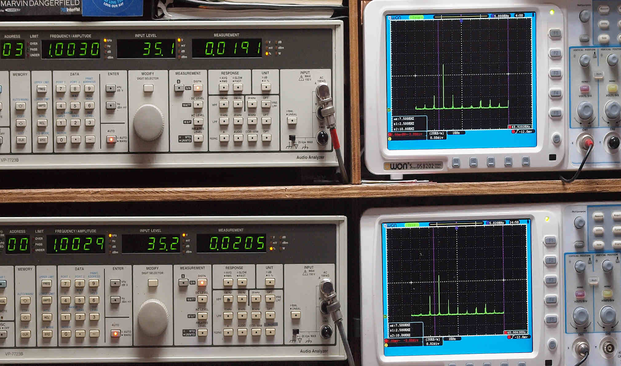 上段右端 VP−7723Bの基本波除去出力を「owon SDS8202(200MHZ)」で「FFT分析」表示。