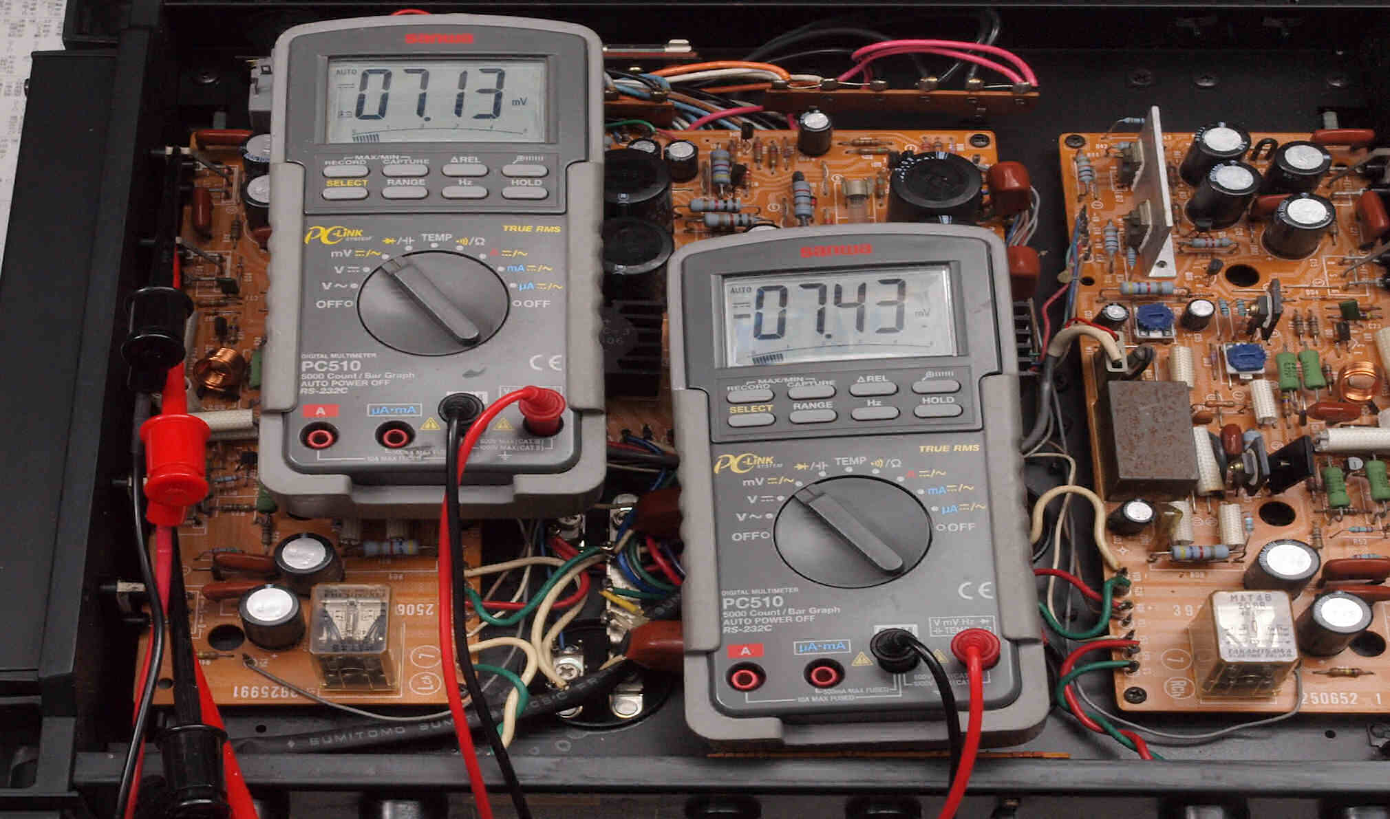 T4. 左側終段FET(電界効果トランジスター)のバラツキ測定。+−側とも7mV以下、良くそろっています。
