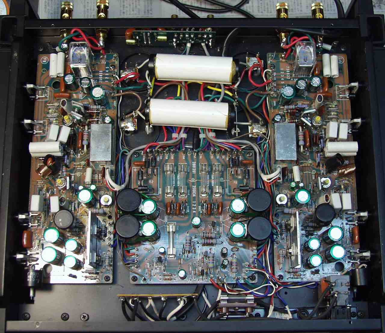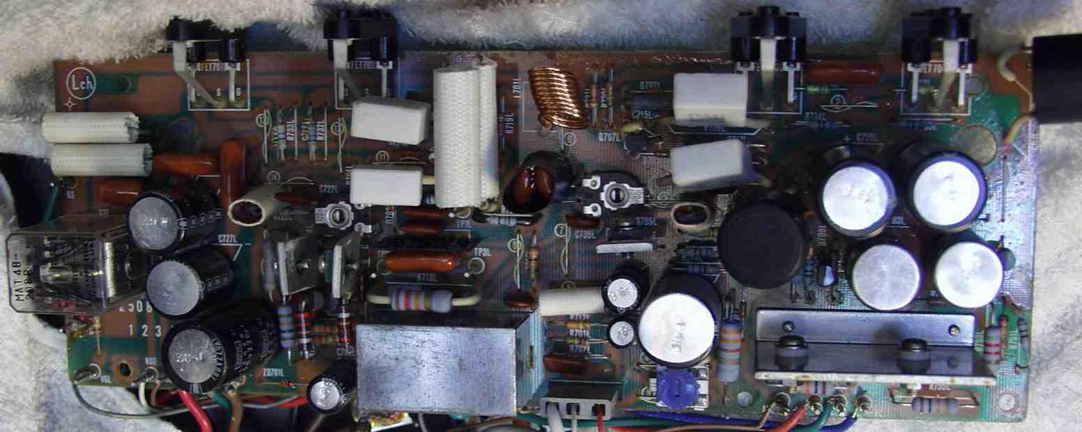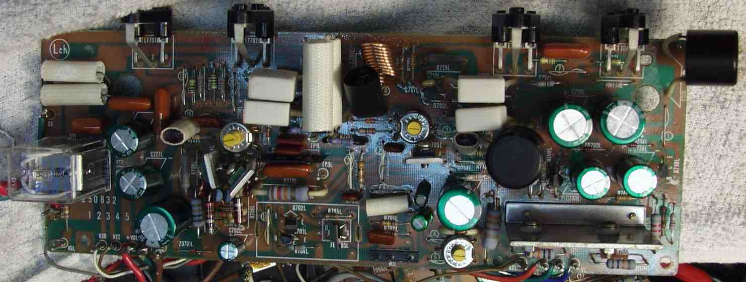 | C−2B. 修理後 Lドライブ基板 初段FET、バランス/バイアス調整用半固定VR、SP接続リレー交換 フューズ入り抵抗も全部交換 全電解コンデンサー交換 |
