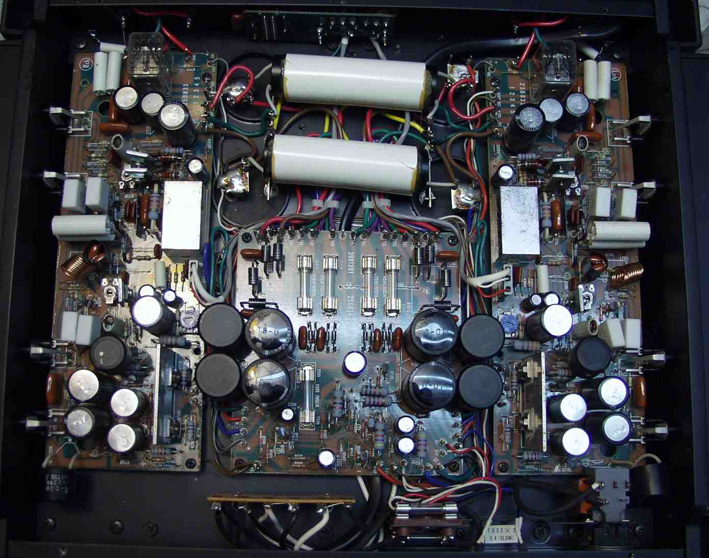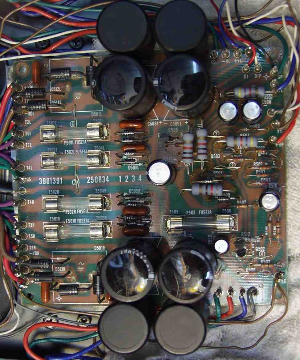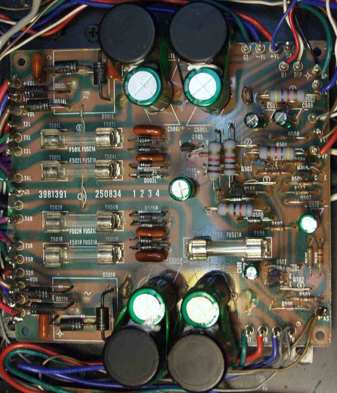 | C−2B. 修理後 Lドライブ基板 初段FET、バランス/バイアス調整用半固定VR、SP接続リレー交換 フューズ入り抵抗も全部交換 全電解コンデンサー交換 |