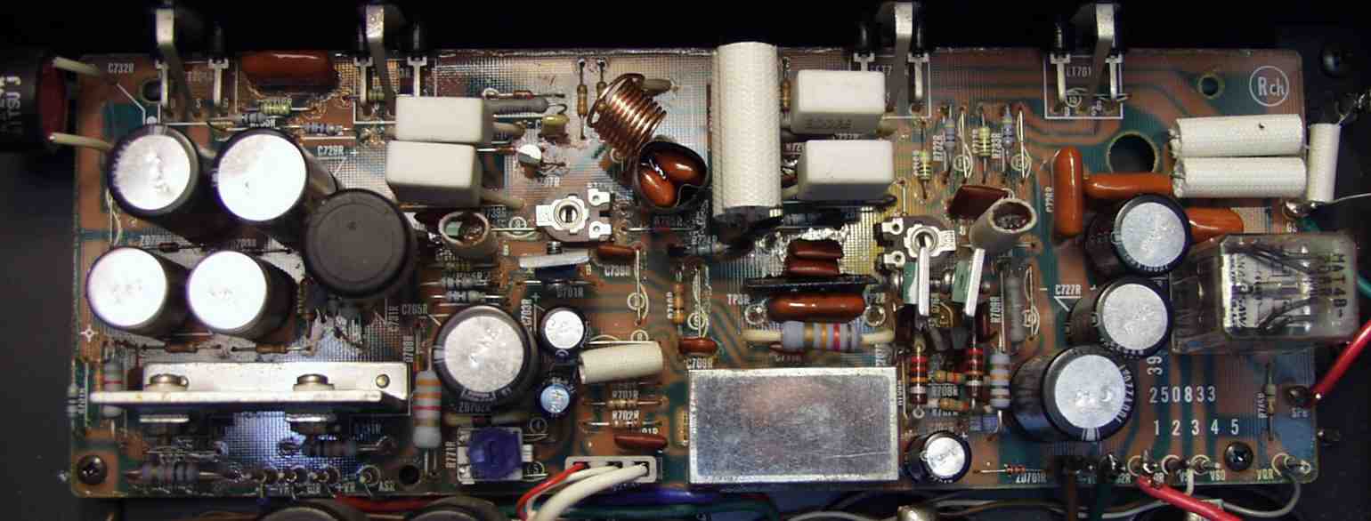 | C−1B. 修理後 Rドライブ基板 初段FET、バランス/バイアス調整用半固定VR、SP接続リレー交換 フューズ入り抵抗も全部交換 全電解コンデンサー交換 |