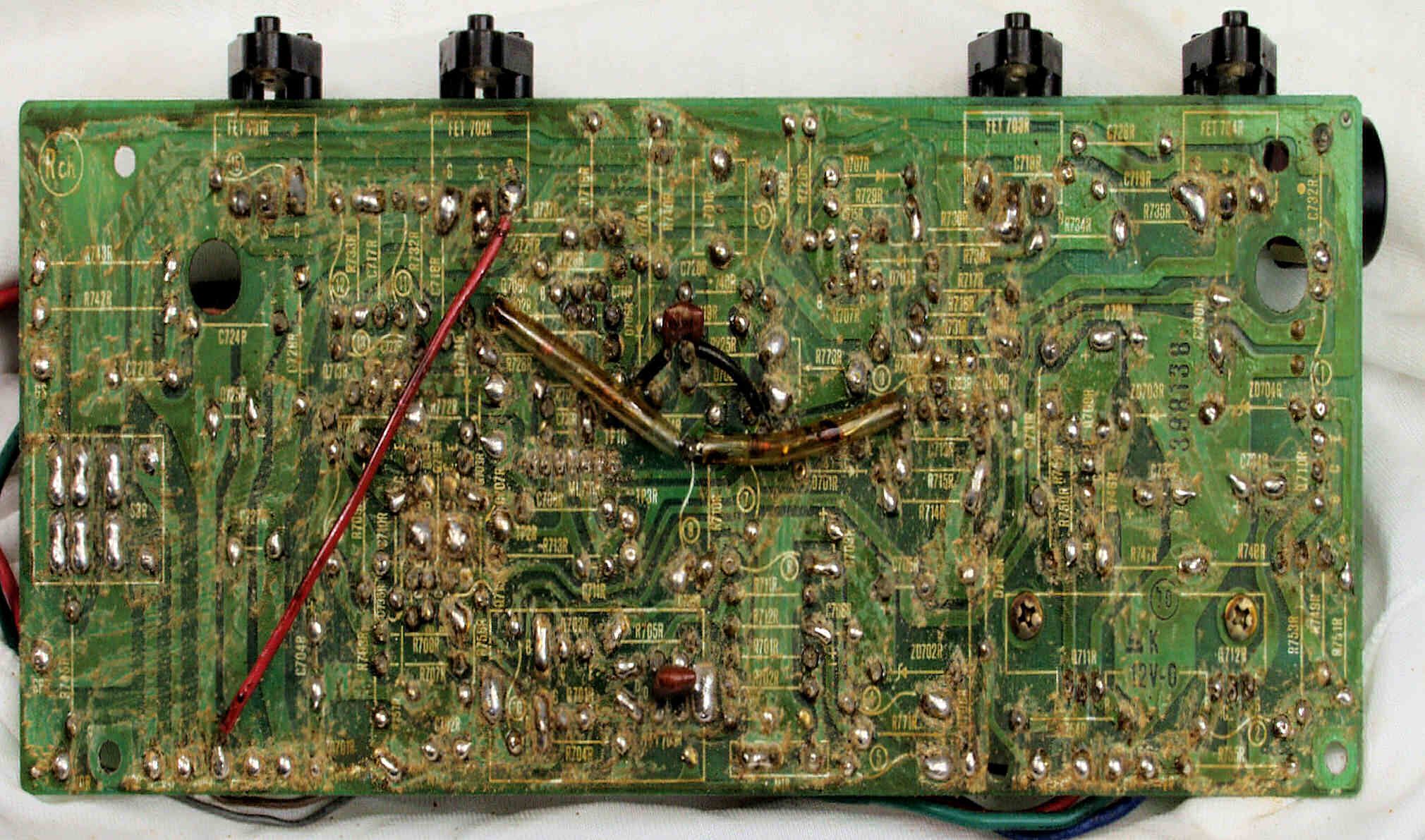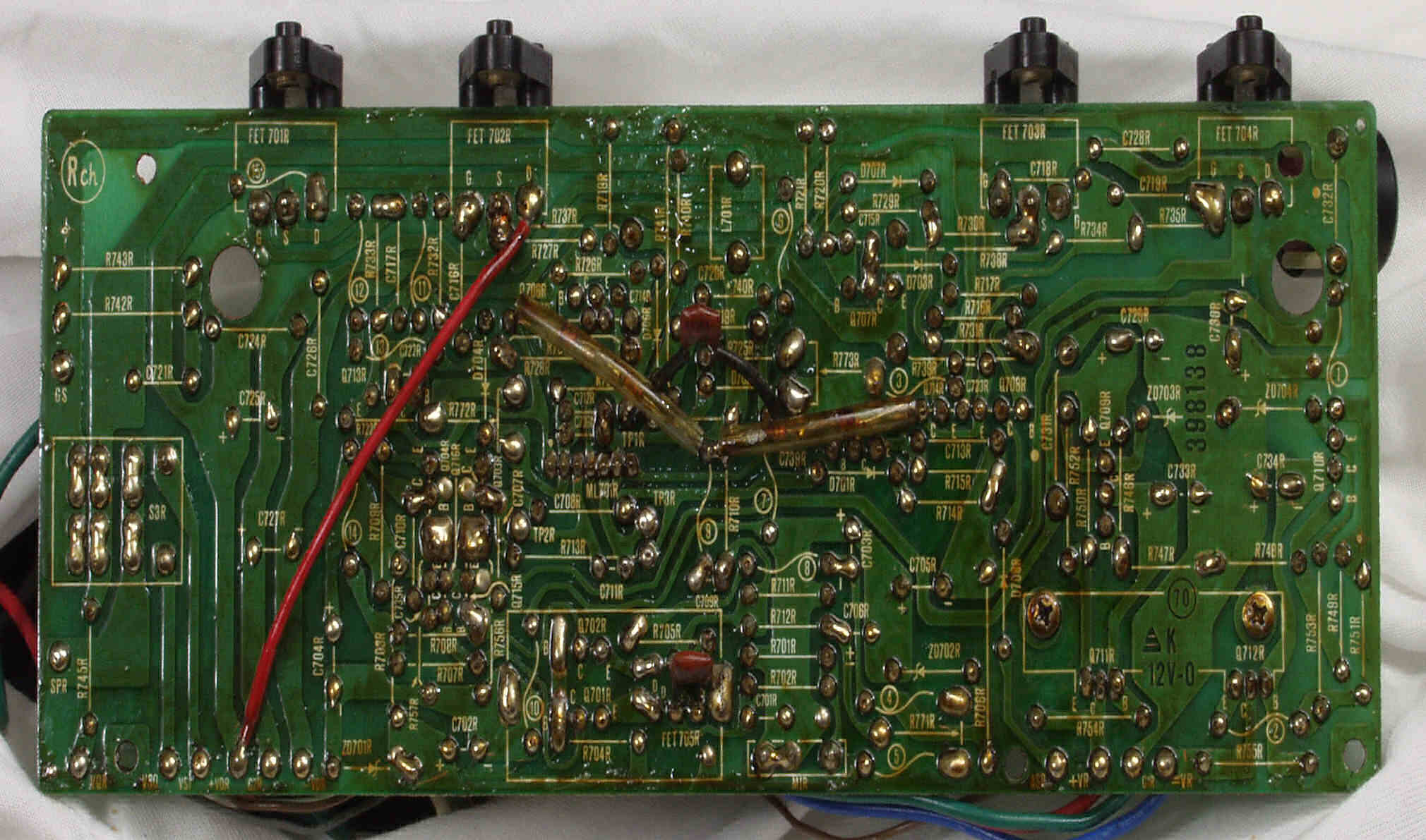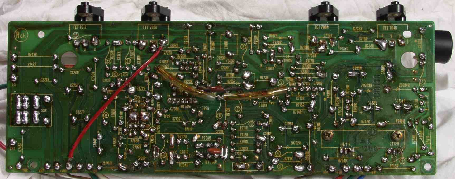 | C2E. 修理中 R側ドライブ基板裏 不要なフラックスを落とす、 普通は掃除機で吸いながら行うので写真は撮らず。 |