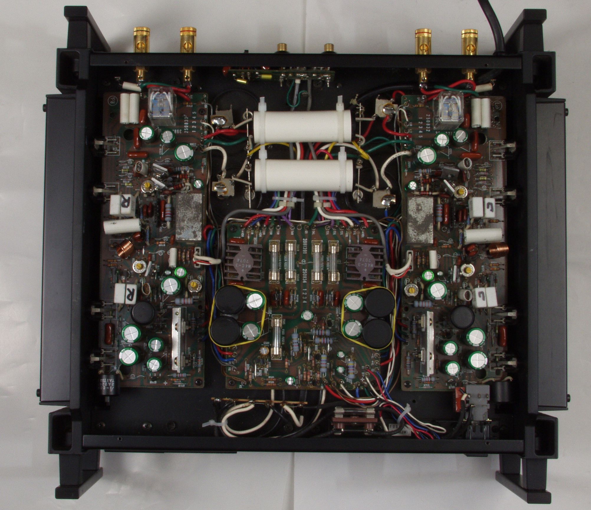 | A. 修理前の状況 A1. 修理前 下から見る、非常に綺麗です。 AMP部の電解コンデンサーのビニールの後退も少ない。 依頼者コメント ”小生は転勤族でアンプは実家に置いてあり年に数回しか鳴らしていなかったので、使用時間はそれほどでもなかったのですが?” を裏付ける。 |